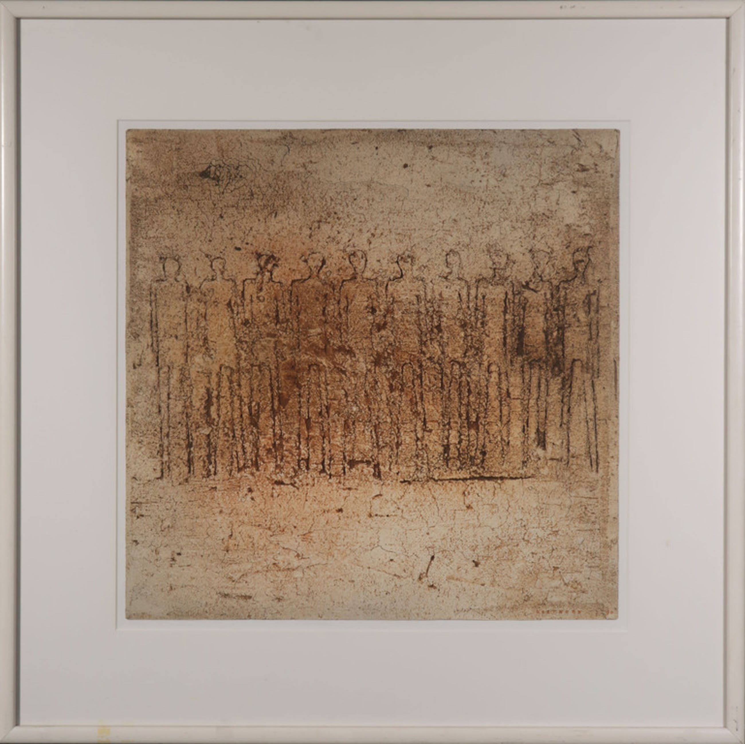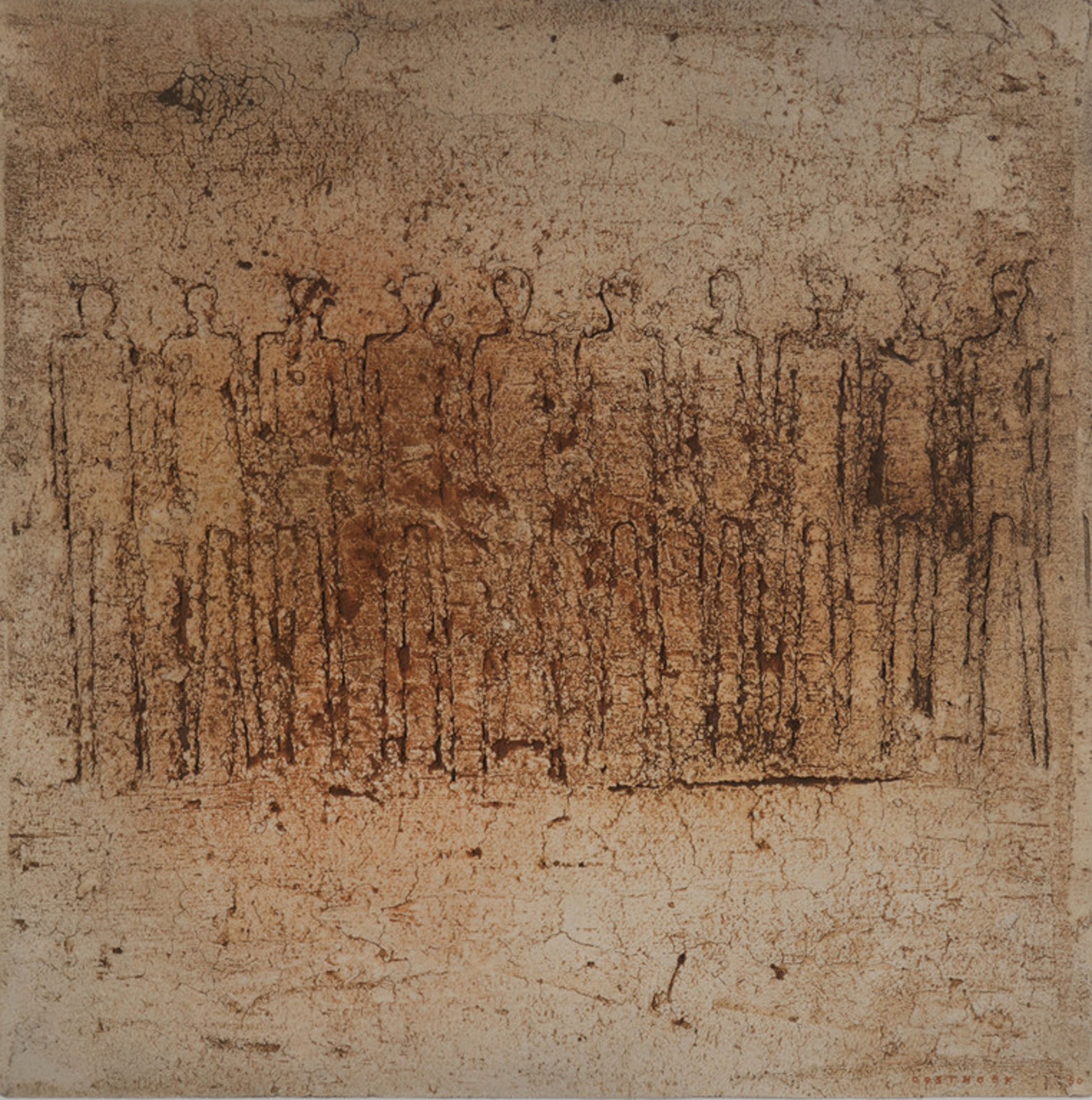 Materiaal: Gemengde techniek, o.a. Acryl en structuur (zand?) op papier
