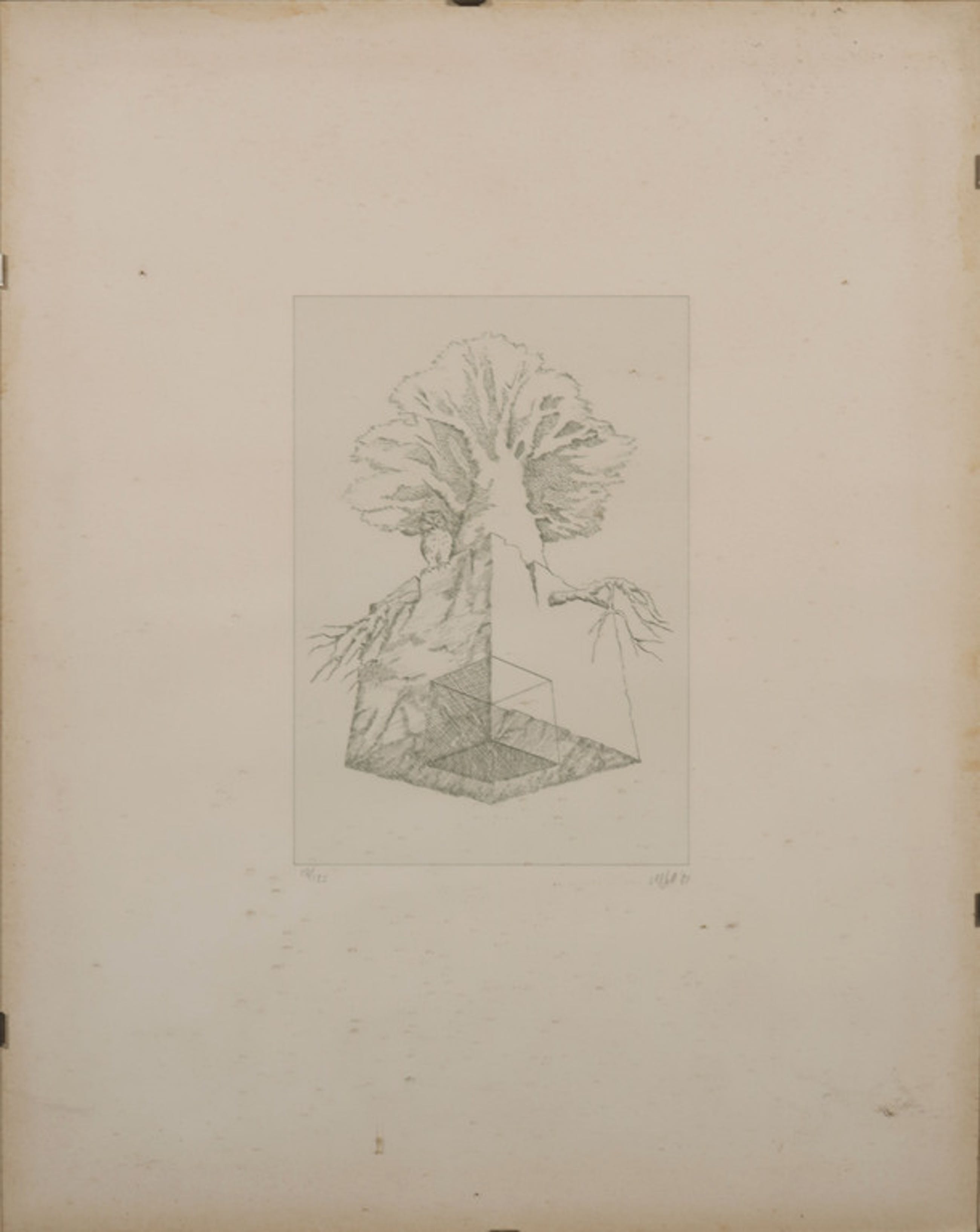 Conditie: In redelijke/ goede staat. Met vochtvlekken in de randen van het blad en met vergeelde vlekken in de witranden van het blad. Ingelijst achter passe-partout niet of nauwelijks zichtbaar.