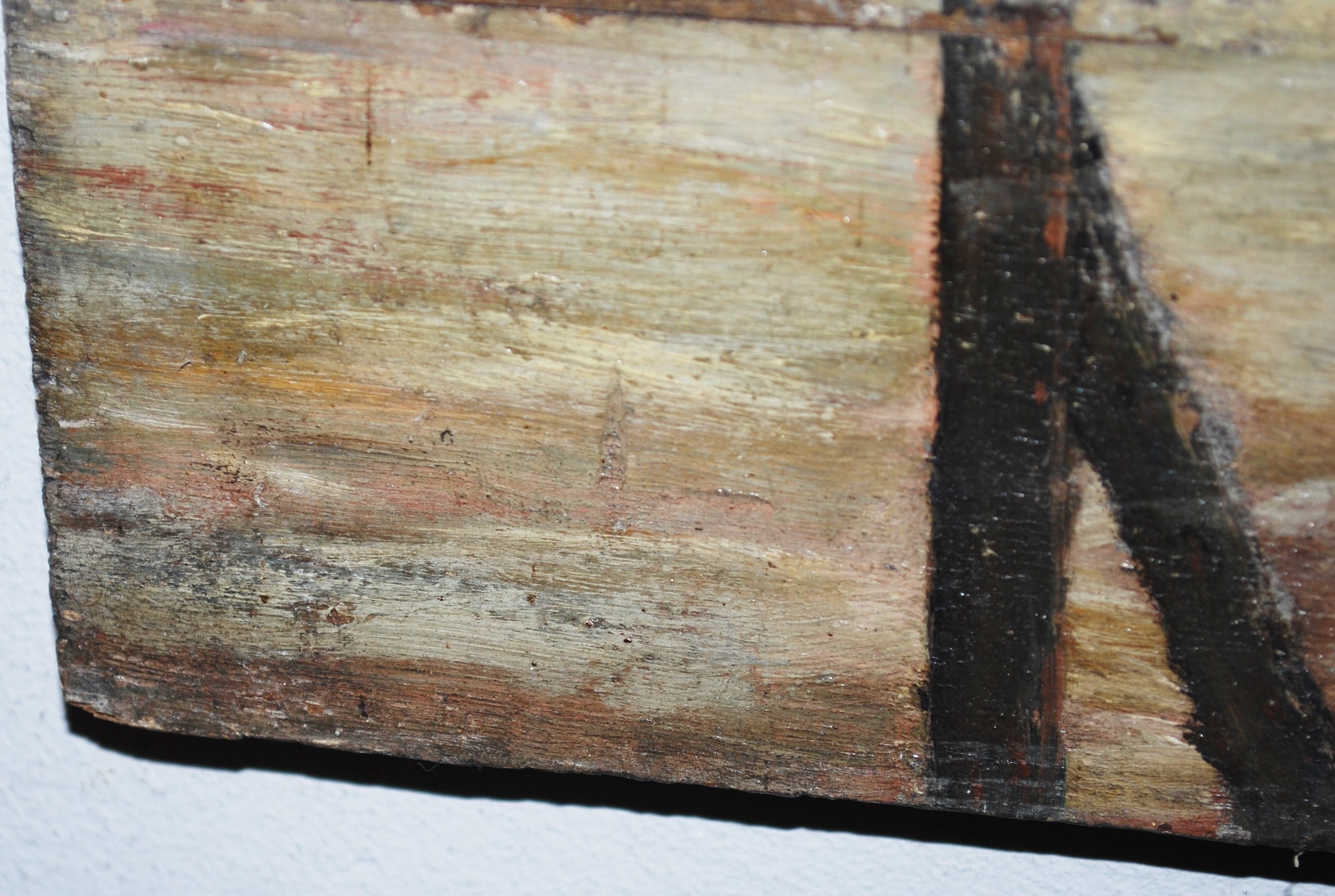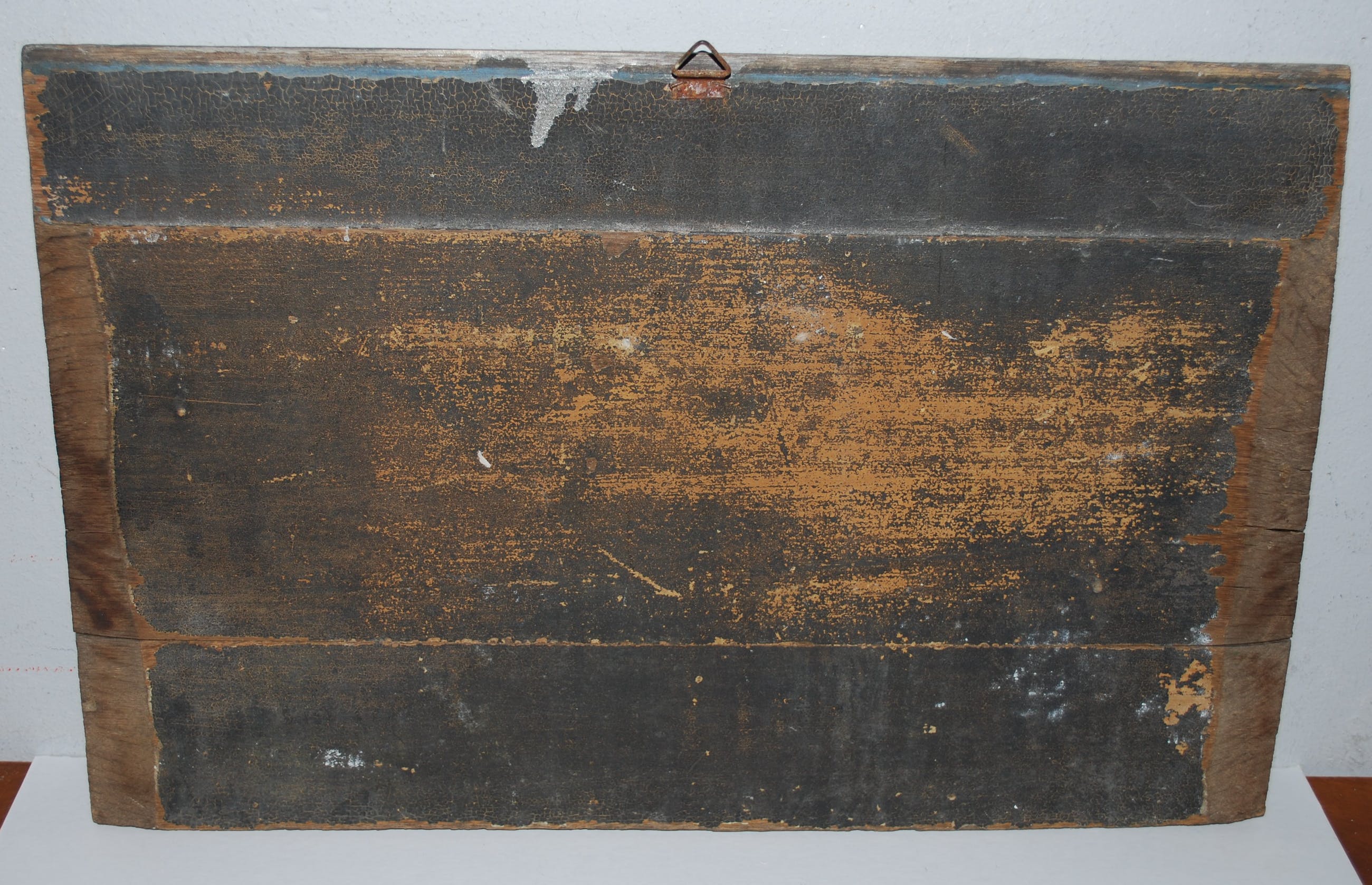 Het werk dient gerestaureerd te worden. Verfverlies, cracquelé, barsten in het paneel, schaafjes en krassen.