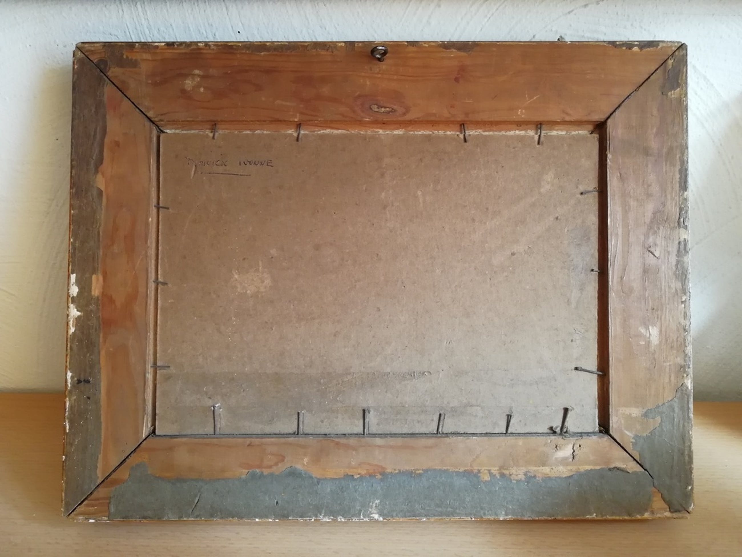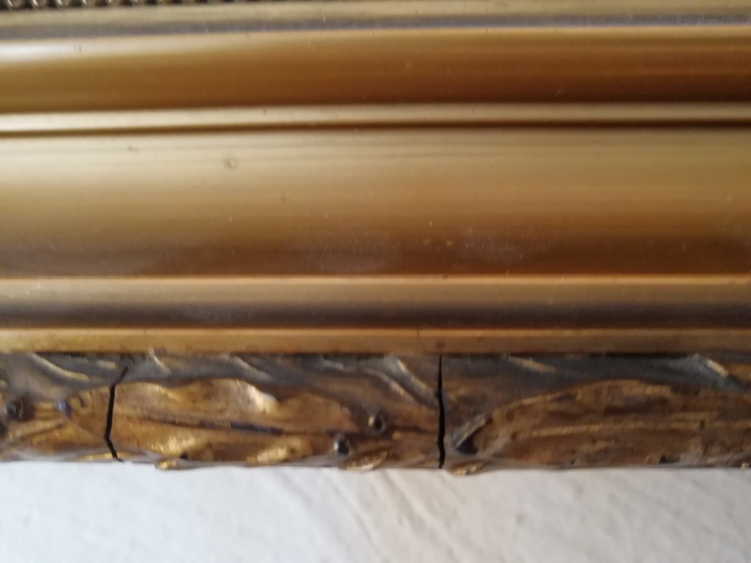 het schilderij is mooi ingekaderd met massieve bronskleurige kader