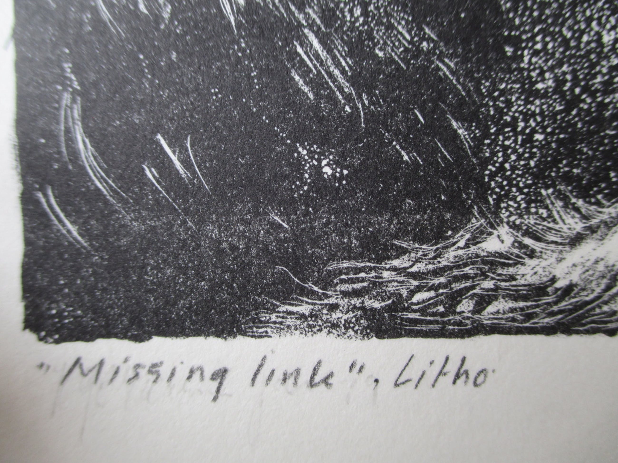 Litho uit 1979 van een mij onbekende kunstenaar, getiteld Missing Link, genummerd 4/23, gesigneerd in potlood.
