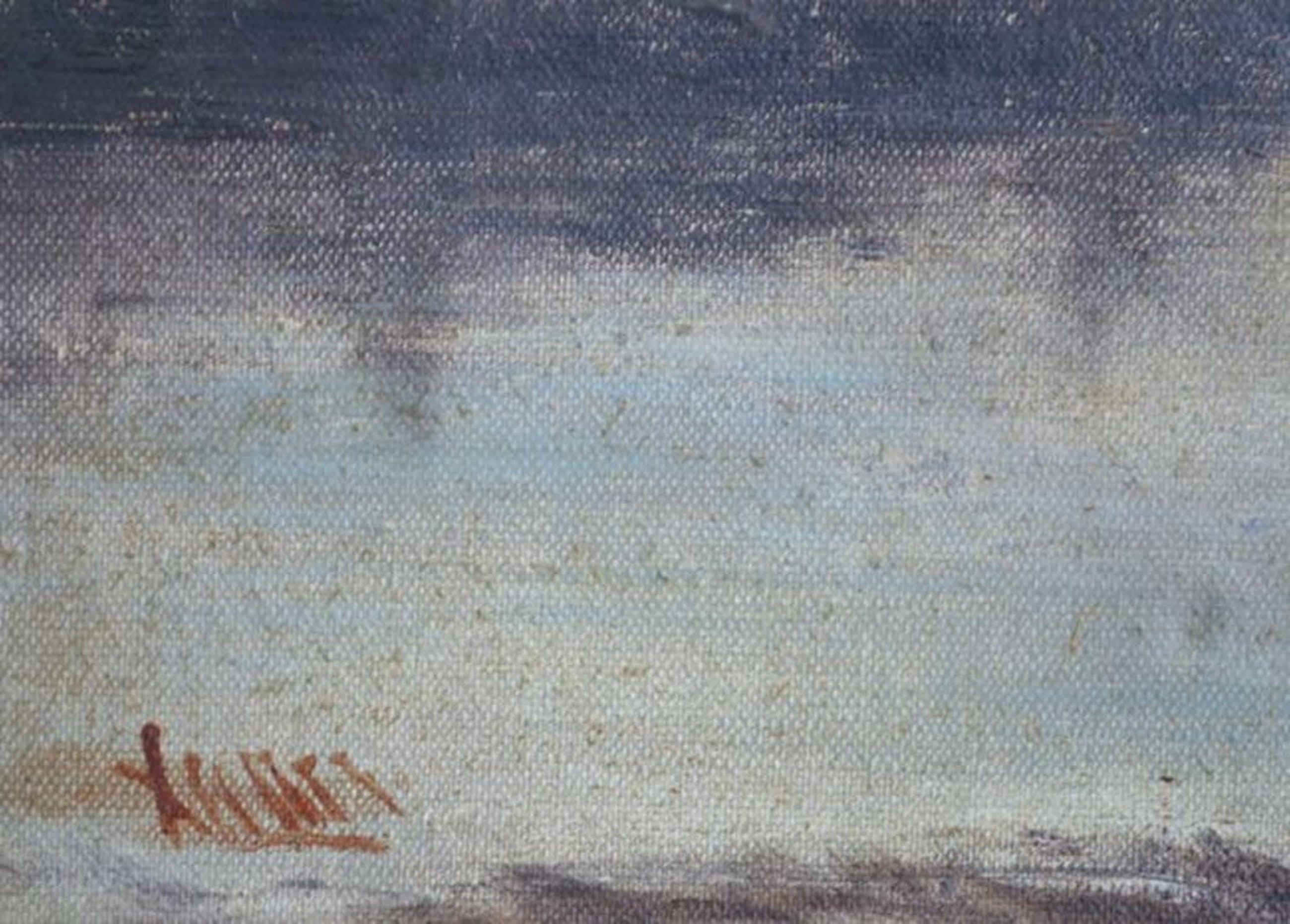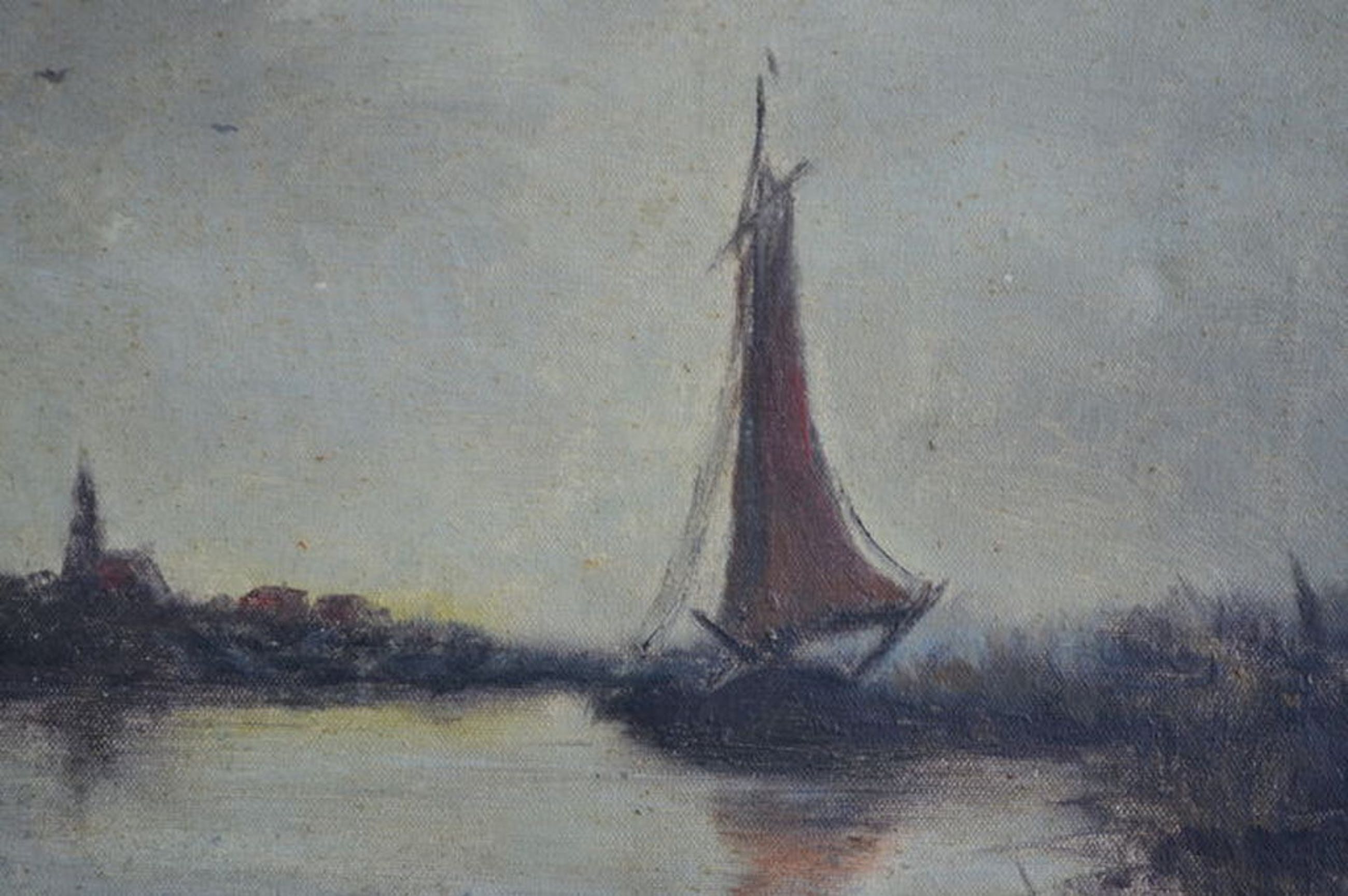 Schilderij van bomschuit op rivier met dorpje op de achtergrond. Olieverf op doek, 20ste eeuw. Schilderij is linksonder gesigneerd maar moeilijk te lezen. Afmeting is 40x30cm. In prima conditie.