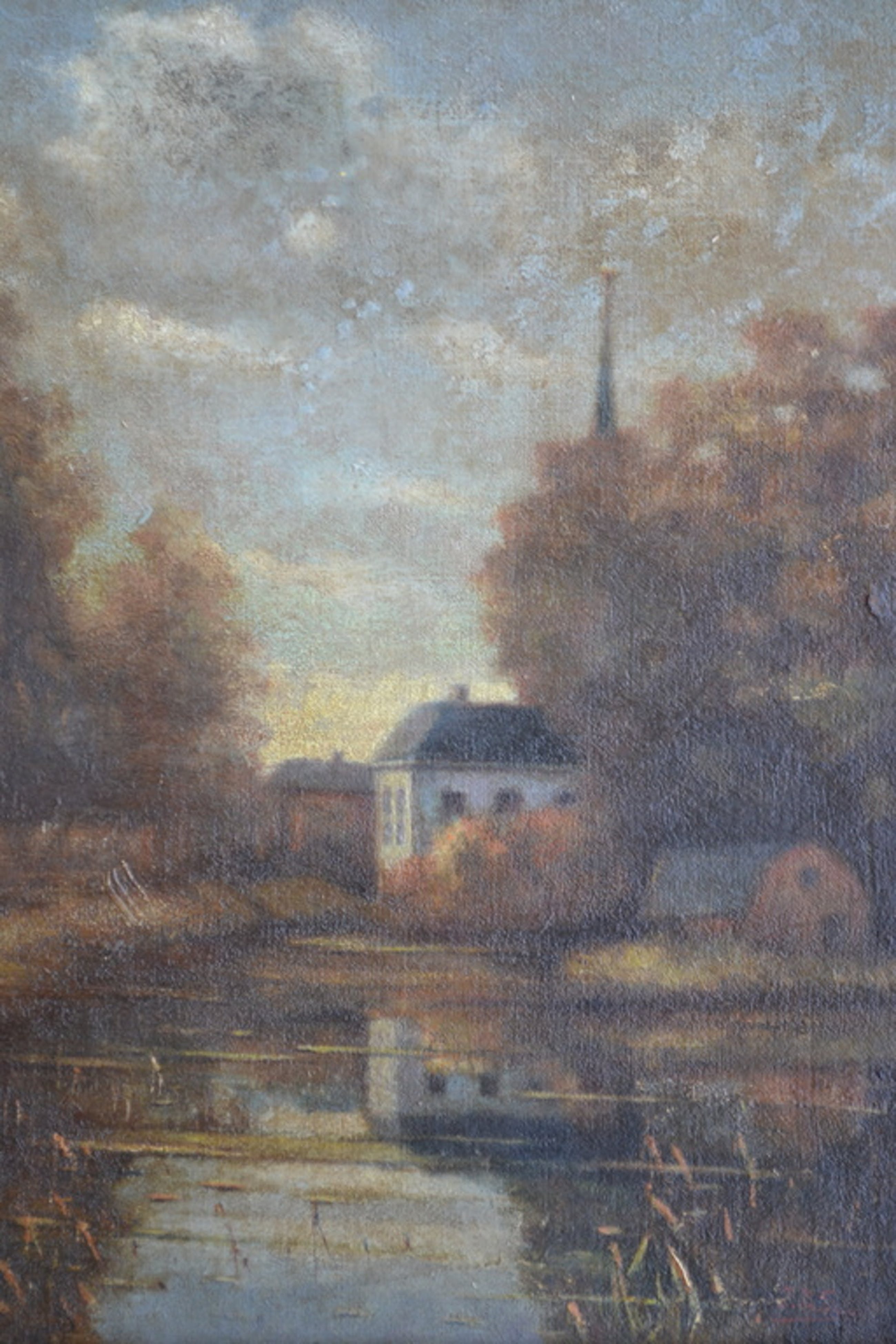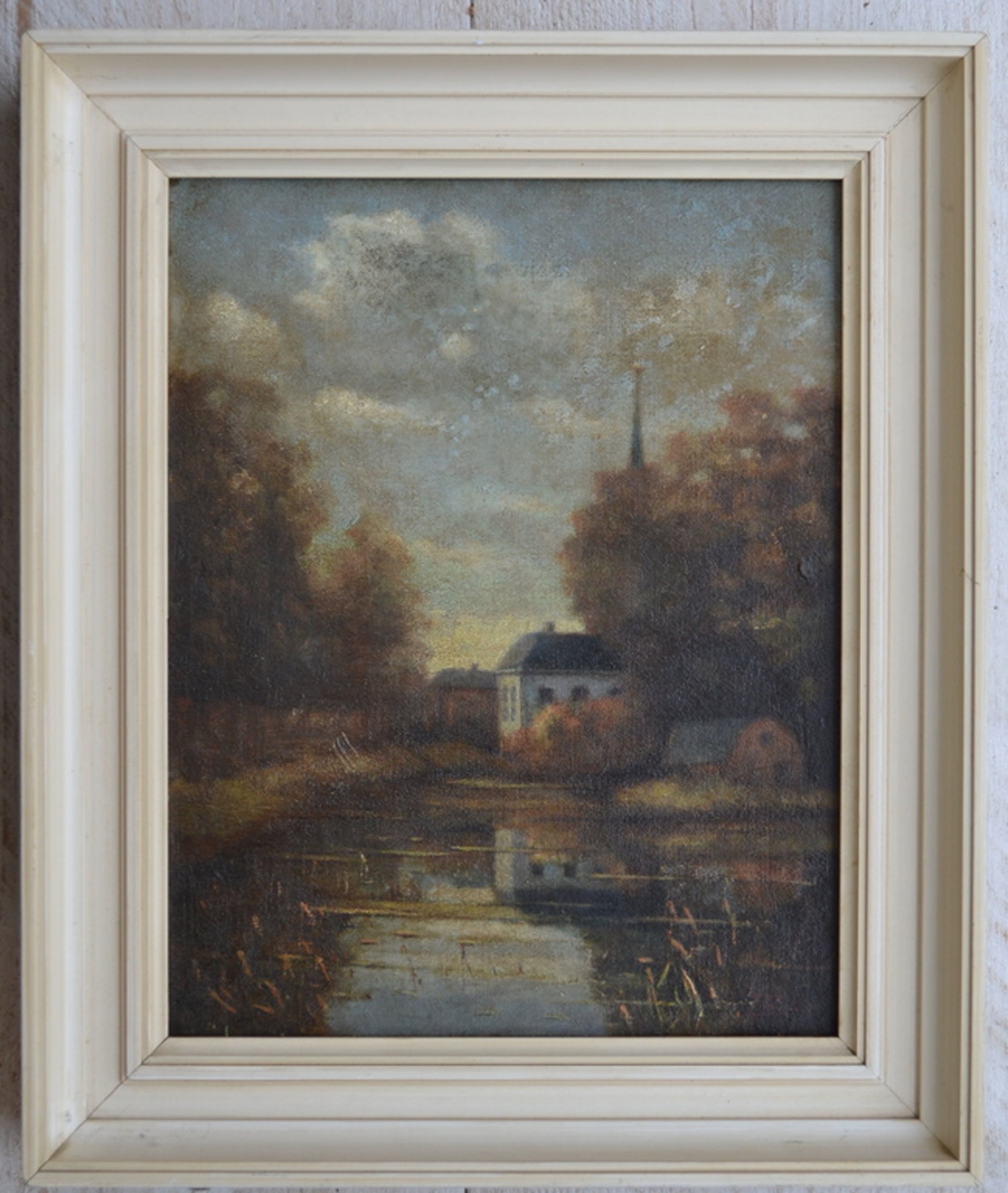 Leuk olieverf schilderijtje. Voorstelling betreft herenhuis aan het water omgeven door bomen. Het doek is rechtsonder gesigneerd maar erg lastig te lezen (zie foto). Doek zit in wit houten lijst. Doek verder in goede staat maar kan wel een schoonmaakbeurt gebruiken.