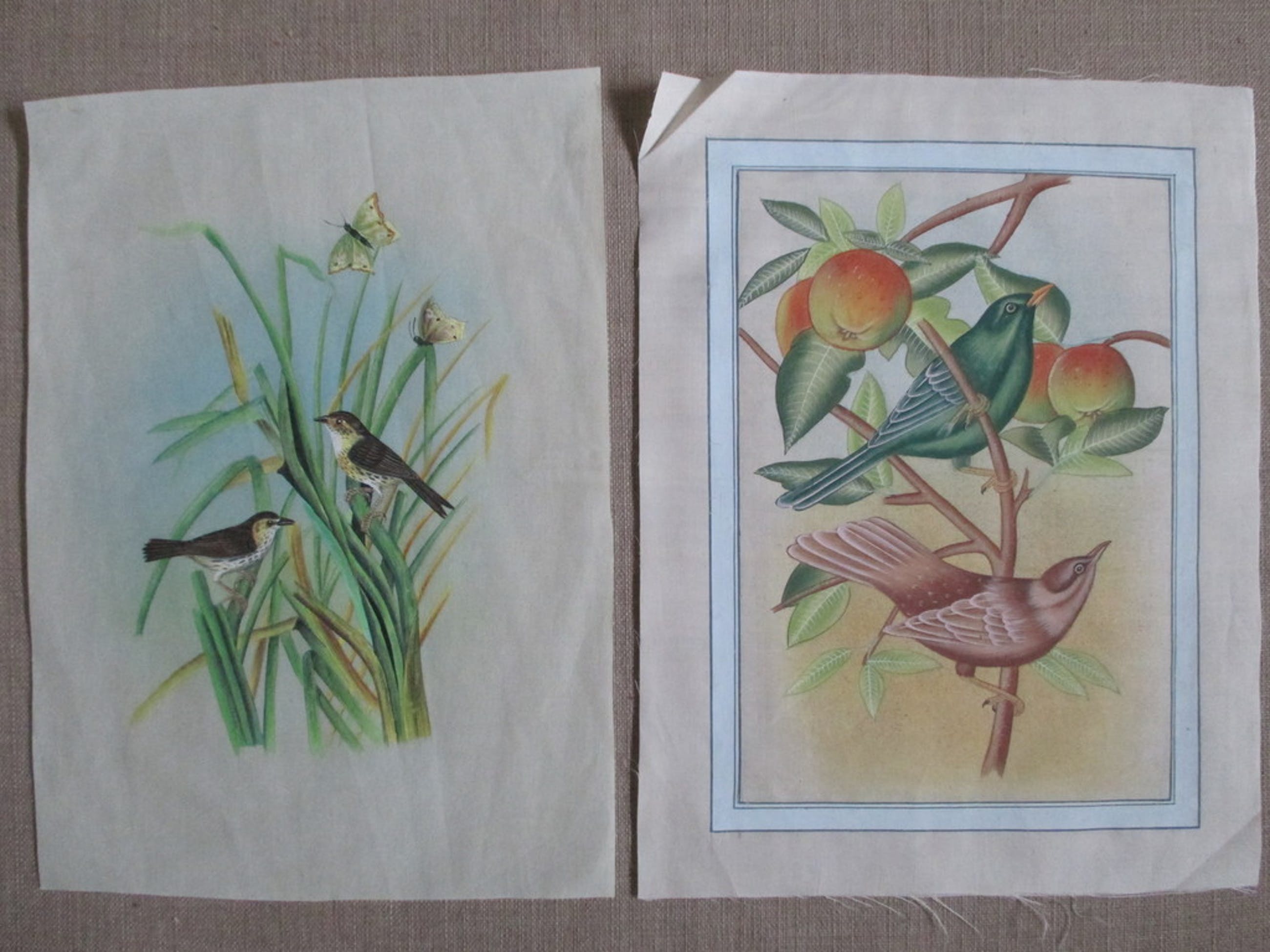 Twee beschilderde zijden doeken, afm. ca 27x35 en 26x35,5 cm.