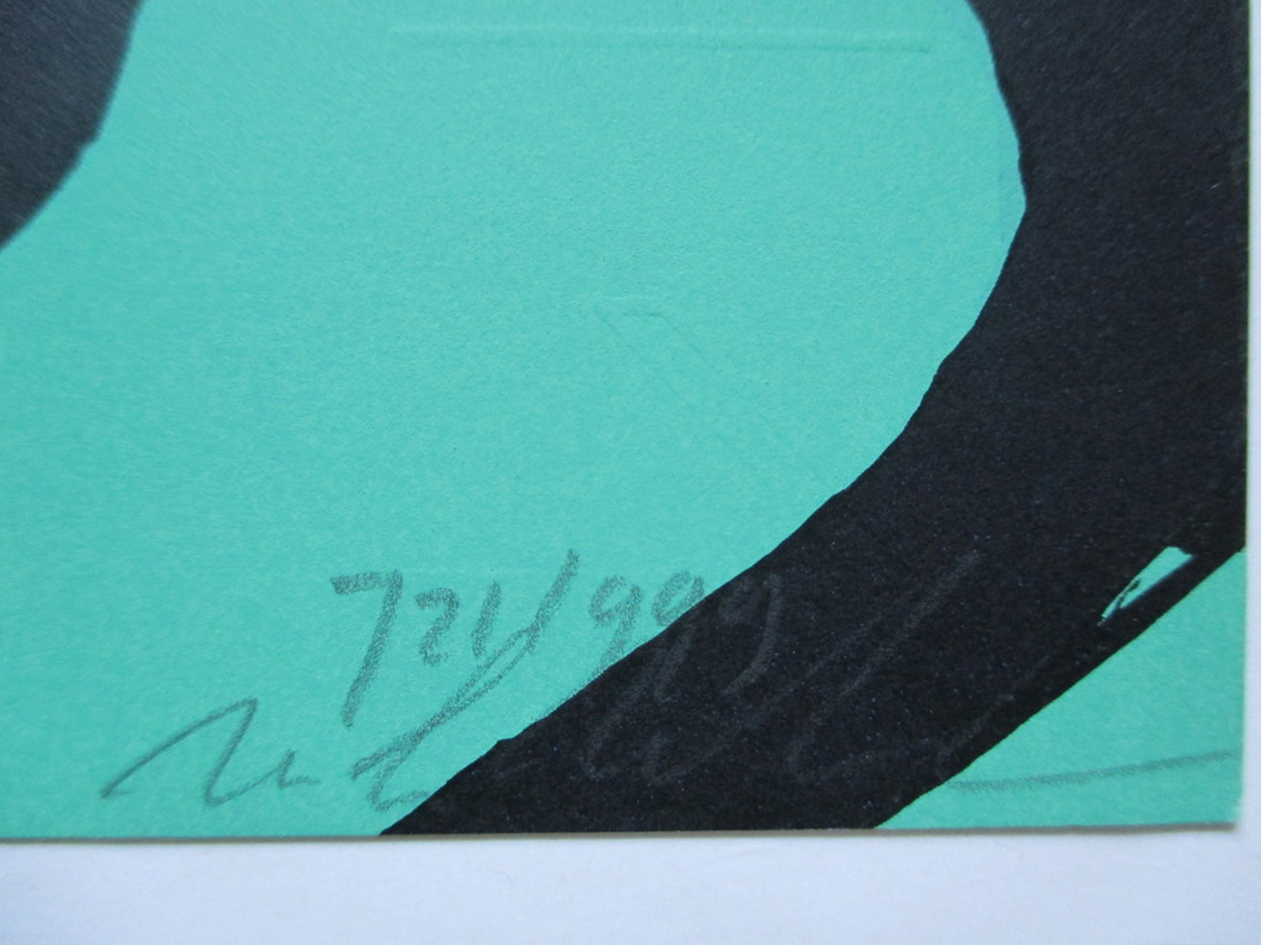 Zeefdruk op glad papier, afm. blad 21x28,5, r.o gesigneerd en genummerd 721/999 in potlood.. In uitstekende staat.