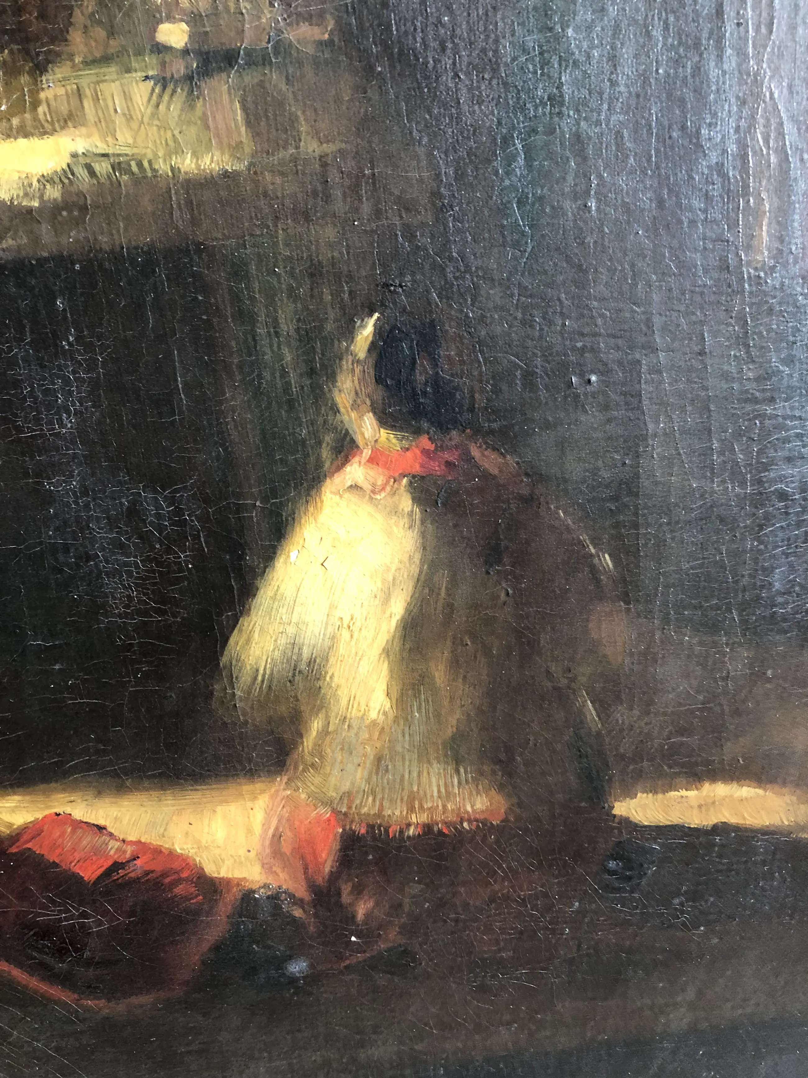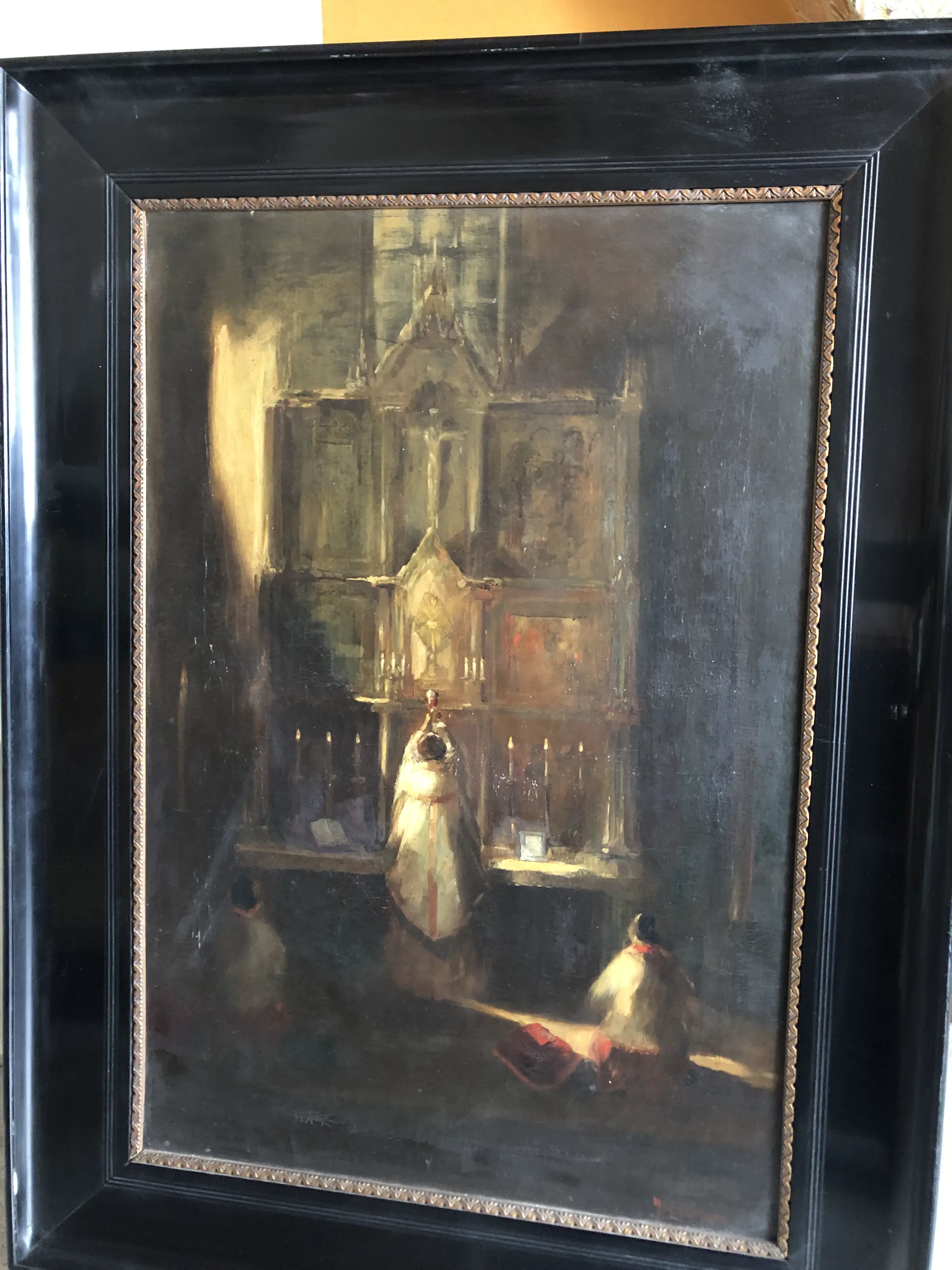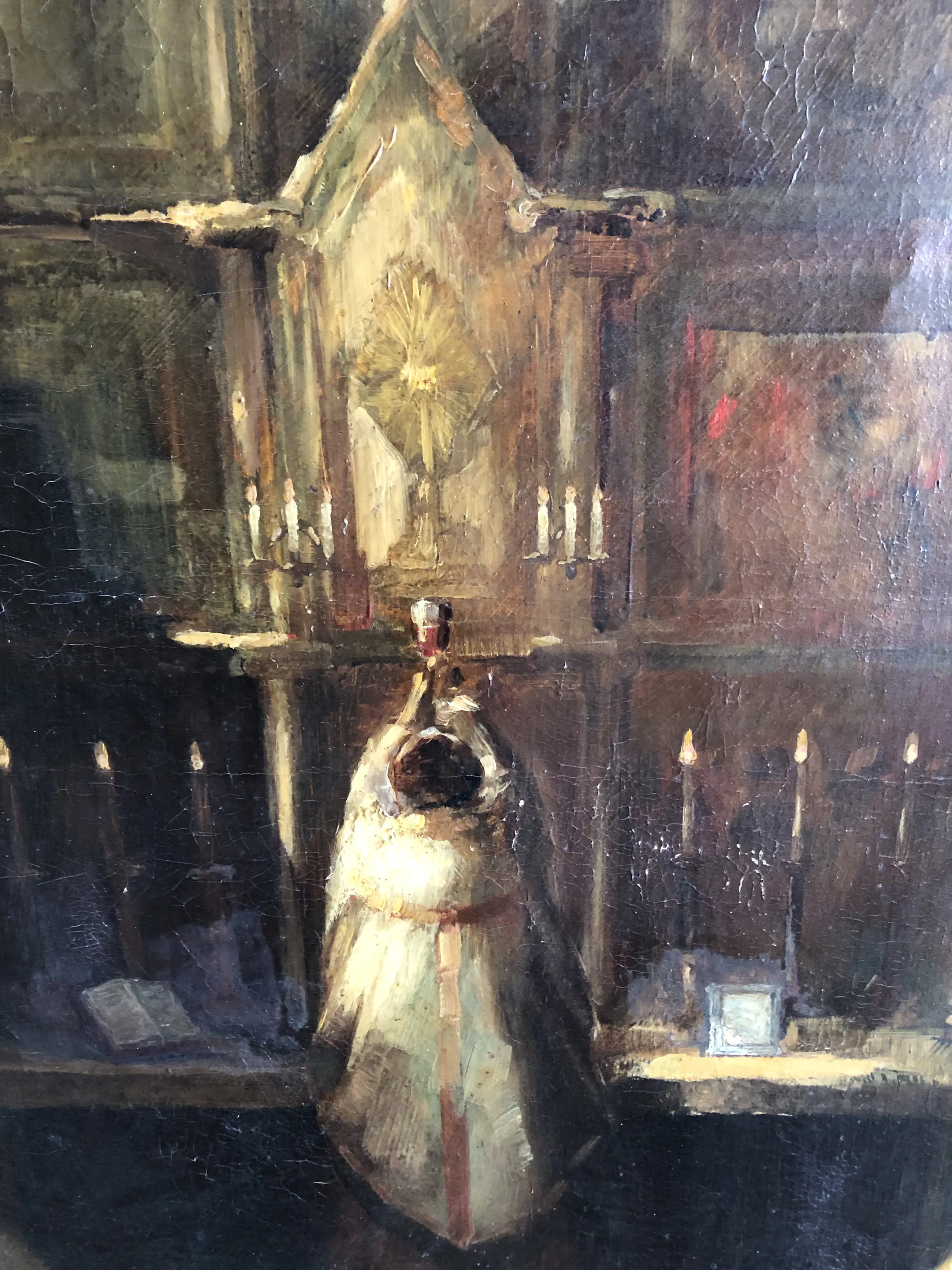 Mijn grootvader zou dit schilderij van de schilder hebben gekocht. Het stelt de consecratie tijdens een katholieke mis voor: het moment dat brood en wijn zouden veranderen in het lichaam en bloed van Christus.