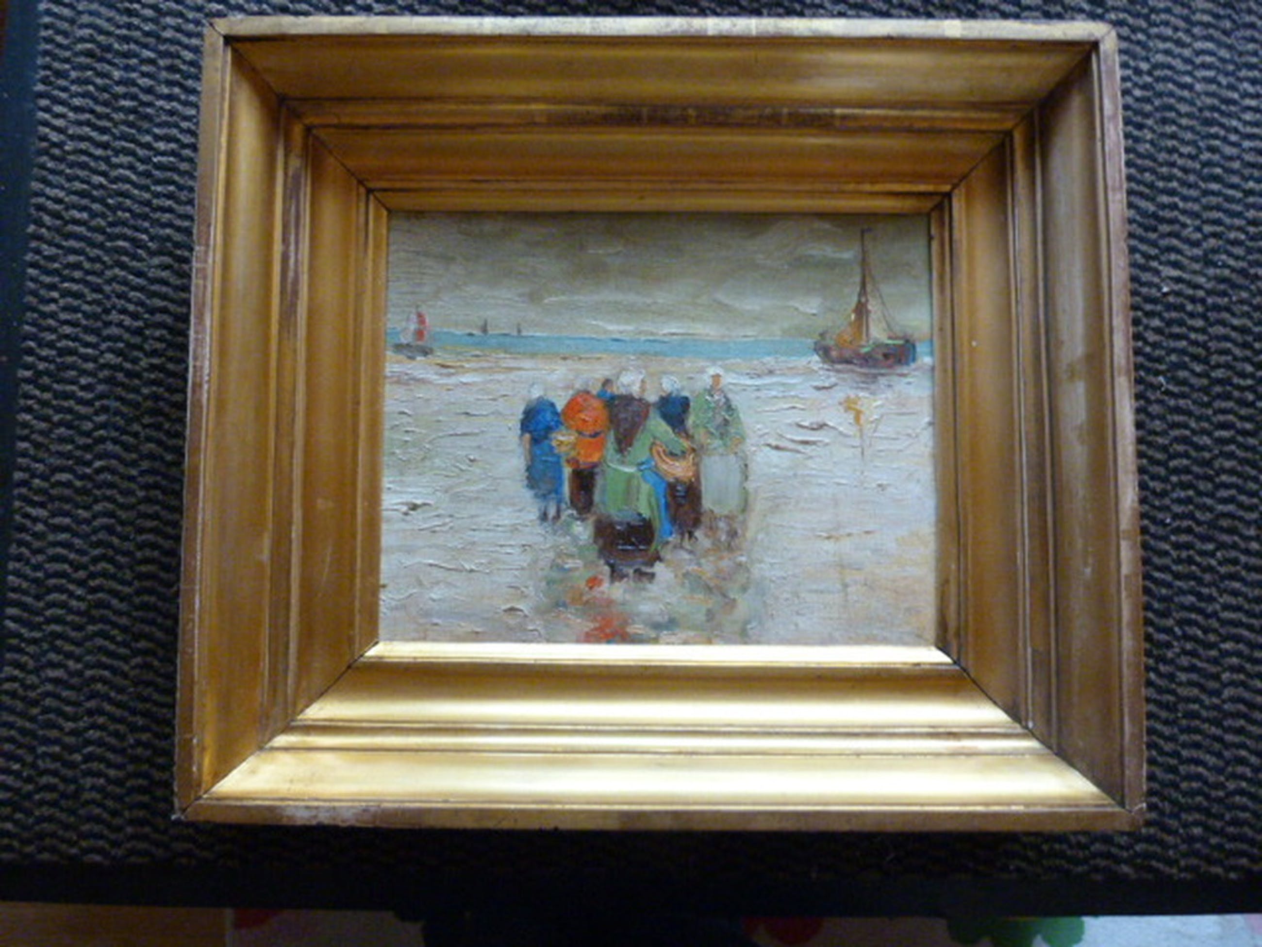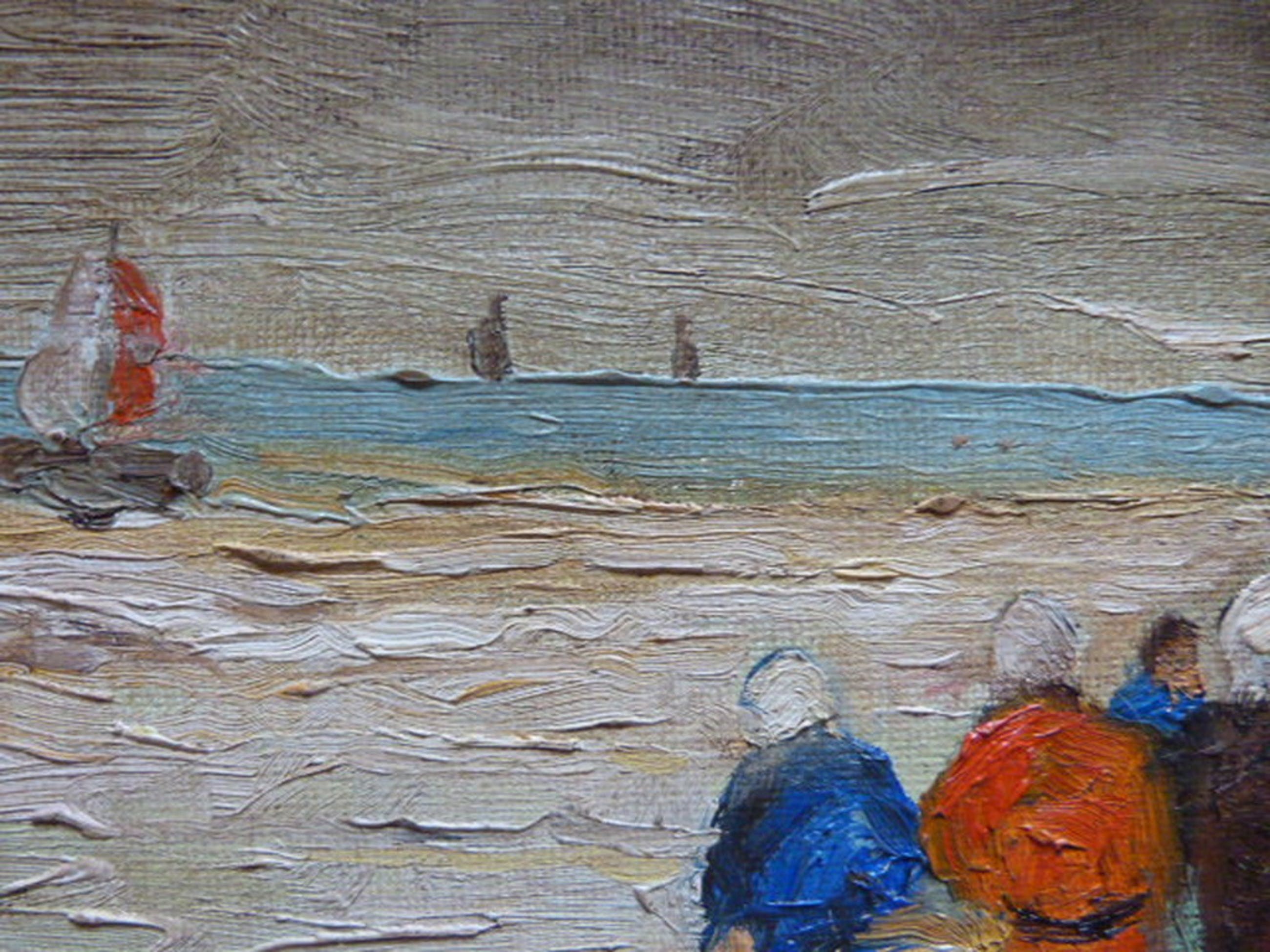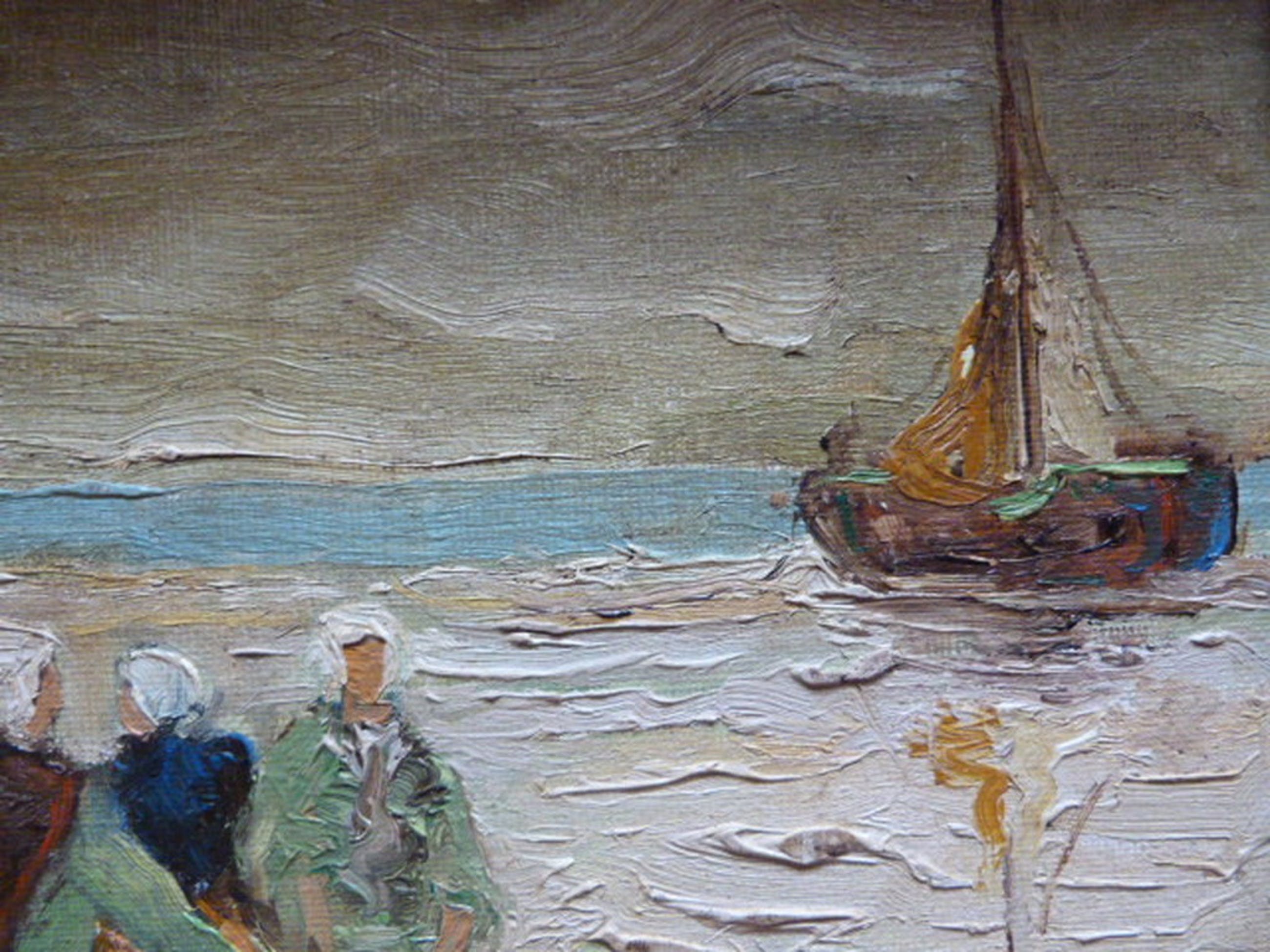 Fraai schilderij van een strandgezicht, met op het strand de vrouwen,