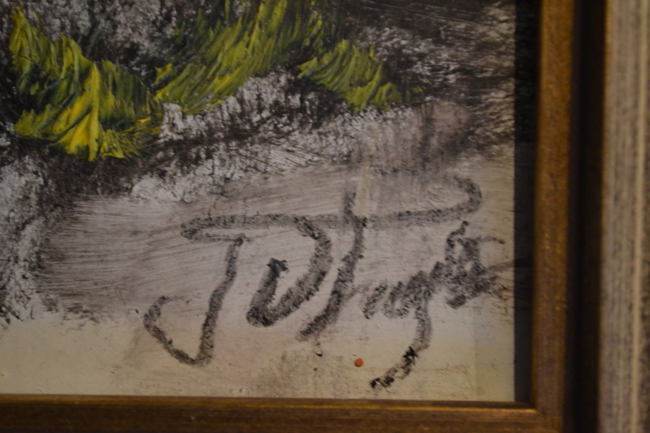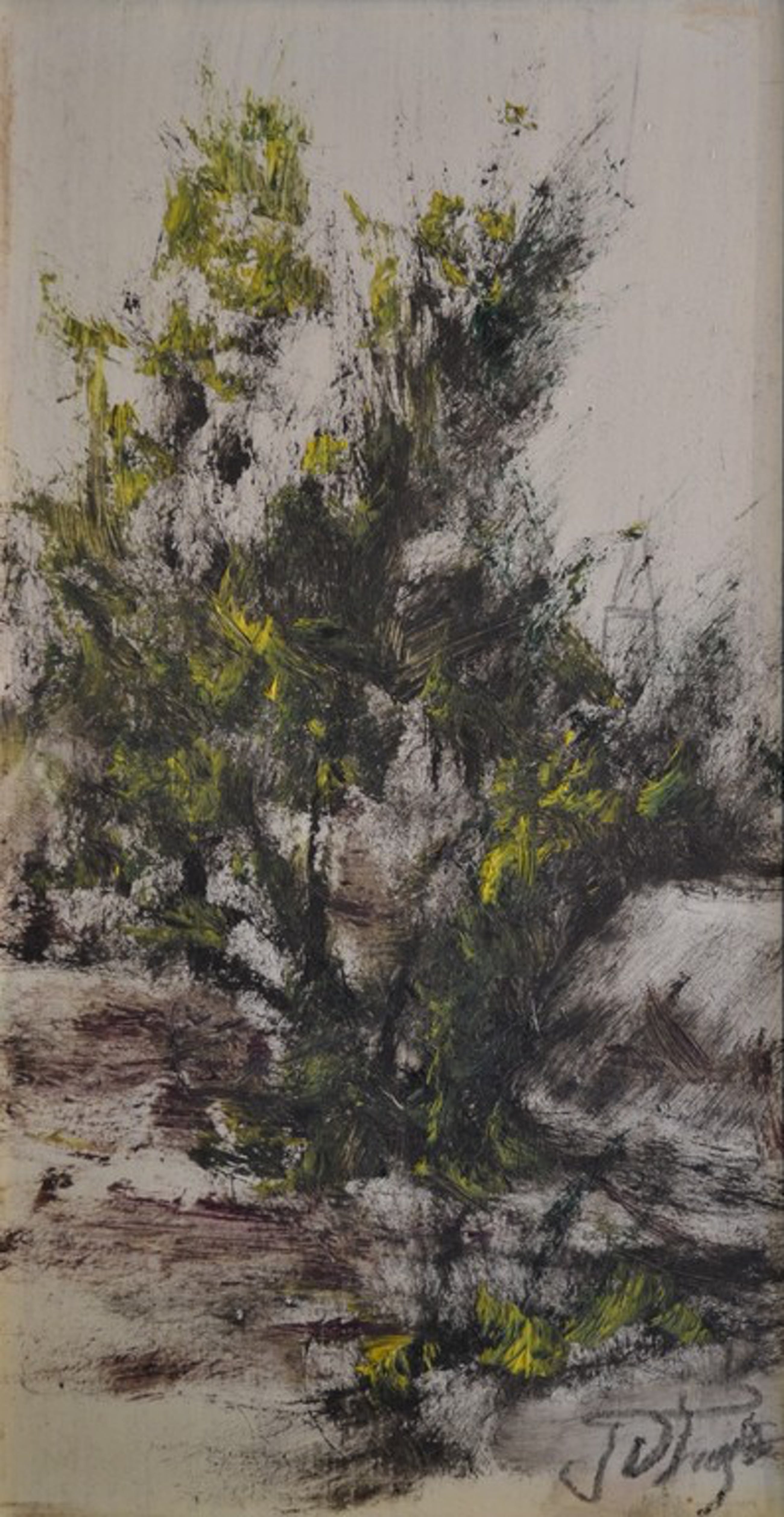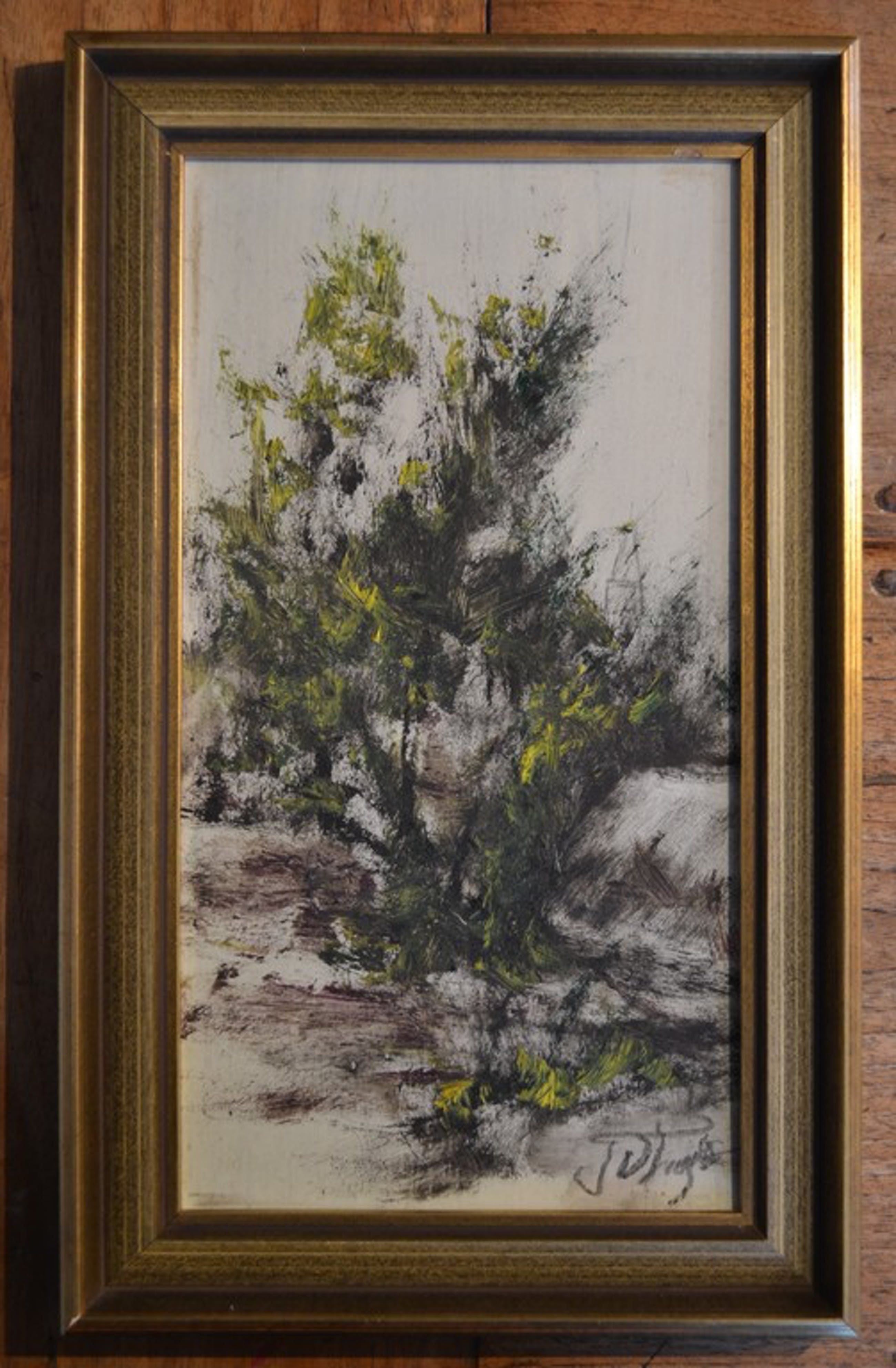 Een klein werkje (15x29), olieverf op board, voorstelling van een boom. Een eenvoudig maar toch mysterieus en mooi schilderijtje. Het schilderij is rechtsonder gesigneerd maar is niet goed lezen. Rechtsmidden van de boom lijkt nog een deel van een potlood tekening (kerktoren?) zichtbaar.