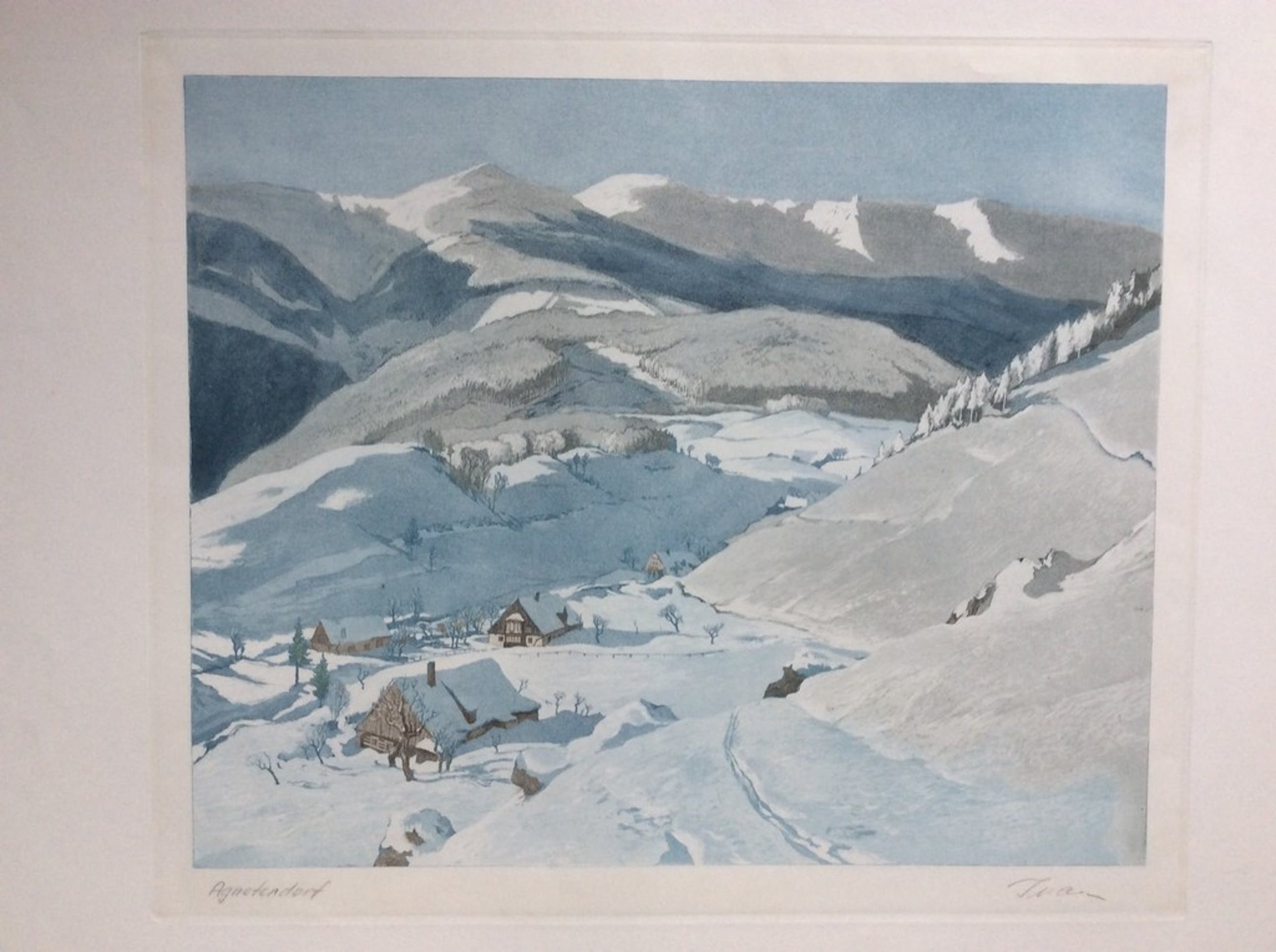 Aangeboden: 2x Grote kleurenets/aquatint met voorstelling van (Sneeuw)Landschap van de kunstenaar Friedrich Iwan, ca. 1930. Op stevig etspapier, formaat blad ca 72 x 54 cm, ets ca 46 x 39 cm. Rechtsonder met potlood gesigneerd Iwan. Blad kent aan de randen wat gebruikssporen, de etsen zelf zijn prima in orde.