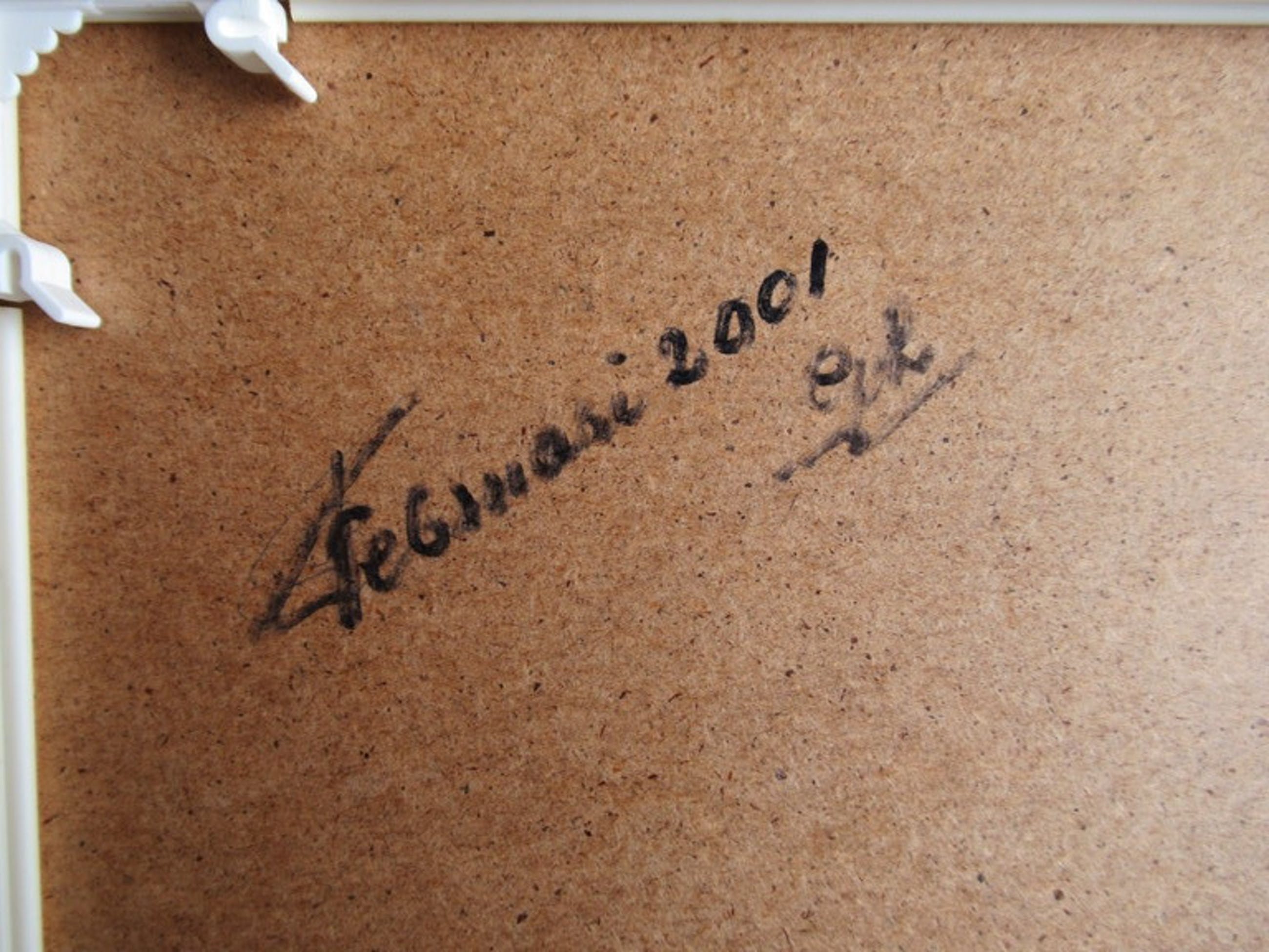 het grootste werk is 17 x 27 cm, de plastic lijst is 30 x 40 cm. Rechtsonder staat een paraaf evenals aan de achterzijde. Op de achterzijde staat ook nog " februari 2001.