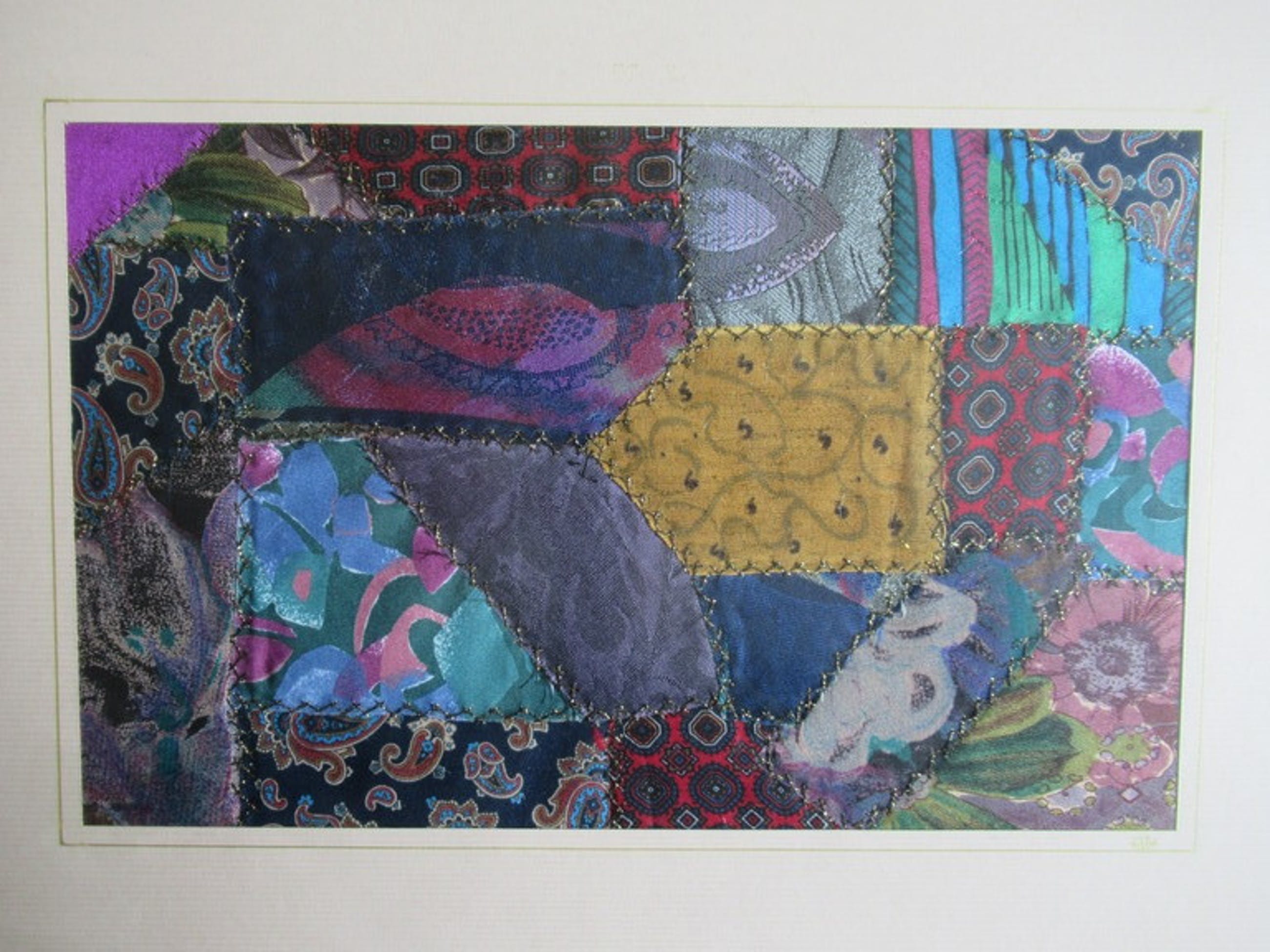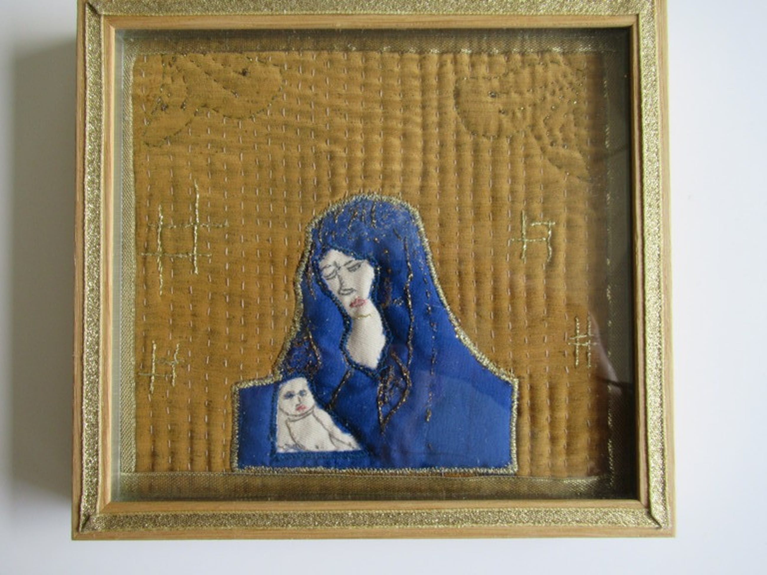 Drie mooie kunstwerken van stof, twee maal met de voorstelling van "Maria en kind" en een abstract werk.