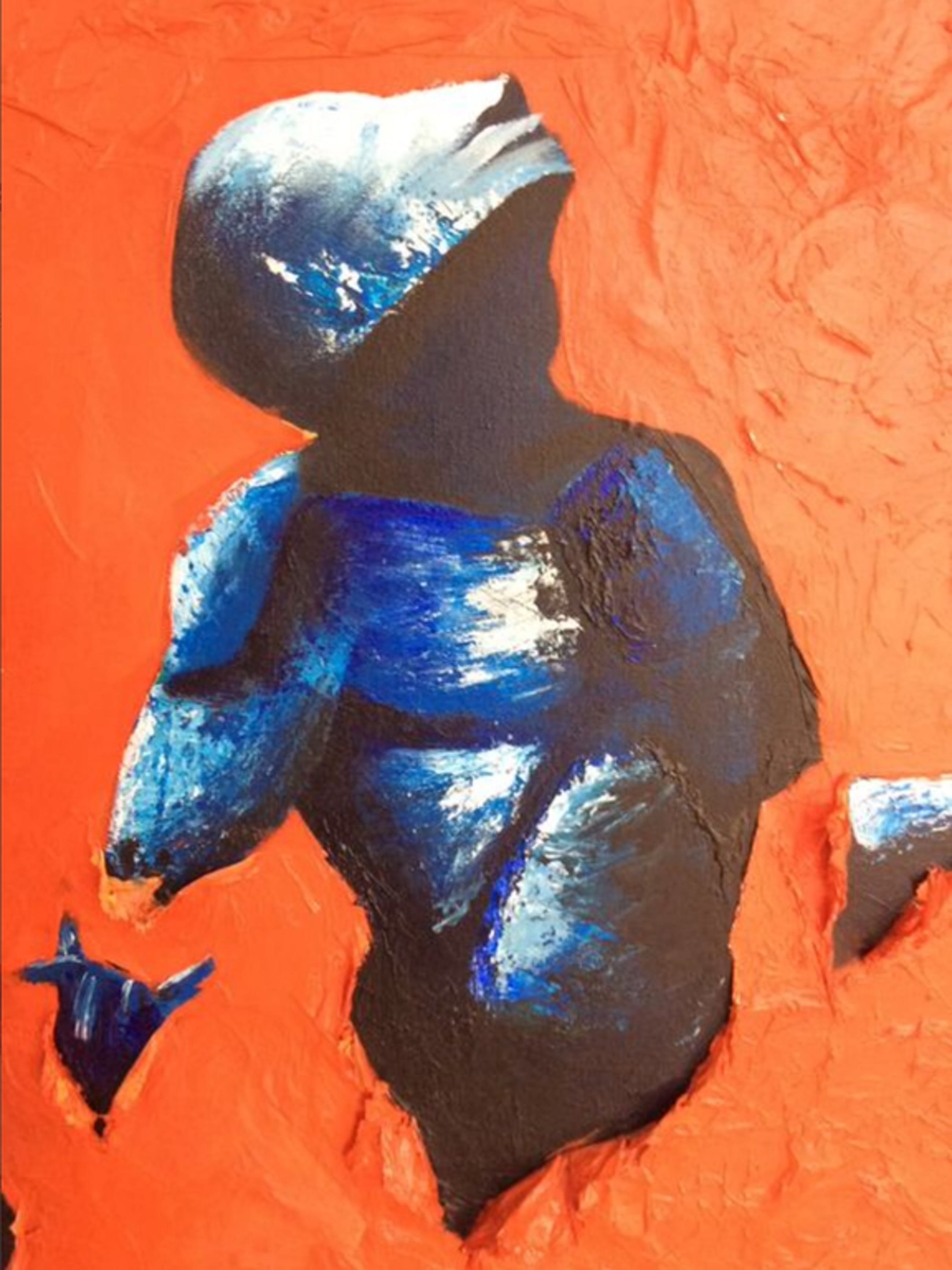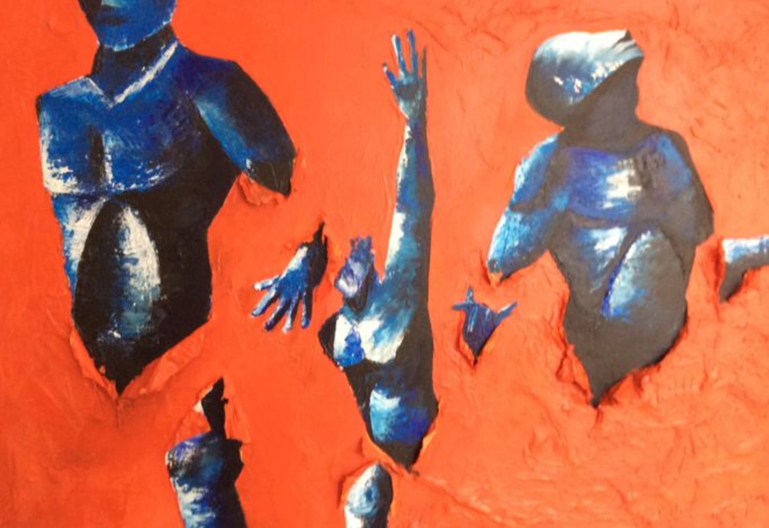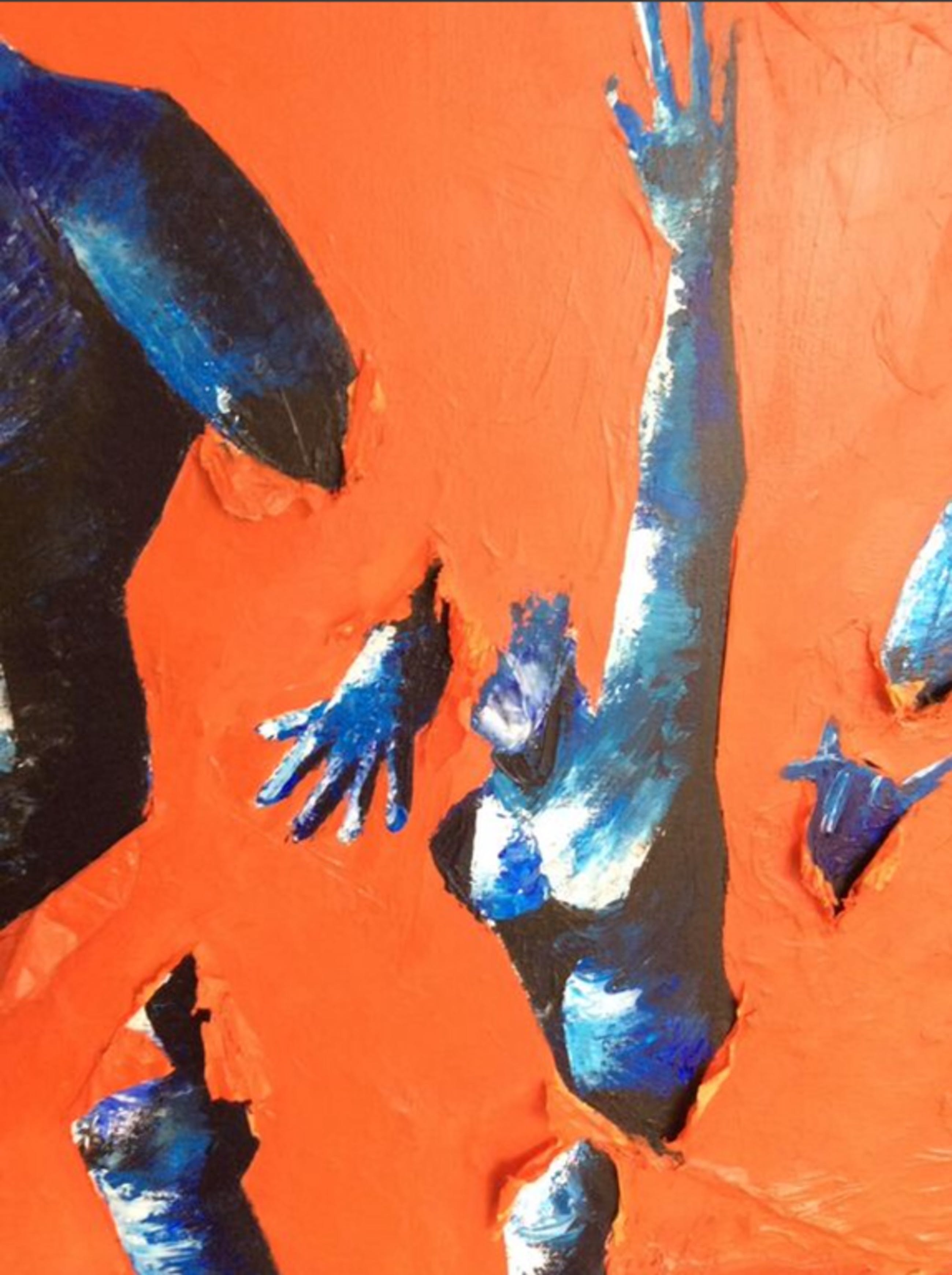 Acryl op doek, 3 figuren die bijna letterlijk door het doek heen lijken te komen.