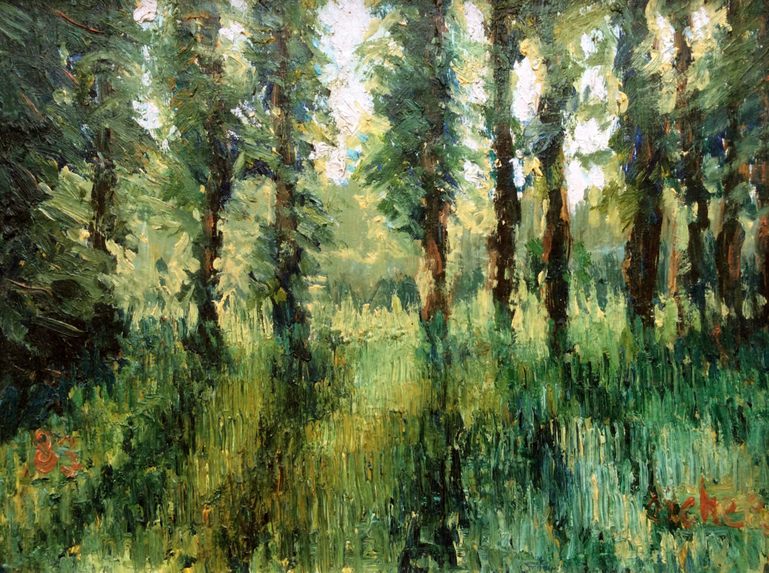 Van onbekende kunstenaar: olieverf op paneel. Achterop getiteld: Bosrand, omgeving Oosterbeek. In ruime zwarte houten lijst.