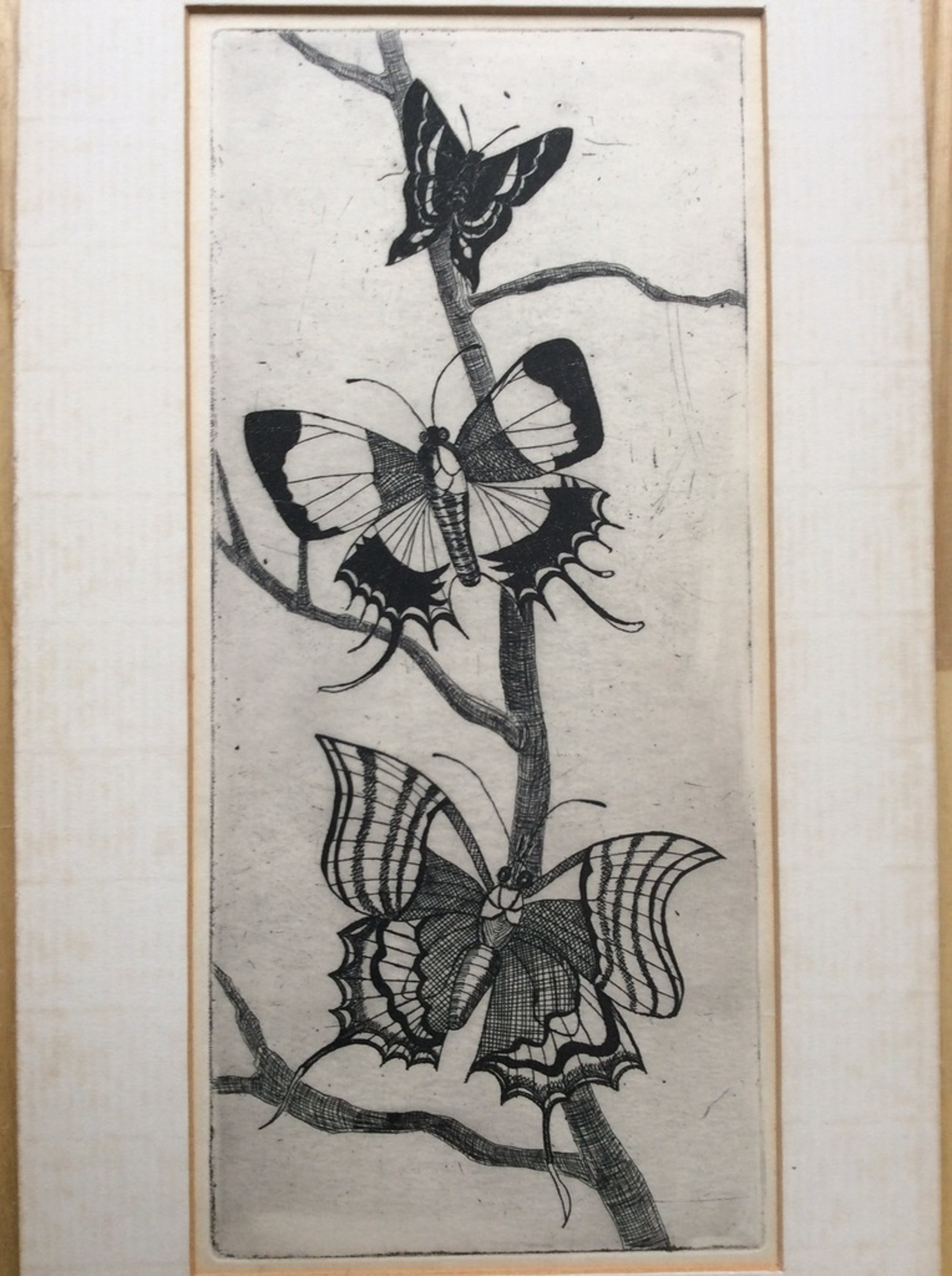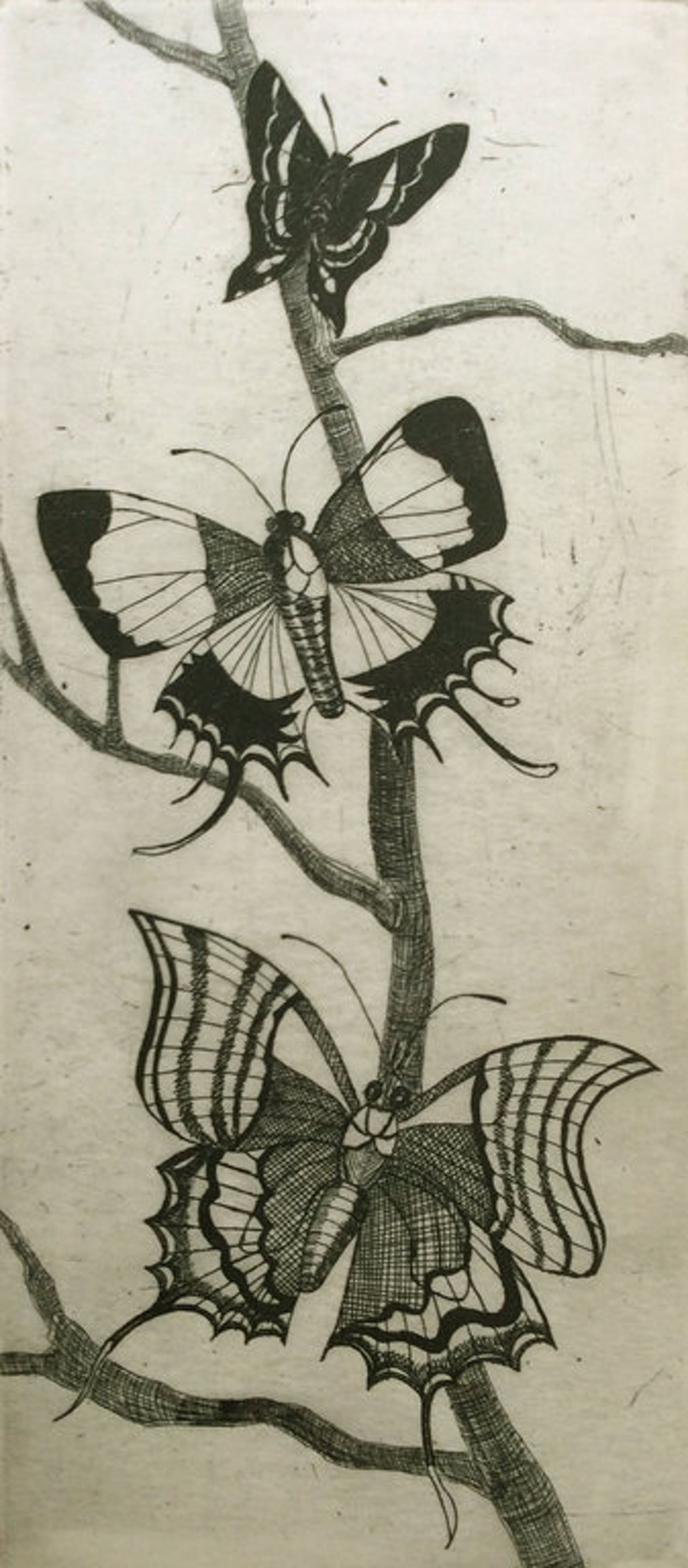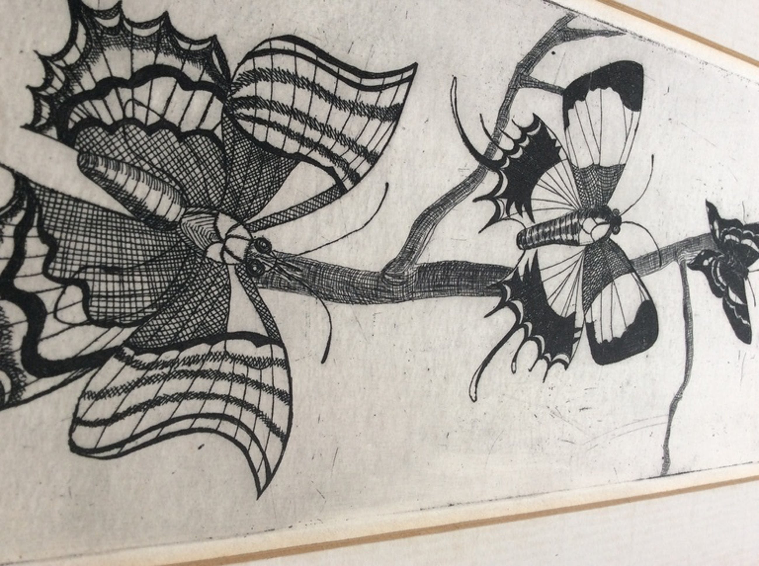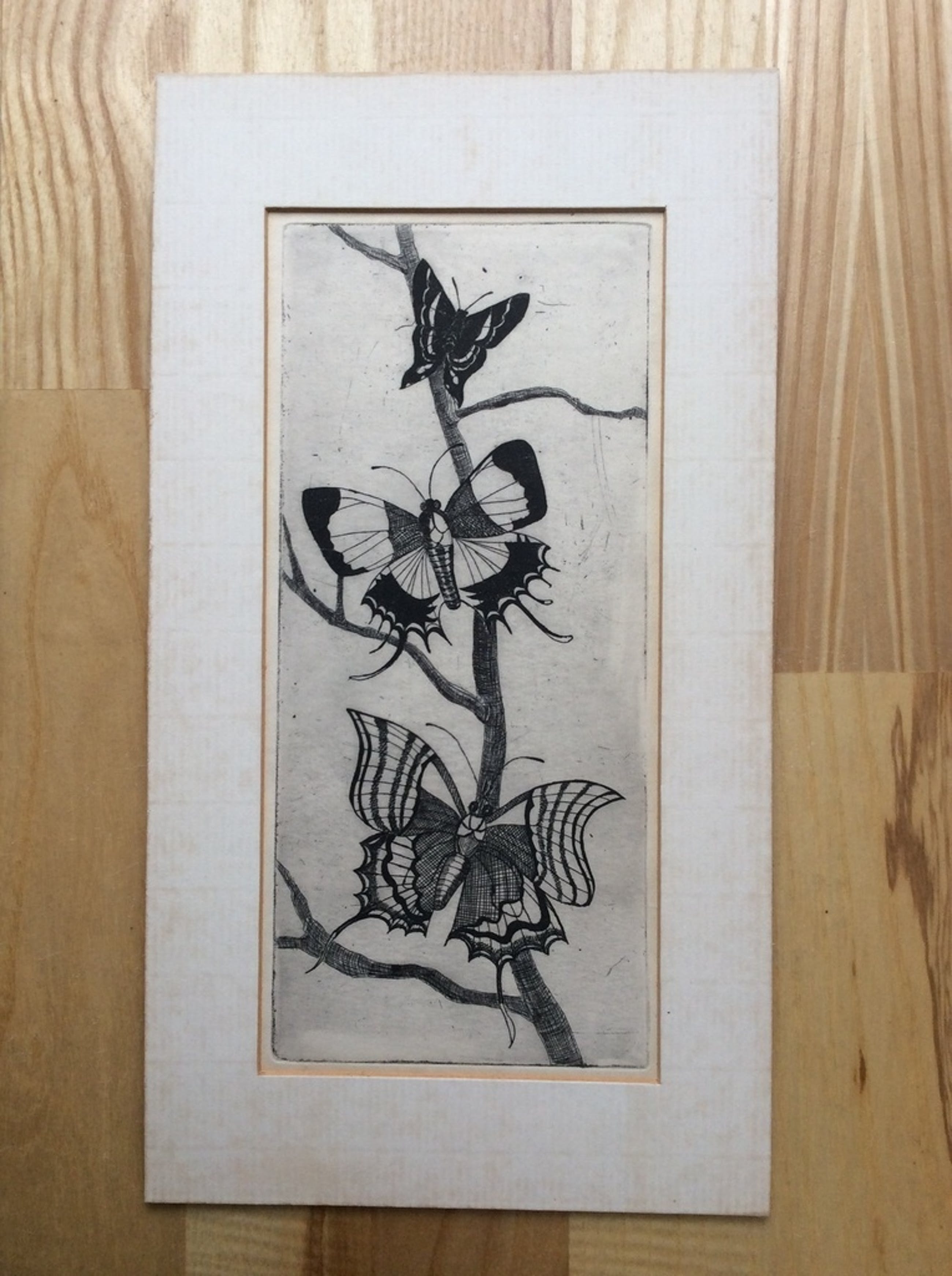 Mooie oude ets met voorstelling van drie vlinders, door onbekende kunstenaar. Niet gesigneerd, niet gedateerd. Waarschijnlijk uit de eerste helft van de vorige eeuw. Incl. passepartout 20,5 x 37 cm, ets grootte 12,5 x 27,5 cm.