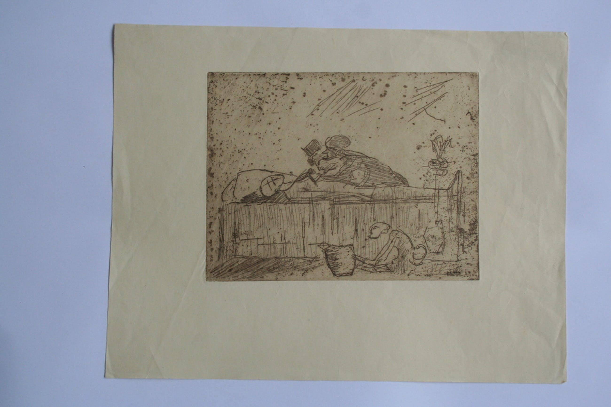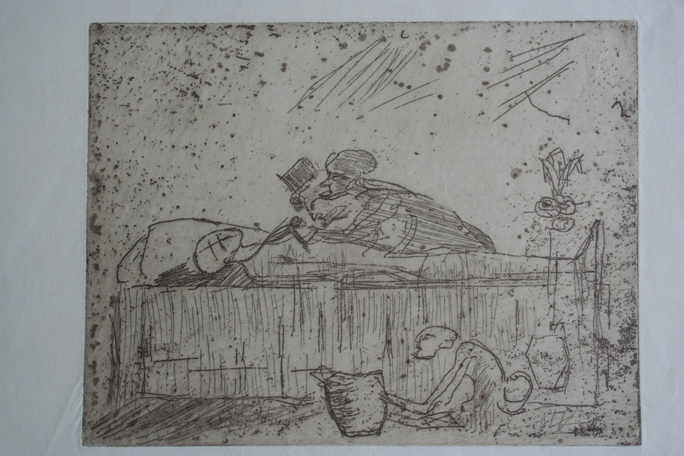 Ets van lichaam op een bed of tafel, verschijning daarachter of boven en een aap op de grond.