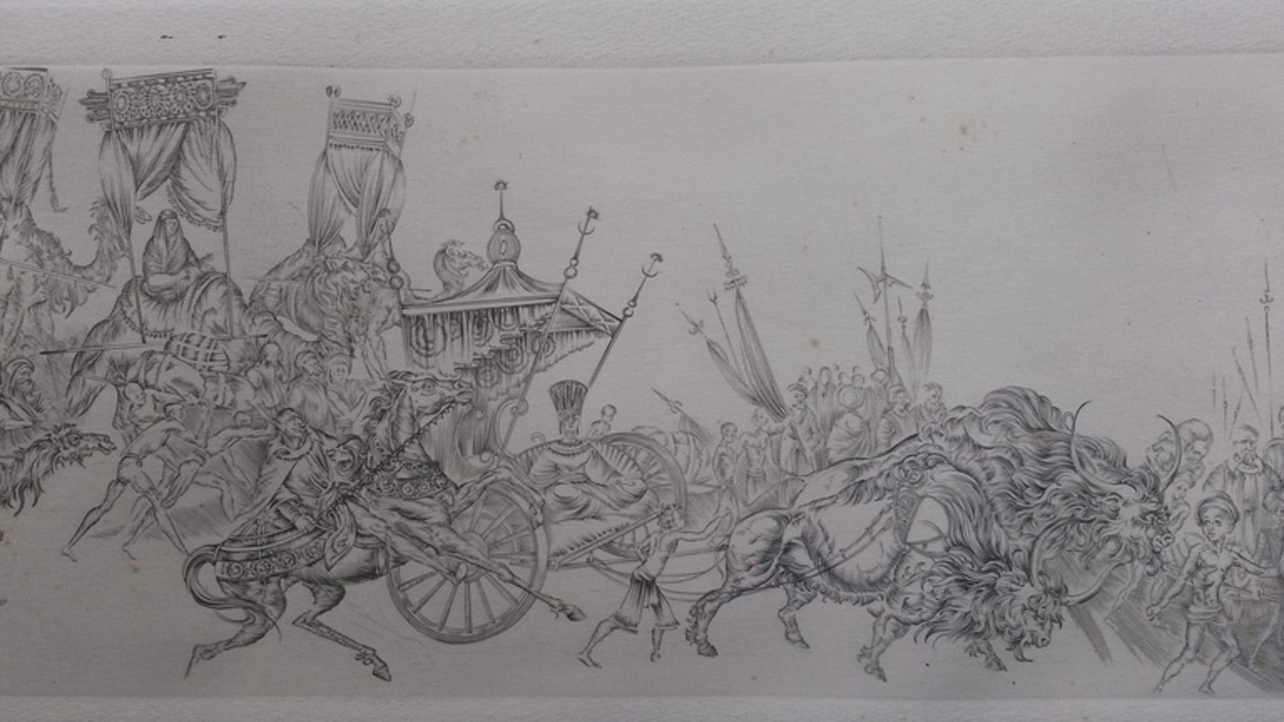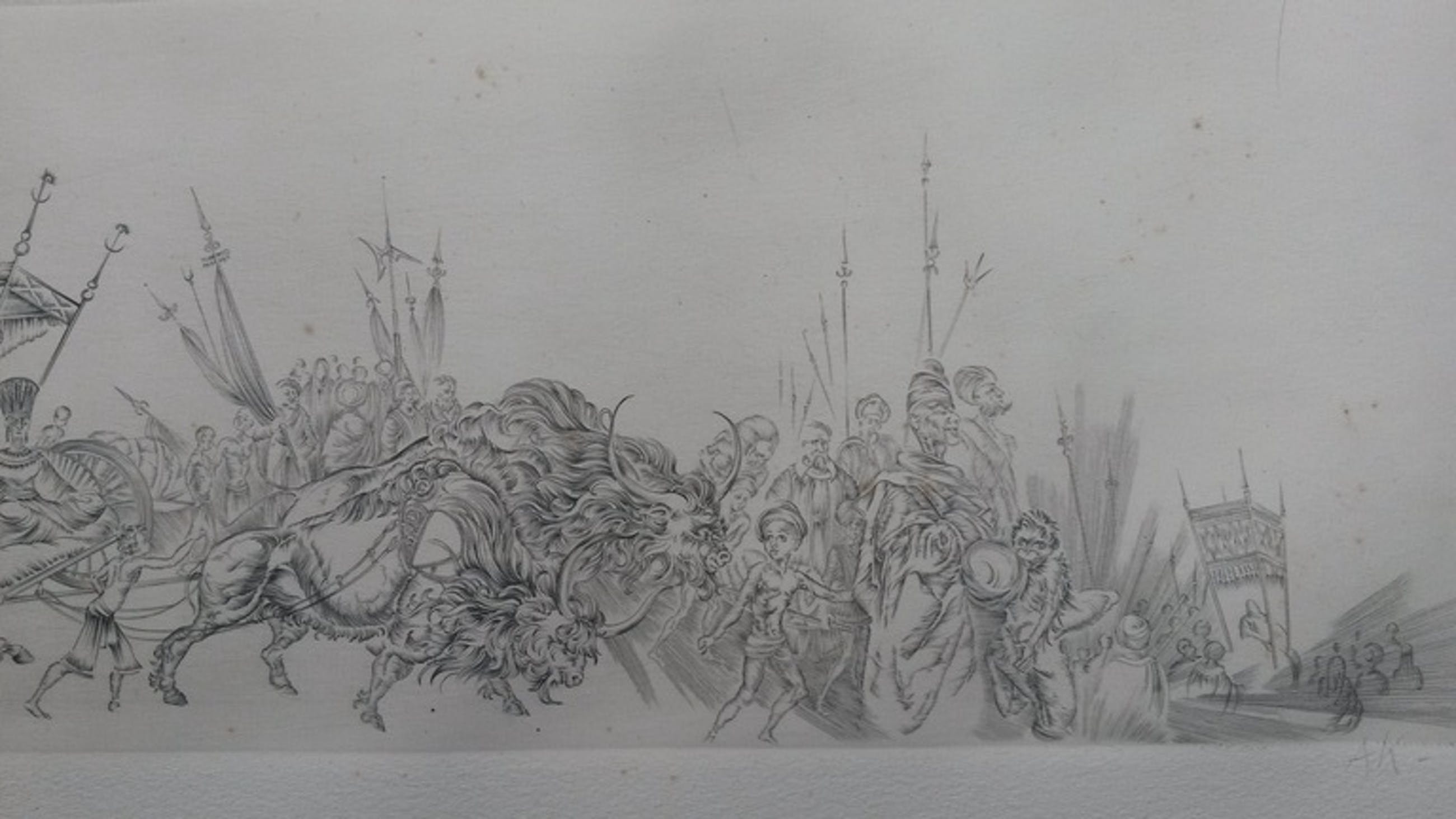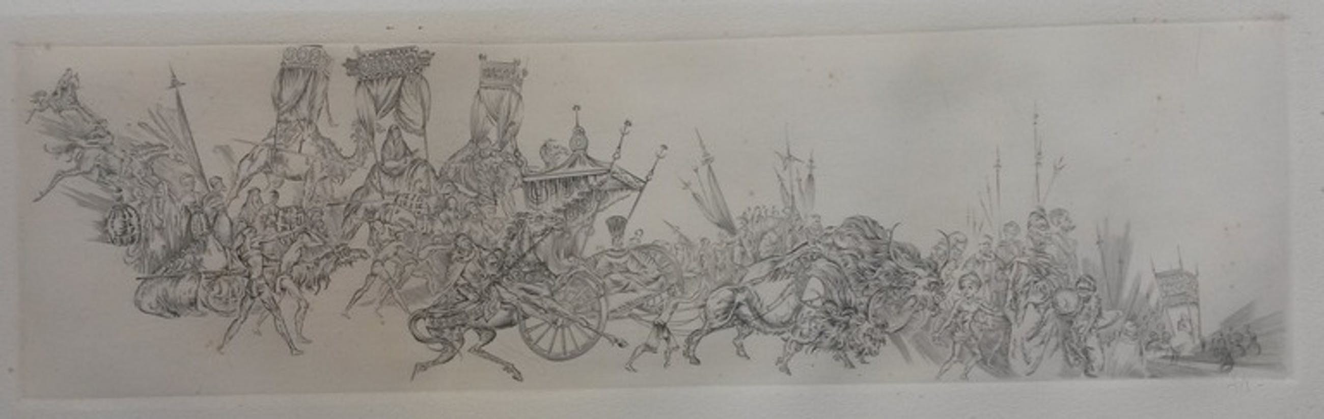 Detail- en fantasierijke ets, met een afbeelding van een exotische optocht. De ets is met potlood gemonogrammeerd AK. De maker is mij niet bekend, maar is een vaardige etser. Het blad geschept papier is 21,5 x 47 cm, de afbeelding 11 x 39 cm. De conditie is matig. Er zijn oxidatievlekjes en de ets is egaal vergeeld (zie foto's).