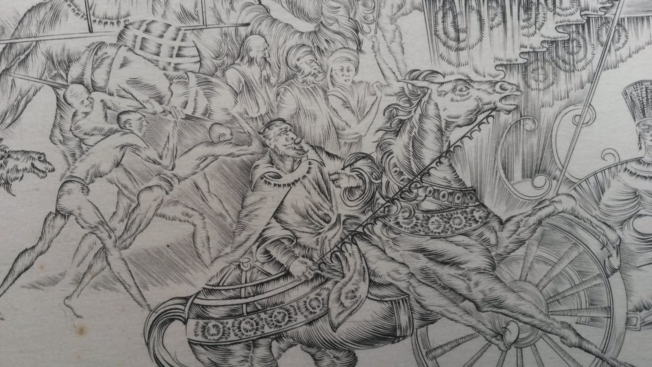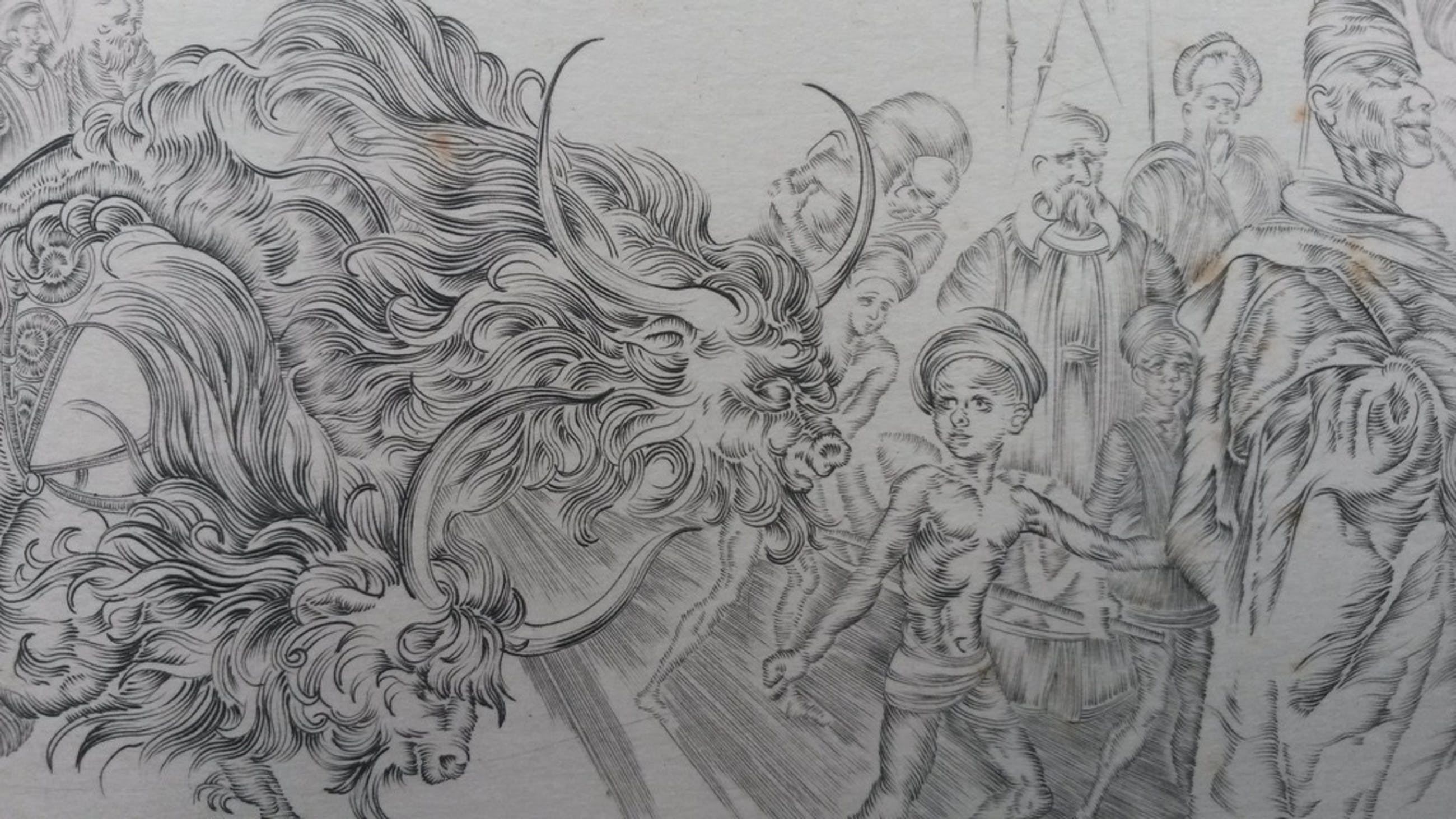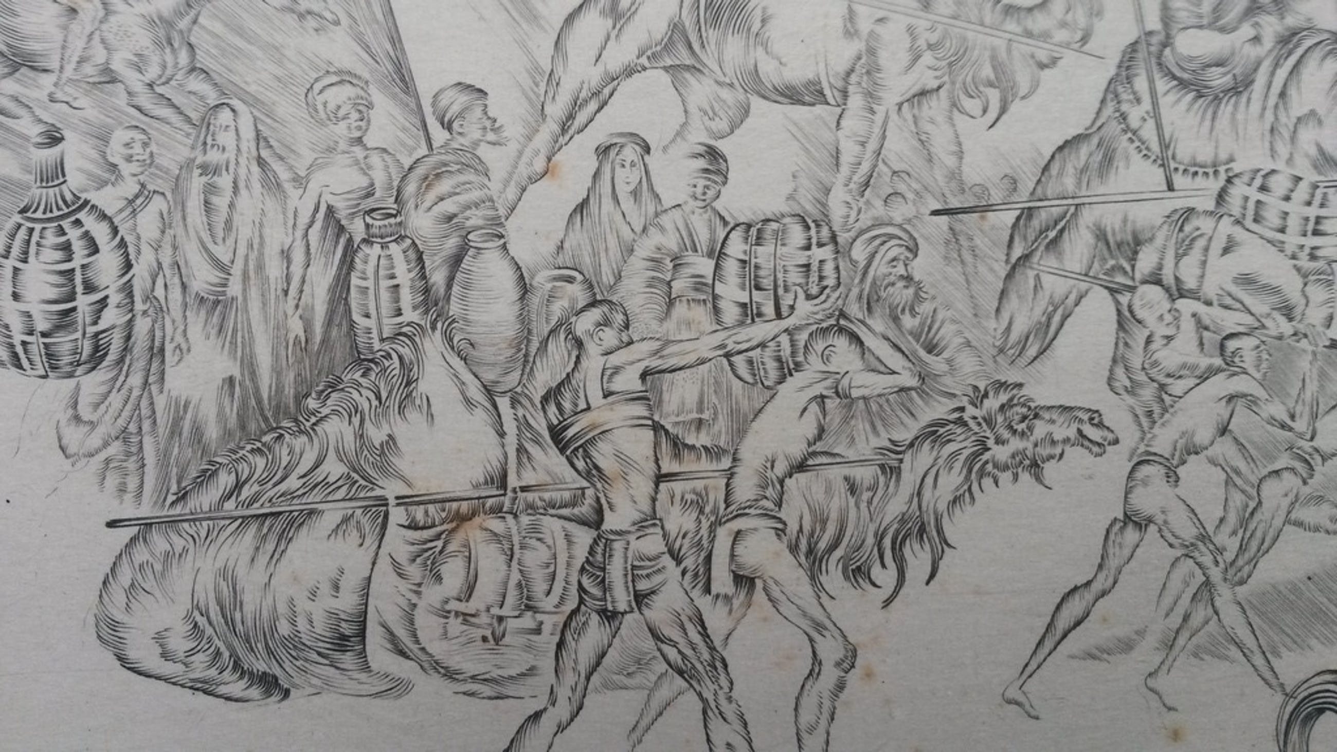 Detail- en fantasierijke ets, met een afbeelding van een exotische optocht. De ets is met potlood gemonogrammeerd AK. De maker is mij niet bekend, maar is een vaardige etser. Het blad geschept papier is 21,5 x 47 cm, de afbeelding 11 x 39 cm. De conditie is matig. Er zijn oxidatievlekjes en de ets is egaal vergeeld (zie foto's).