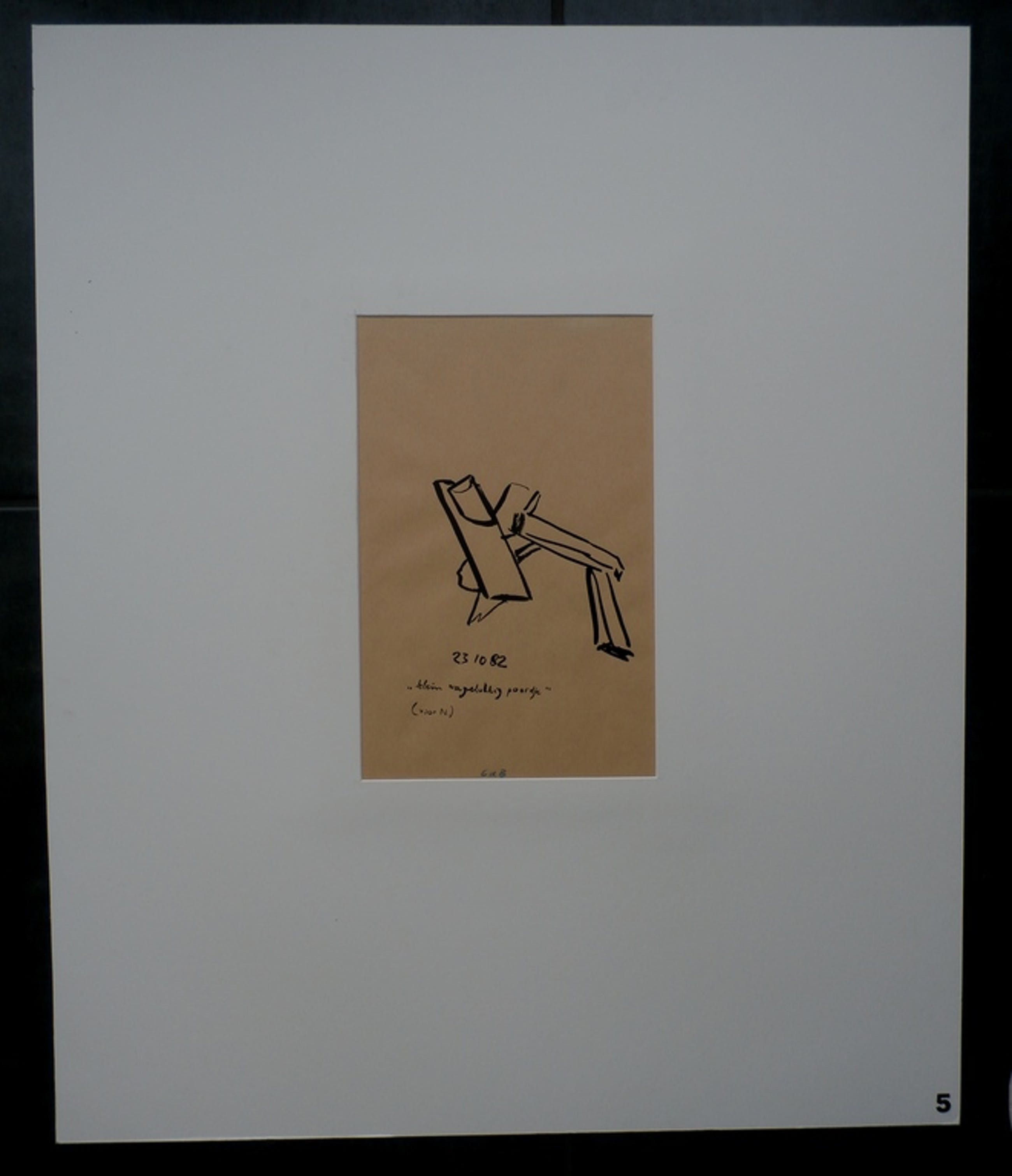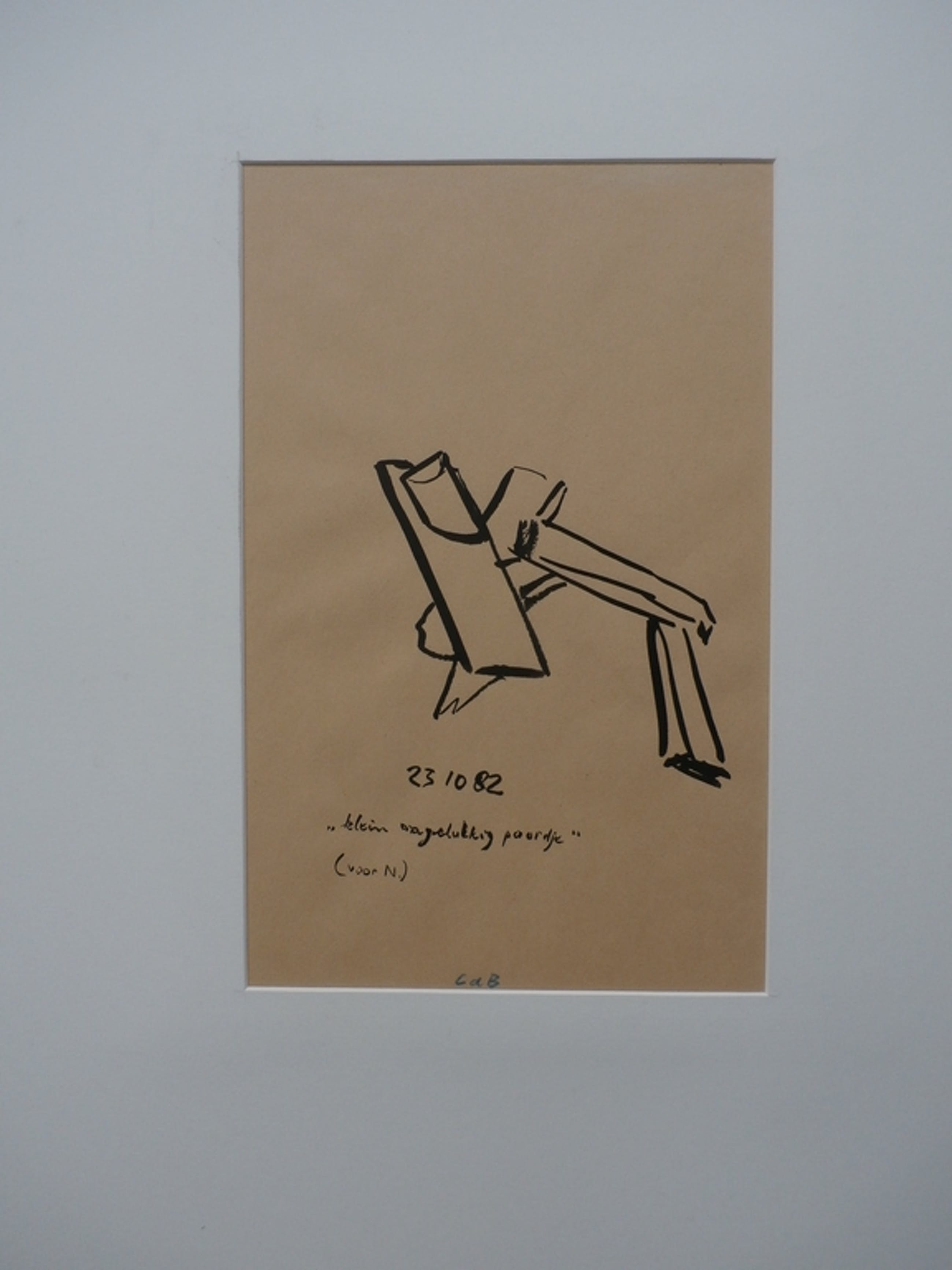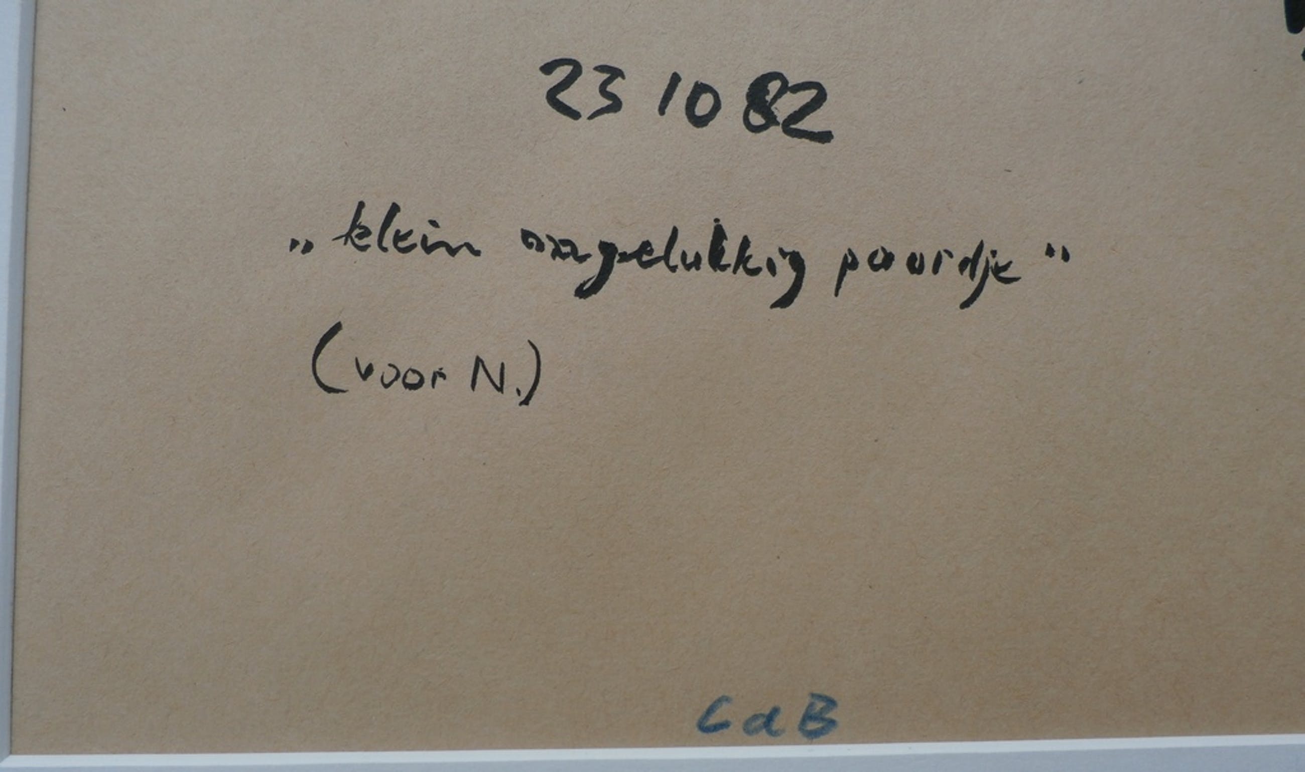 Inkttekening van een (voor mij)onbekende kunstenaar. Voor mij niet bekend, maar misschien weet een van u wie dit betreft? Titel: "Klein ongelukkig paardje"(voor N). Jaar: 23-10-1982. Middenonder met potlood gesigneerd door de kunstenaar. Afmetingen blad incl passepartout: H71 x b60 cm. Afmetingen voorstelling: H29.5 x b19. Conditie: in goede staat