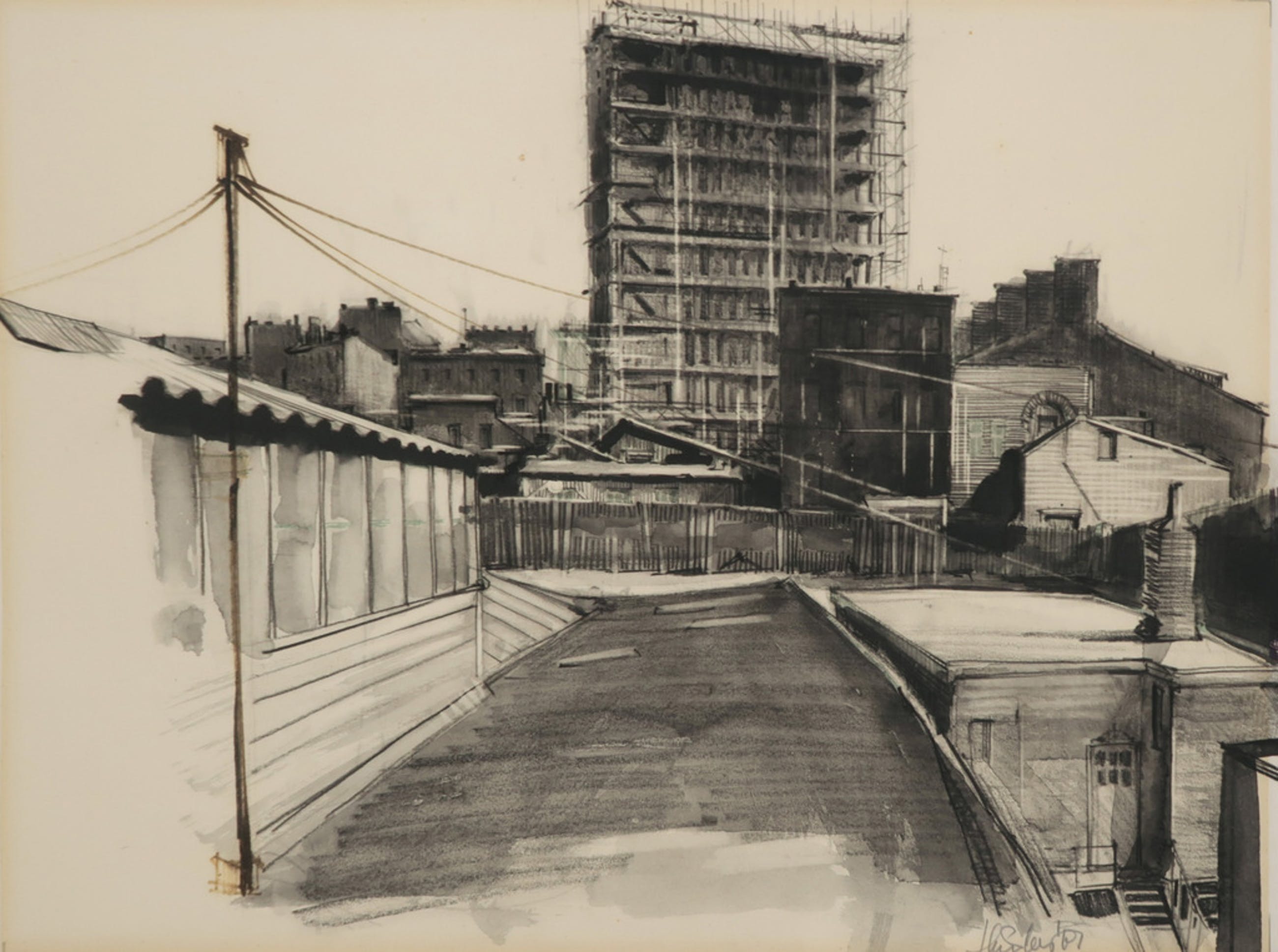 Conditie: In goede staat. Het beeld is verkleurd door een eerdere inlijsting. Rondom de randen van het blad zit bruin tape. Bij opnieuw inlijsten niet meer zichtbaar. In het beeld zitten enkele lichte vegen. Het beeld is gemaakt met krijt, en dat veegt gemakkelijk uit.