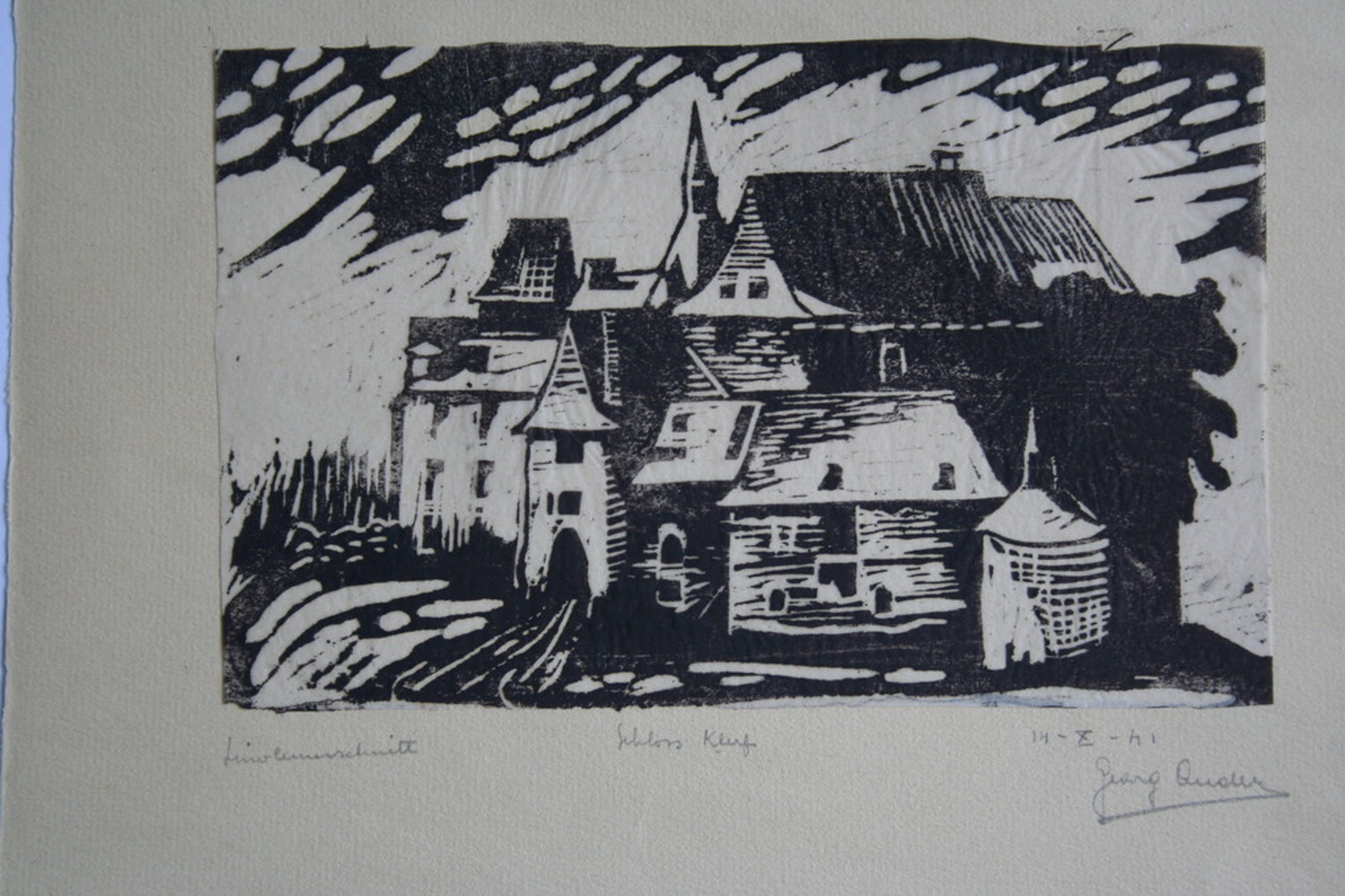 Linosnede op rijstpapier bevestigd op een vel. Gesigneerd, niet goed leesbaar. Bijgeschreven is 14 - X - h1. Afbeelding van het slot Clerf (schrijfwijze Klerf) aan de rivier de Klerf, Duitsland.