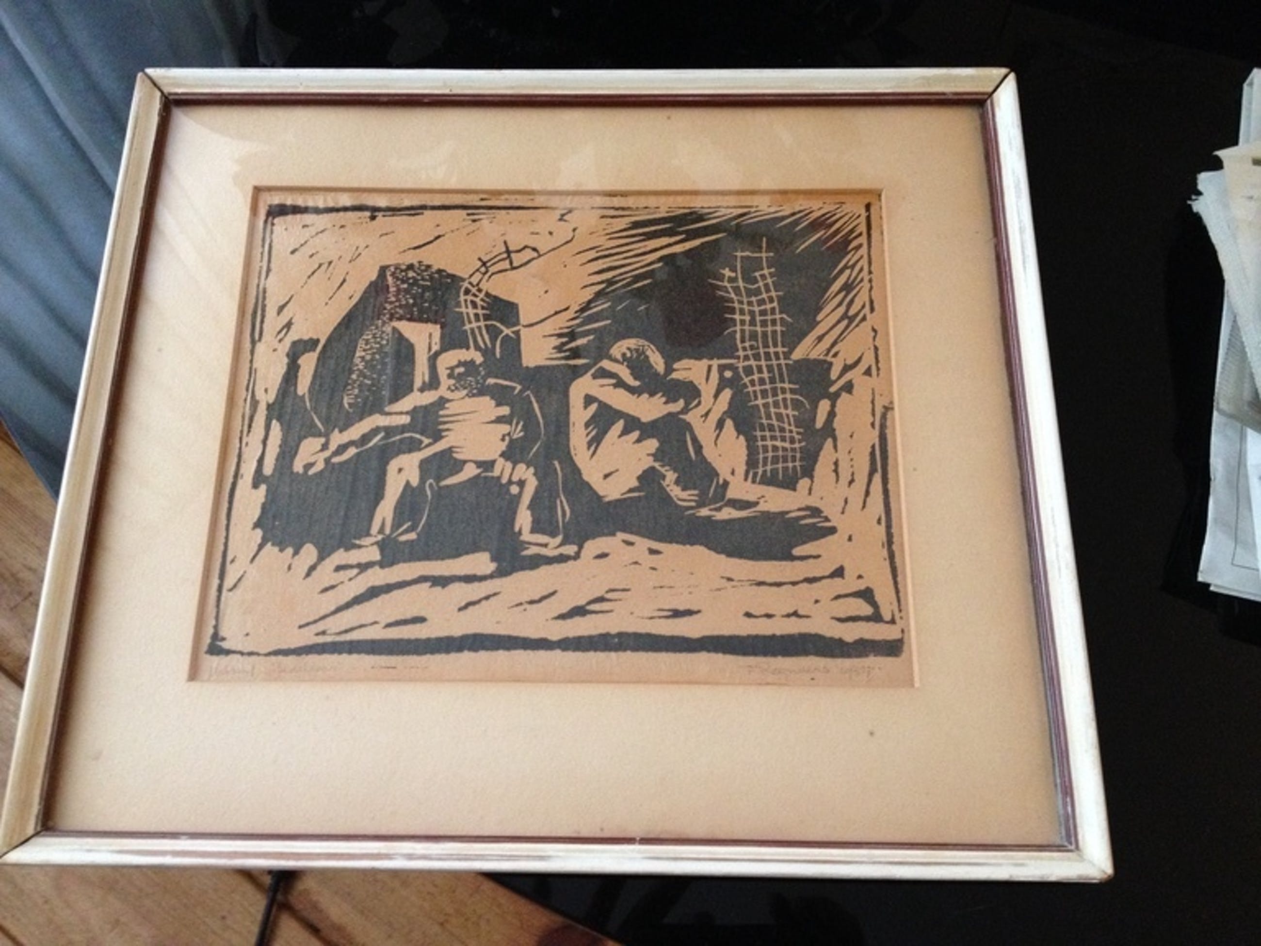 Onbekend - Onbekende kunstenaar: Motief “Bedelaars”, linosnede, 1954 - Verkocht