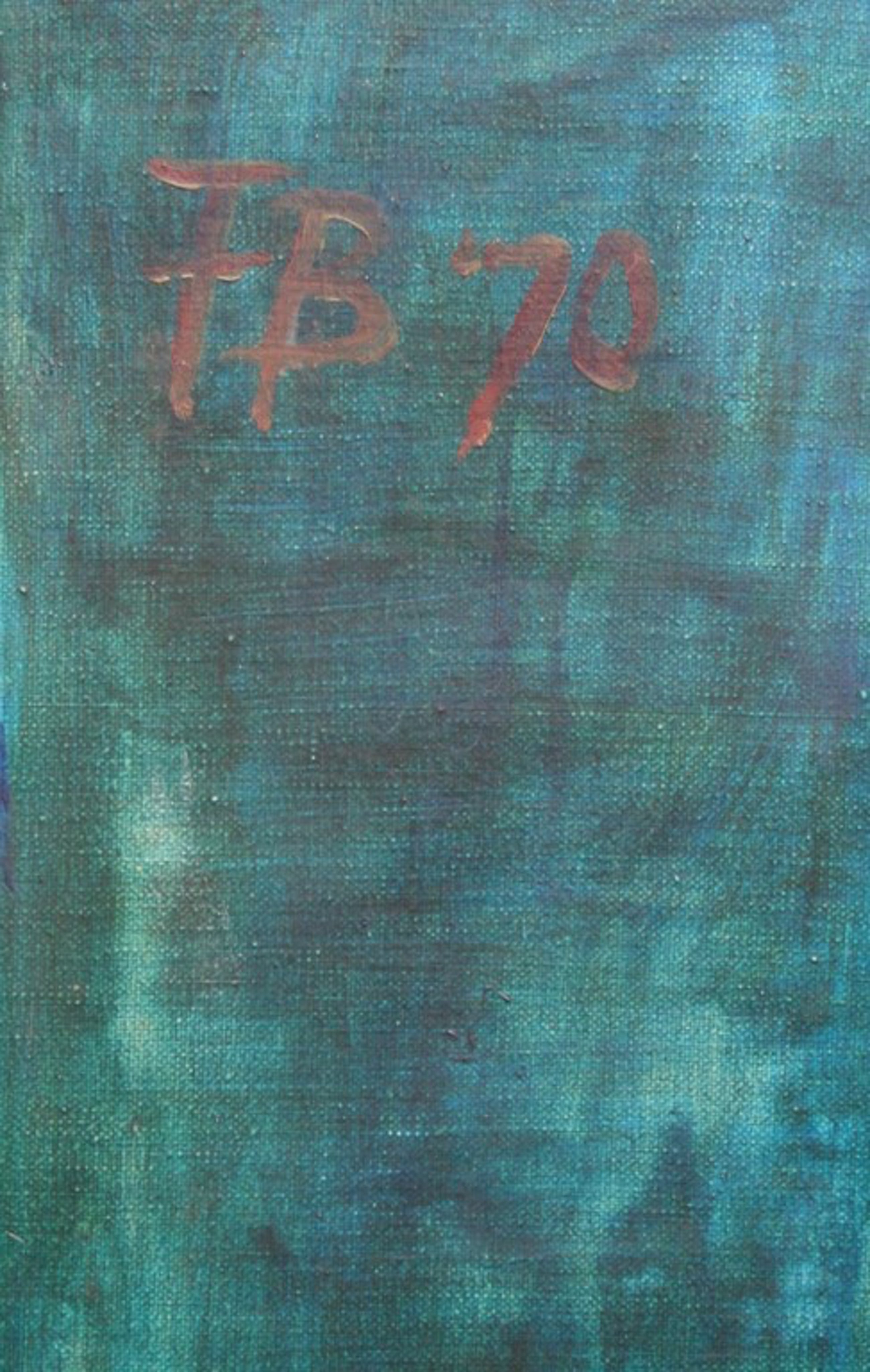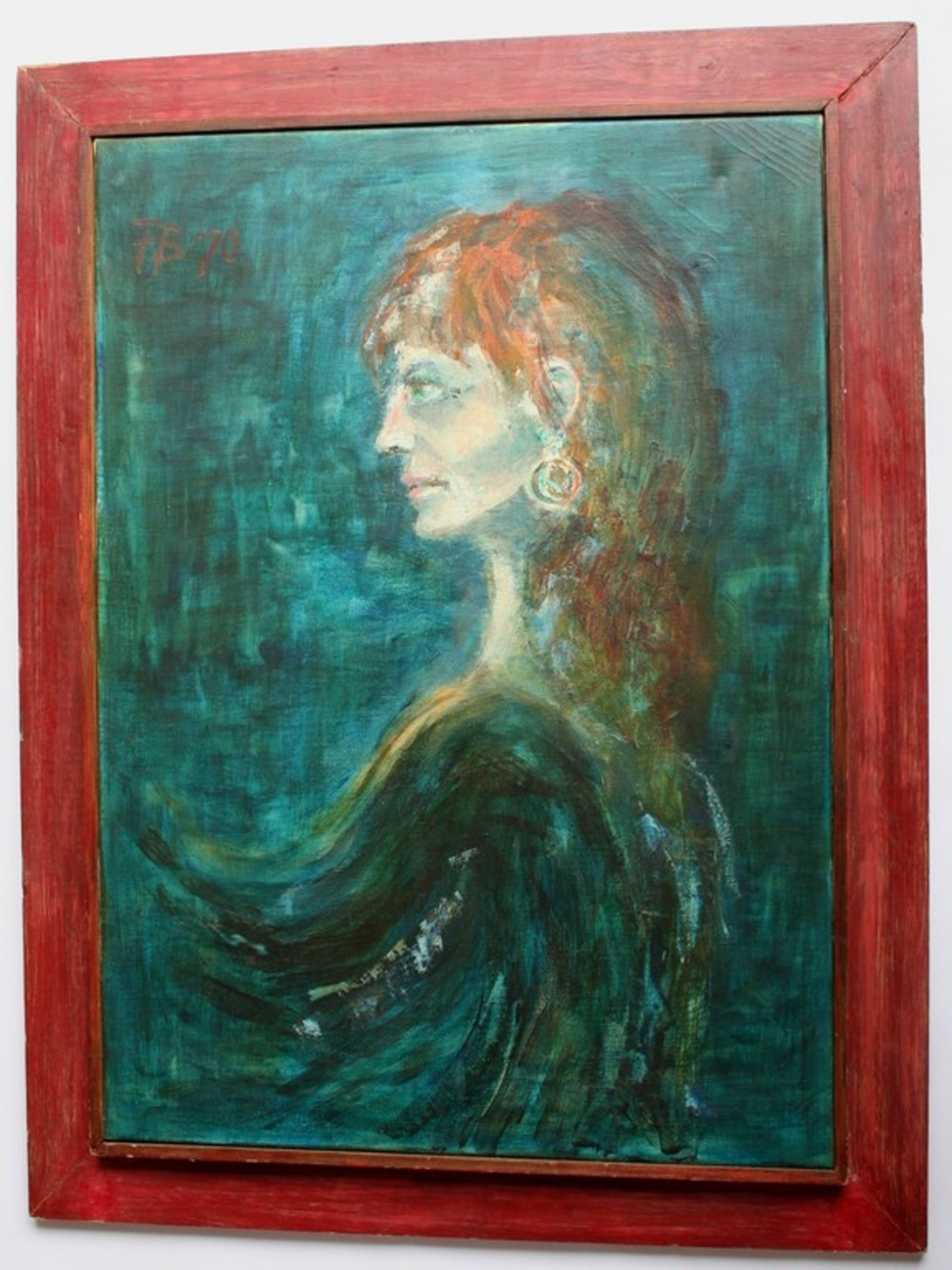 Olieverfschilderij, portret van een vrouw, ingelijst in houten lijst (met lichte gebruikssporen). Schilderij is gesigneerd links boven met monogram FB en ' 70. Het doek heeft enig craquele en twee deukjes die zijn verstevigd aan de achterzijde.