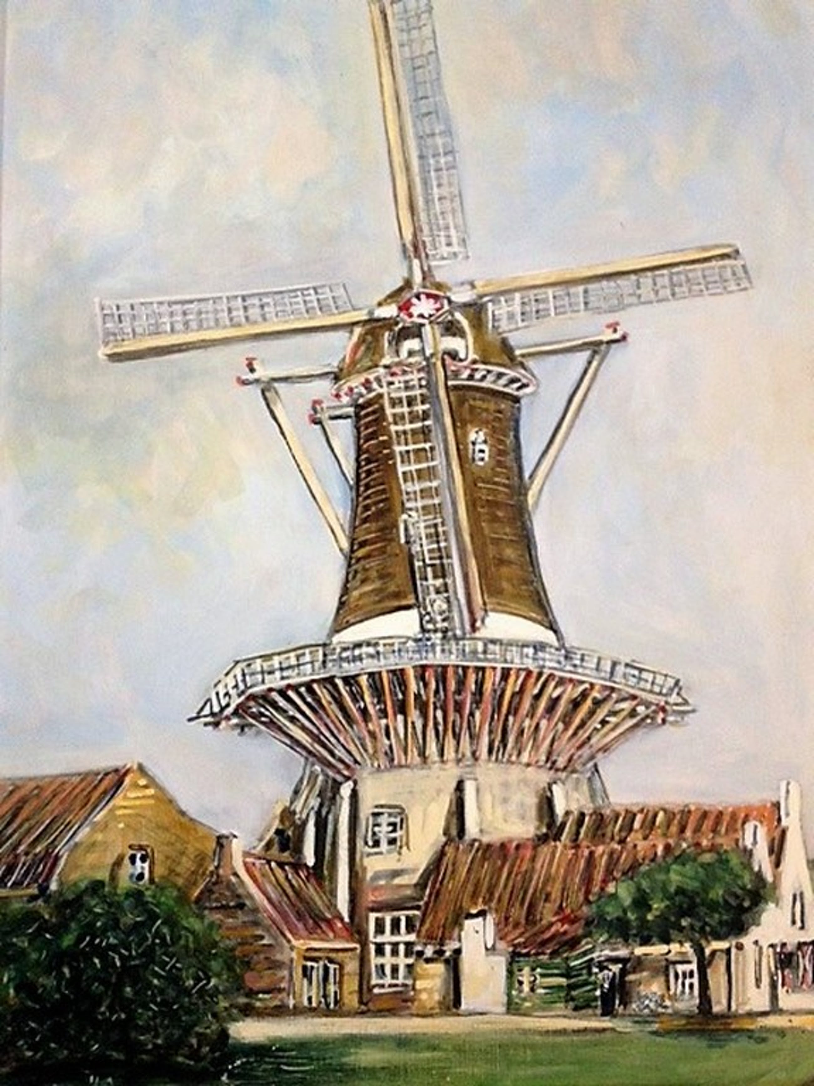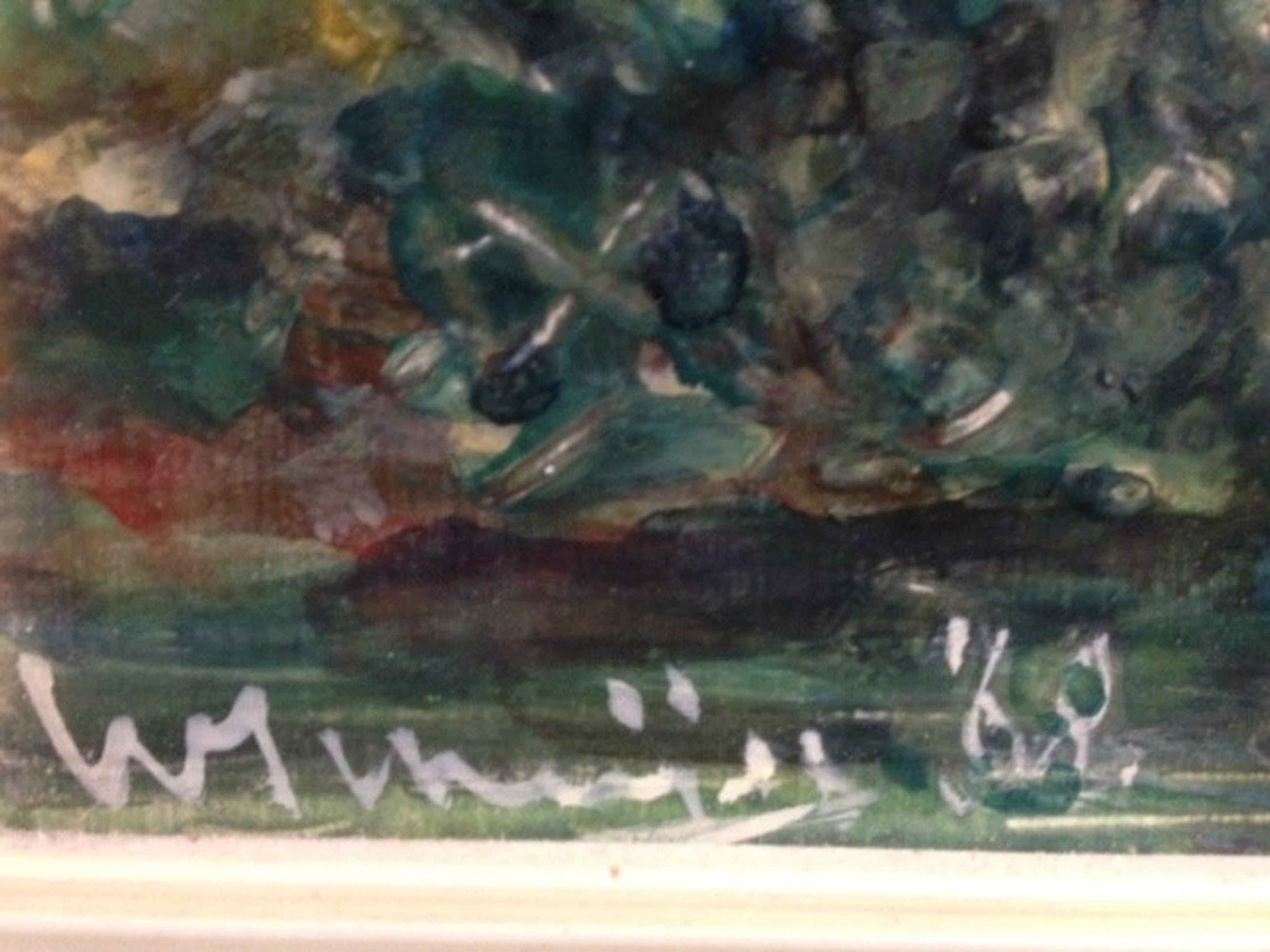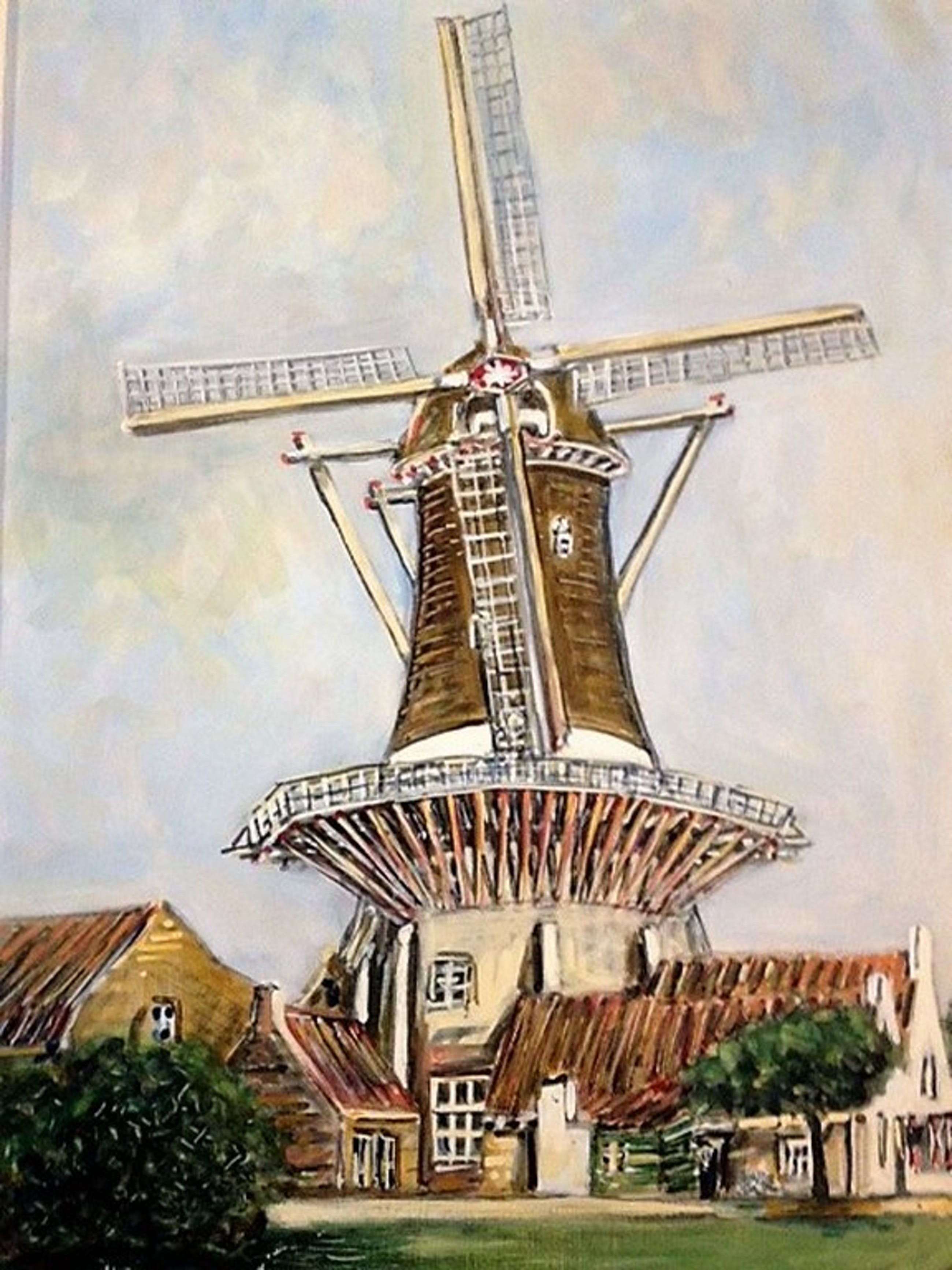 Molen "Windlust" Wassenaar. De naam van de kunstenaar is niet goed leesbaar, zie foto. Geschilderd in 1968. Techniek: olieverf op paneel. Gesigneerd aan de linker onderzijde. De afmetingen van het paneel zijn: 36 cm x 46 cm. Inclusief de lijst zijn de afmetingen: 43,5 cm x 52,5 cm. De lijst heeft gebruikssporen. Dit werk is afkomstig van een kunsthandel uit Wassenaar.