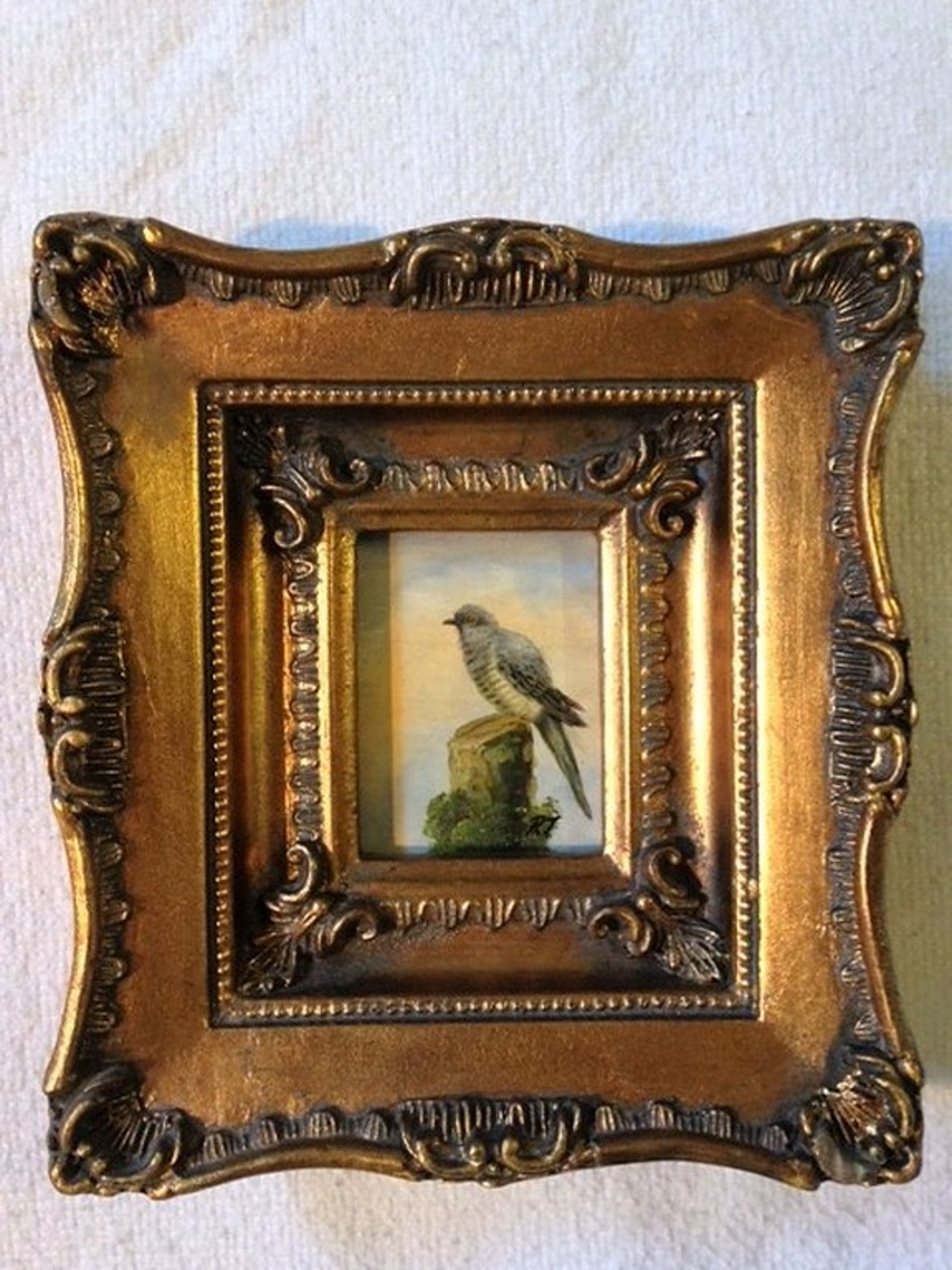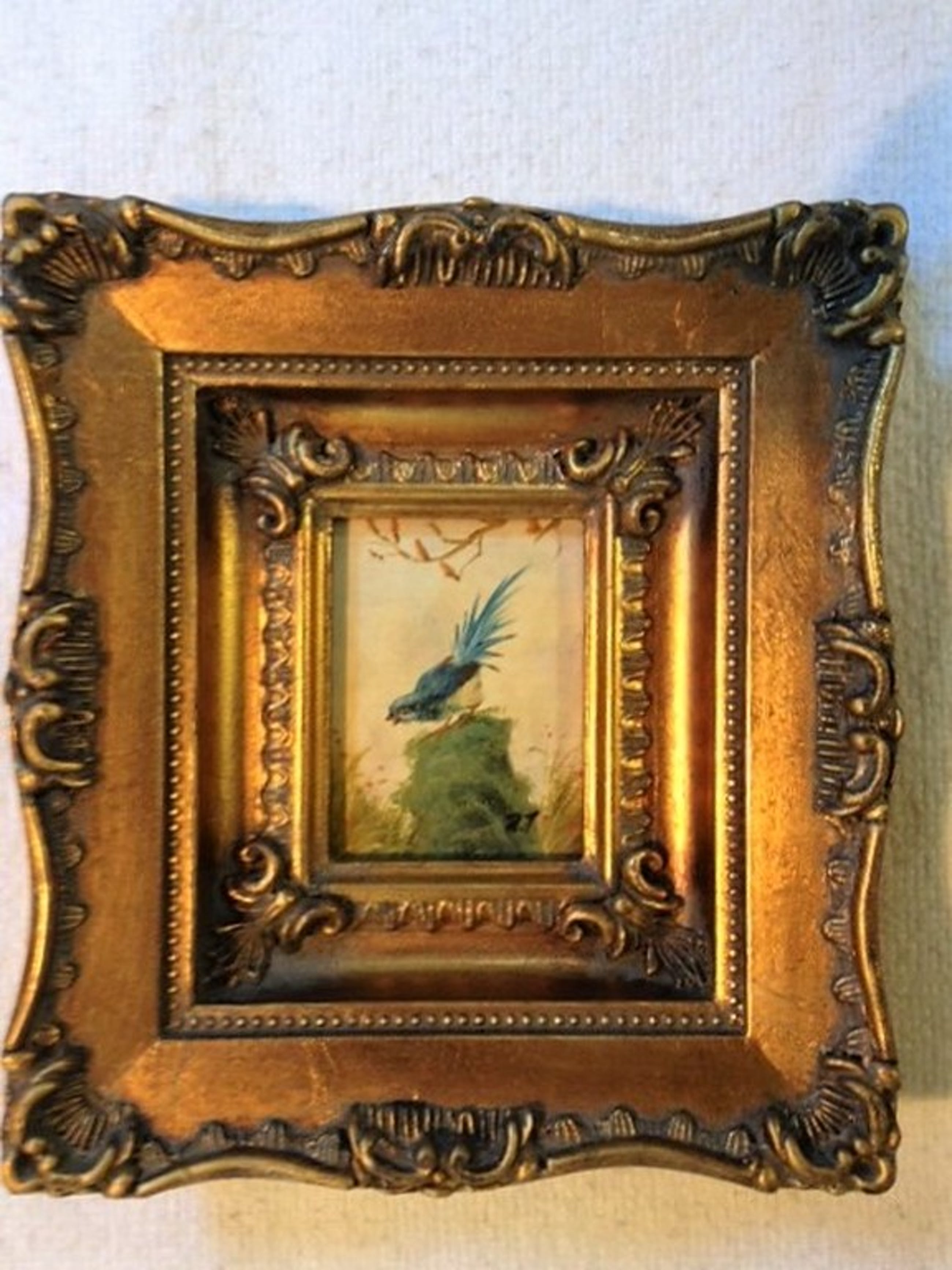 Pendant van twee verschillende vogels. De naam van de kunstenaar is onbekend, alleen monogram: R.T. Techniek: olieverf op paneel. Beide gesigneerd aan de rechter onderzijde. De afmetingen van beide panelen zijn: 7 cm x 9 cm. Inclusief de fraaie lijsten zijn de afmetingen voor beide werken: 19 cm x 21 cm. Verkeren in een bijzonder mooie staat.