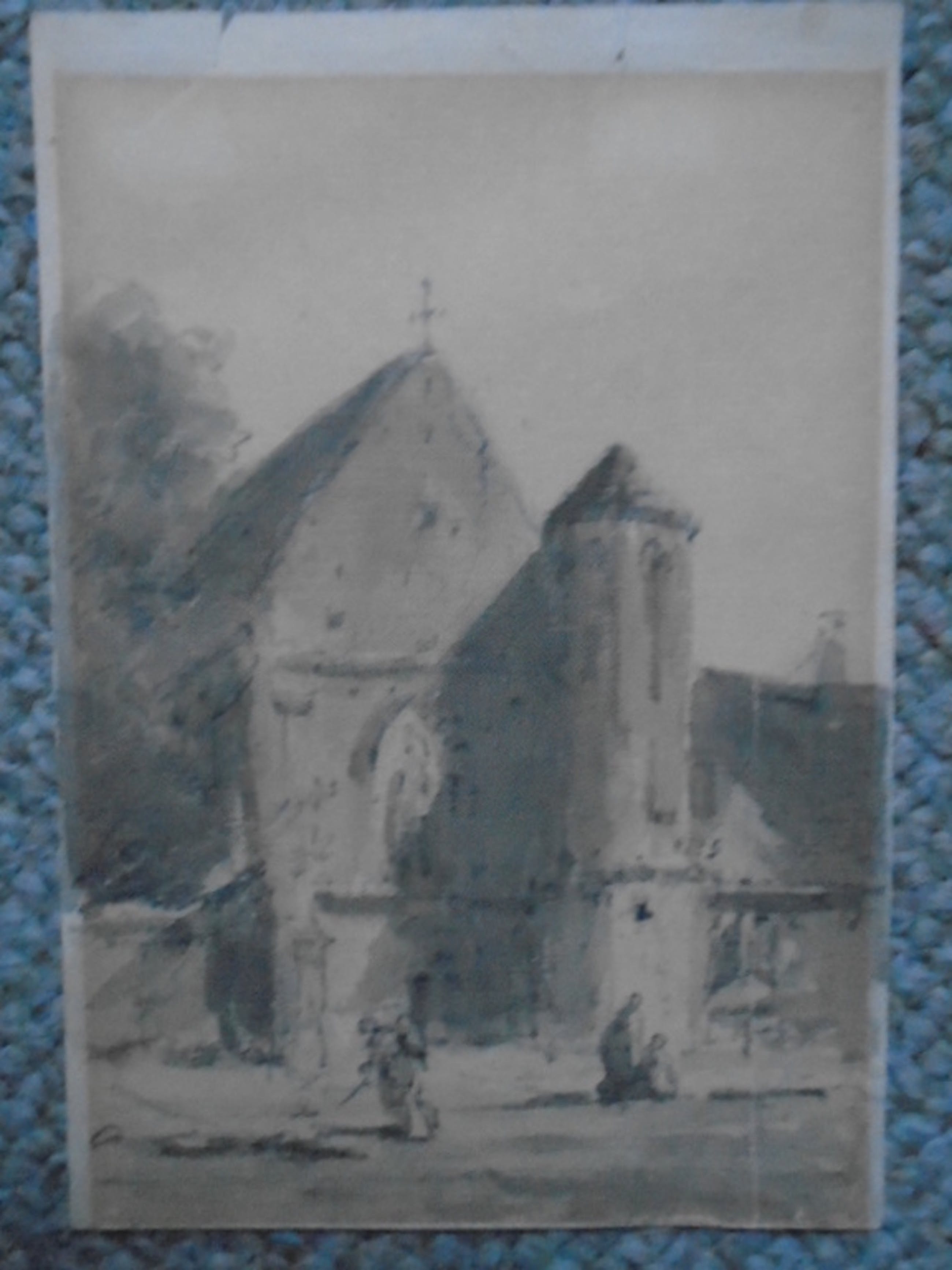 Beeld- en bladmaat 14,5 x 10 cm. Aan achterzijde schets van een gebouw.