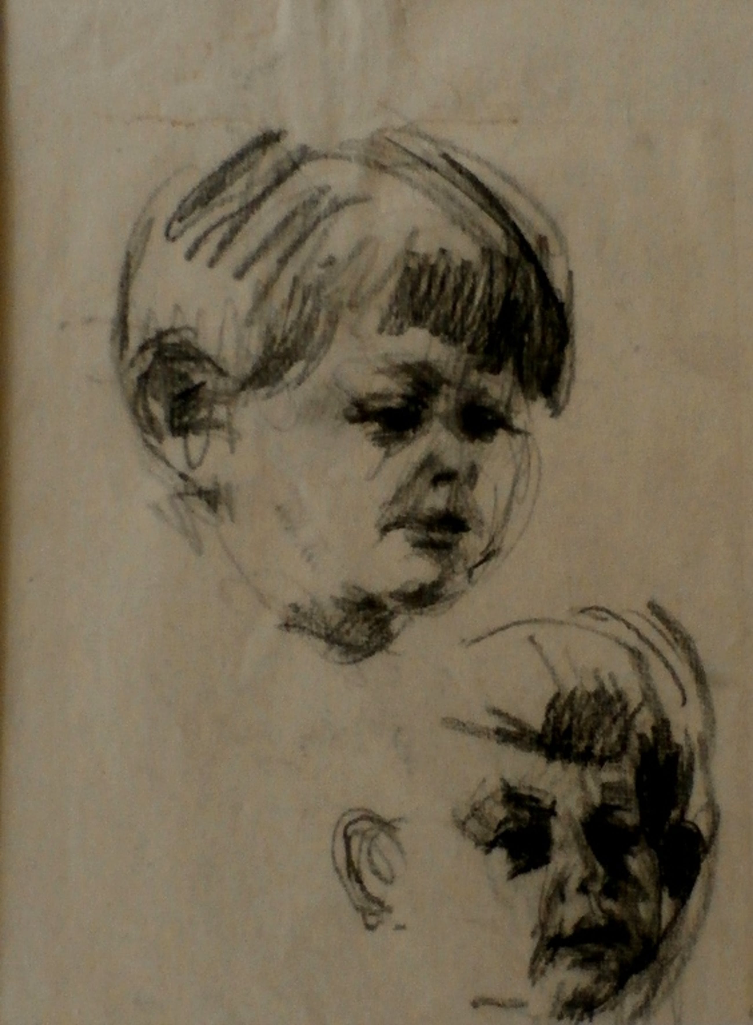 Houtskooltekening van onbekende kunstenaar: 2 kinderen. Afmetingen beeld: h33,5 x b25 cm. De tekening is niet gesigneerd. Er zit midden boven een plek met waterschade.