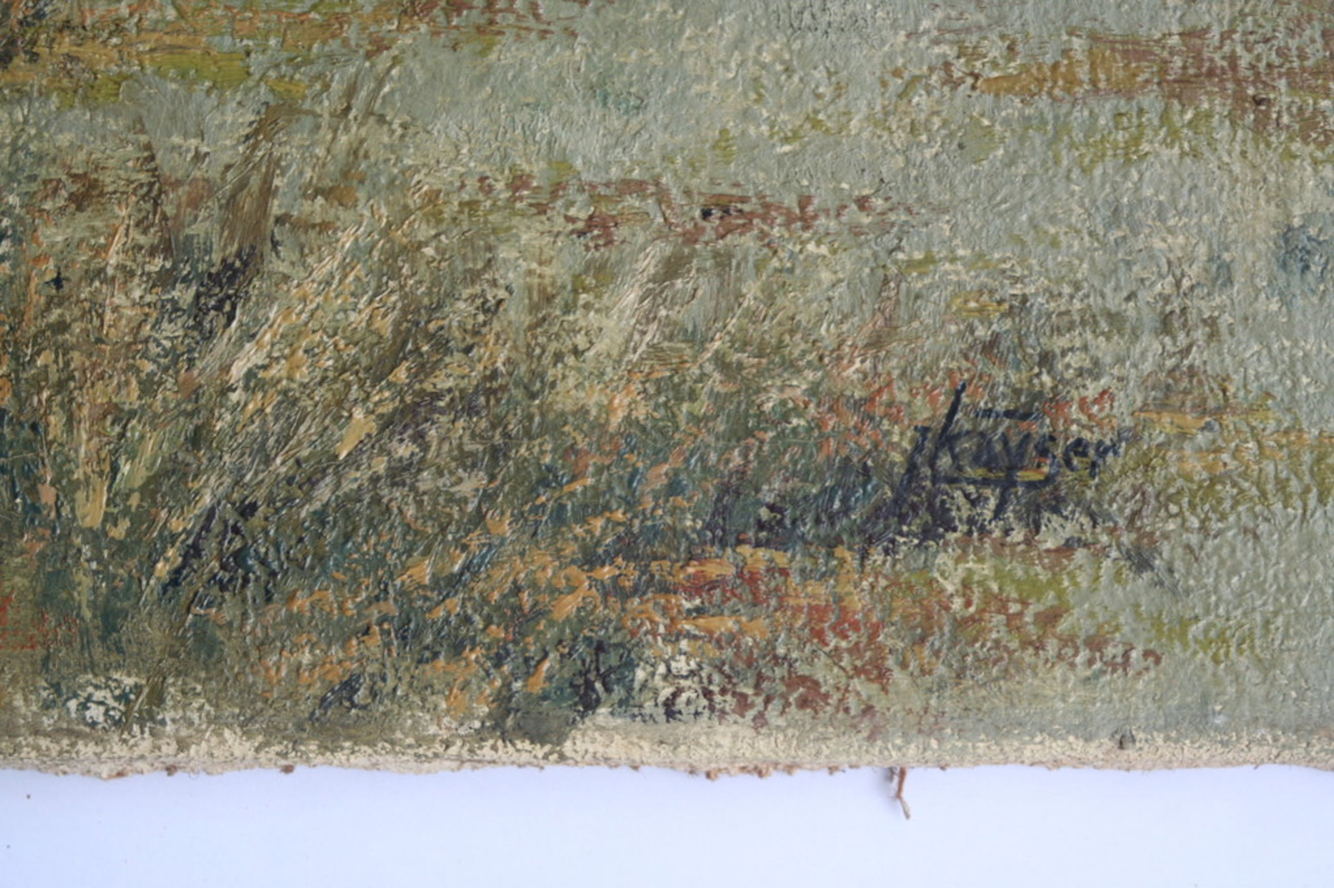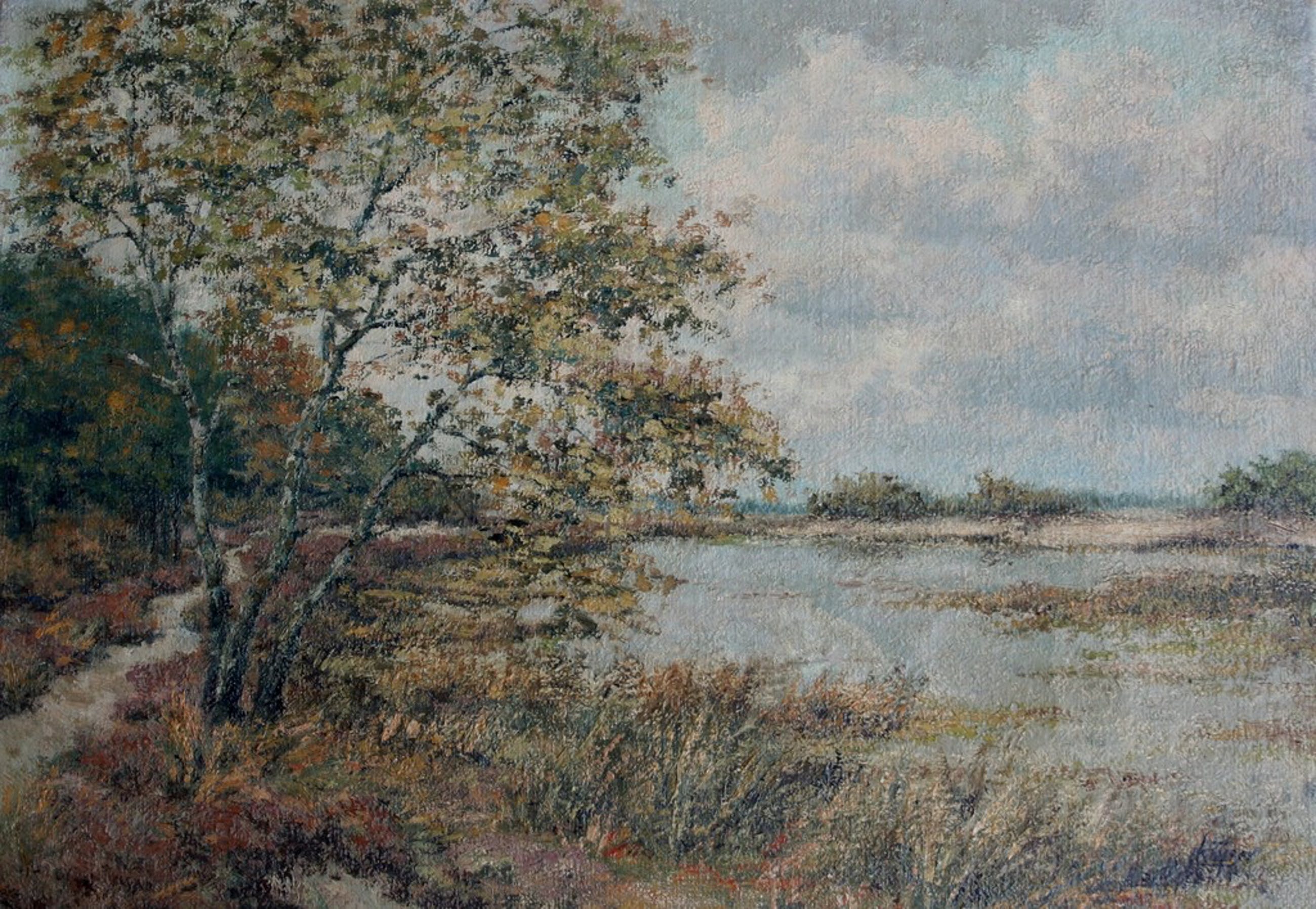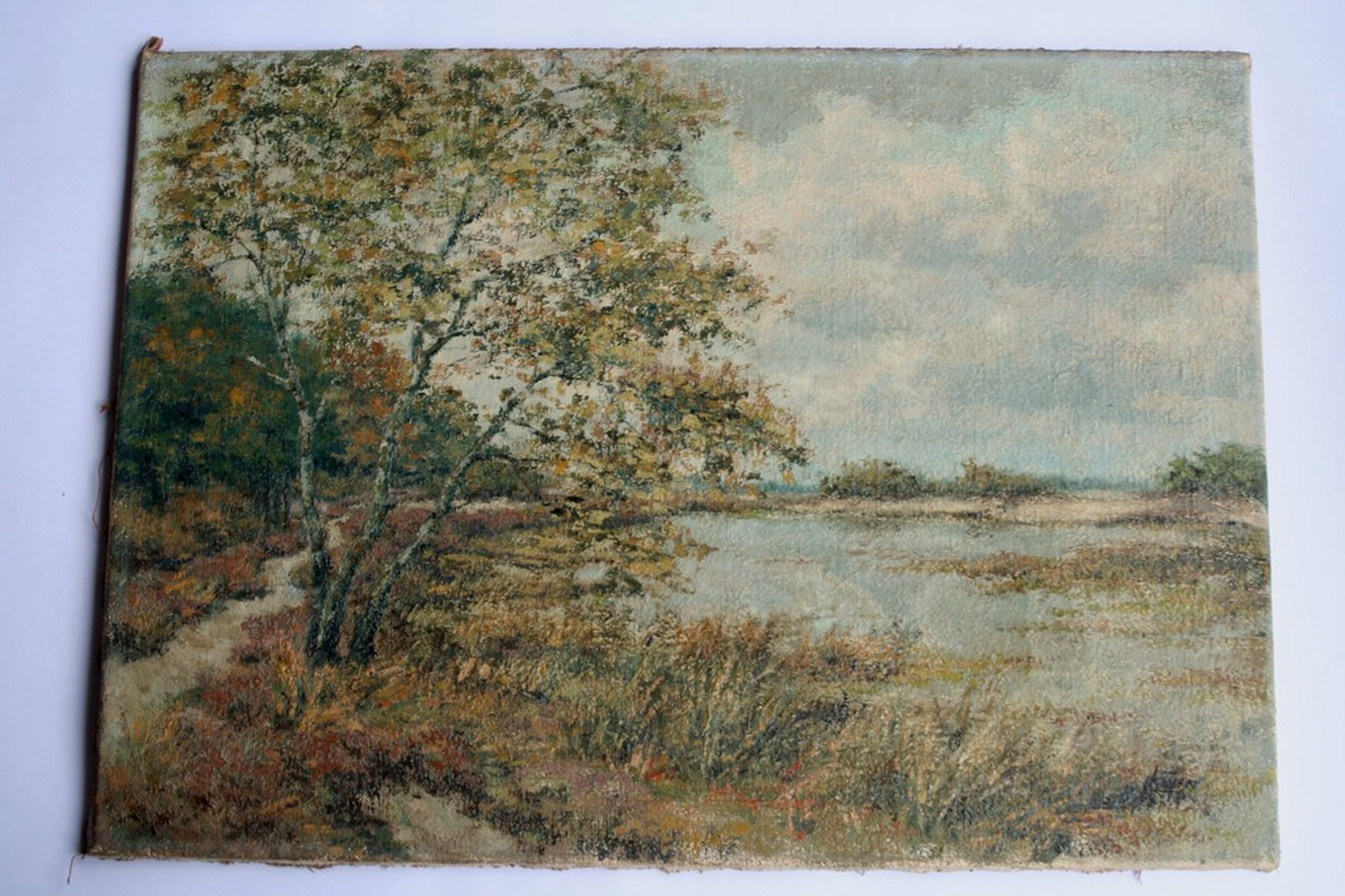 Olieverf schilderij op doek zonder lijst. Gesigneerd, handtekening niet goed leesbaar. Voorstelling van een berk langs een zandpad en een ven. Afmeting 50 x 70 cm.
