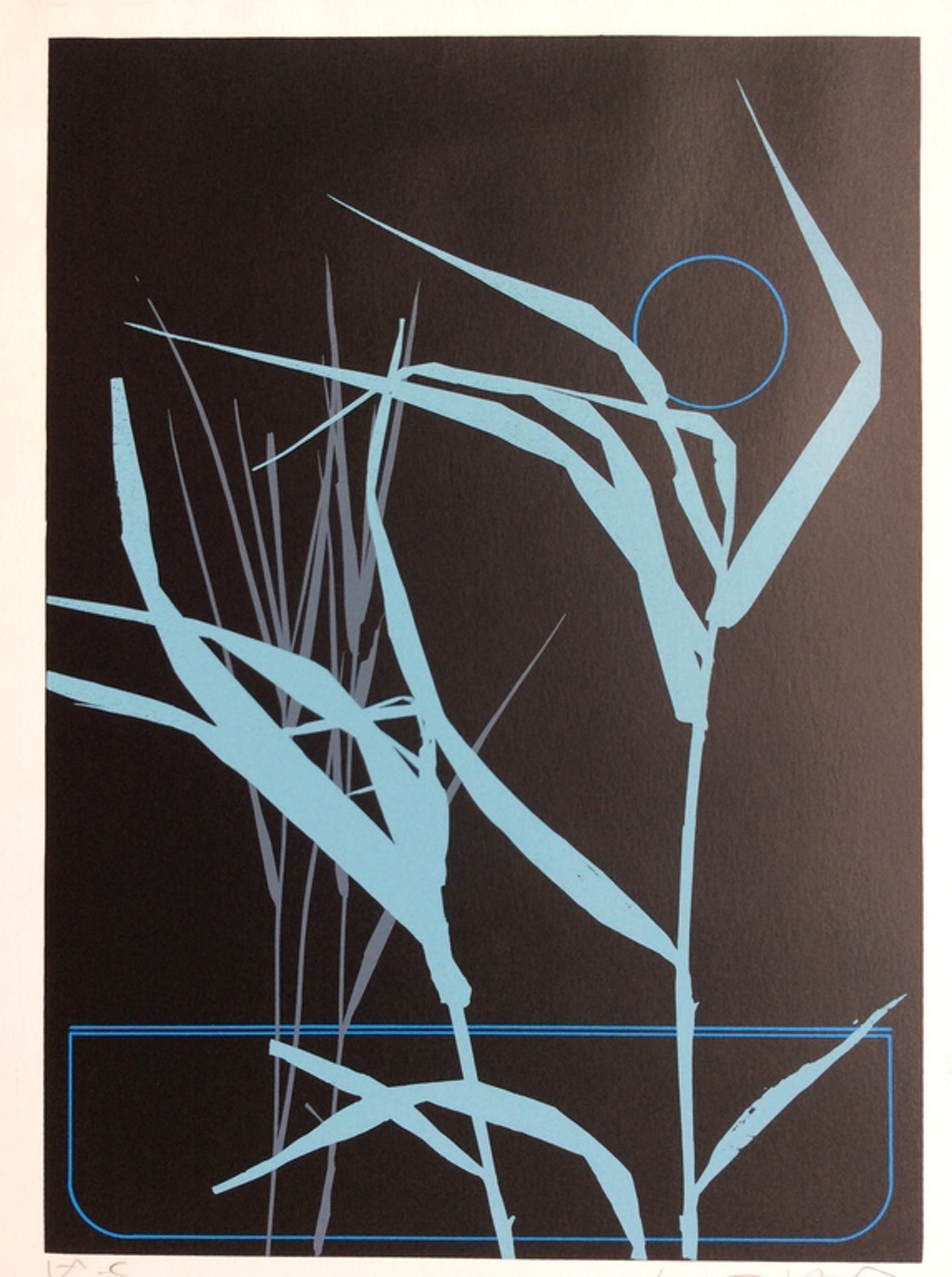 Uit het grafische arsenaal van het Frans Masereel Centrum in het Belgische Kasterlee: zeefdruk met voorstelling van riet aan de waterkant. Het werk vertoont sterke gelijkenis met dat van de kunstenaar Daniël Sciora. De zeefdruk is potlood gesigneerd en het betreft een artist proof exemplaar. Ca. 1980. Formaat incl. 36 x 50 cm. Afb. 30 x 42 cm. Voorzien van droogstempel van het Frans Masereel Centrum.