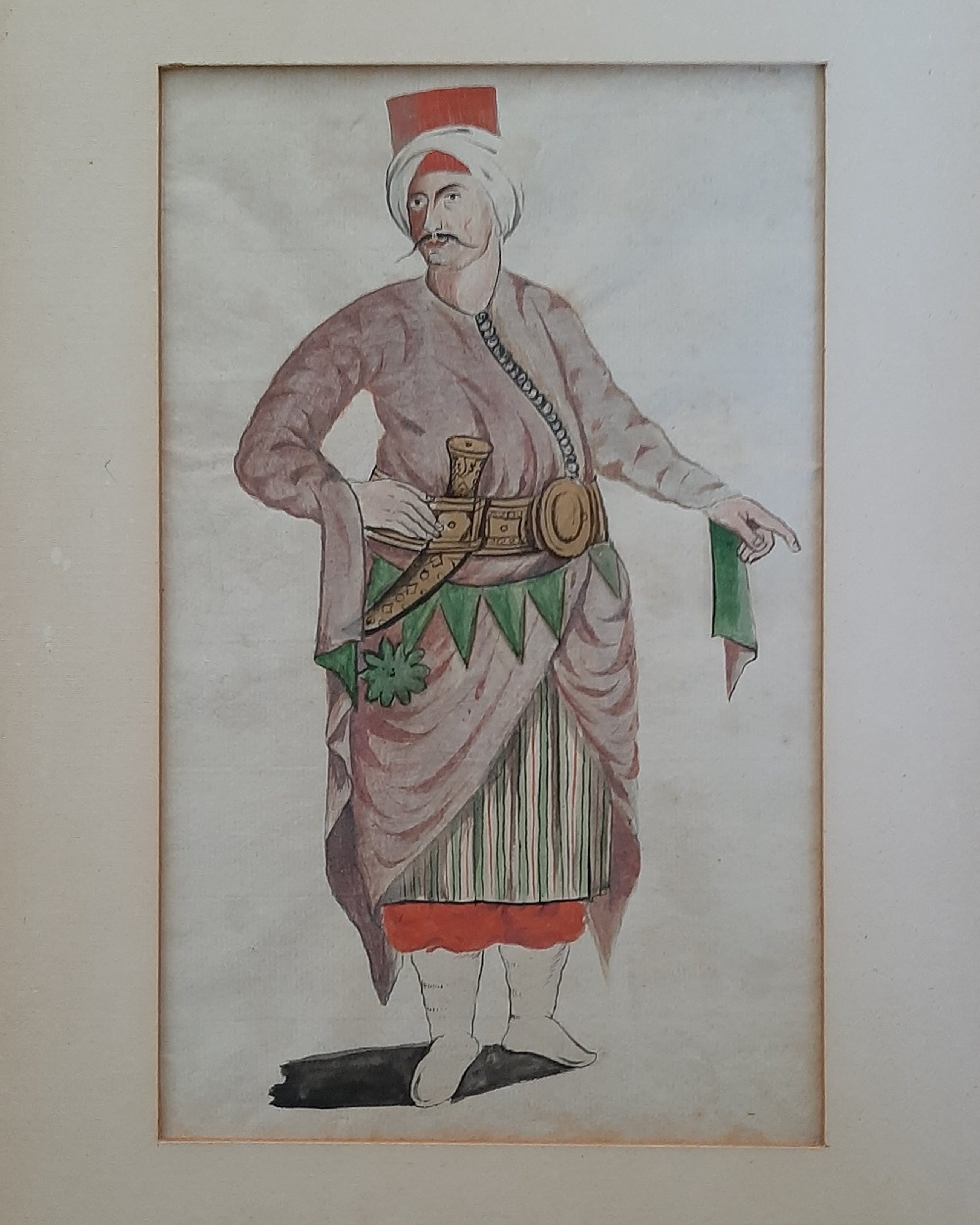 Prachtige antieke aquarel van een Perzische master in originele klederdracht. Riem en dolk zijn verhoogd met (blad?)goud. Op geschept papier geschilderd. Hopelijk biede naar waarde!!