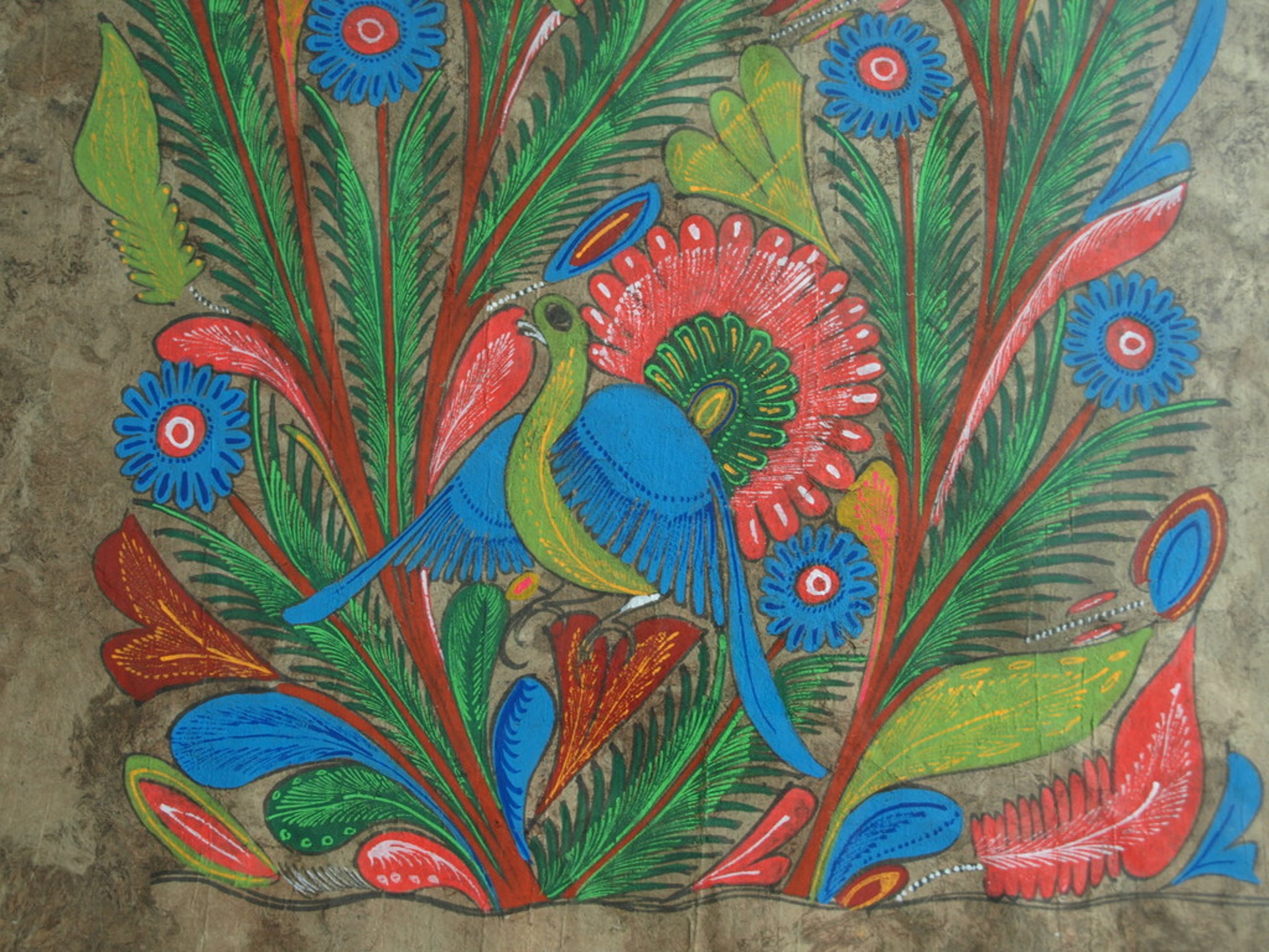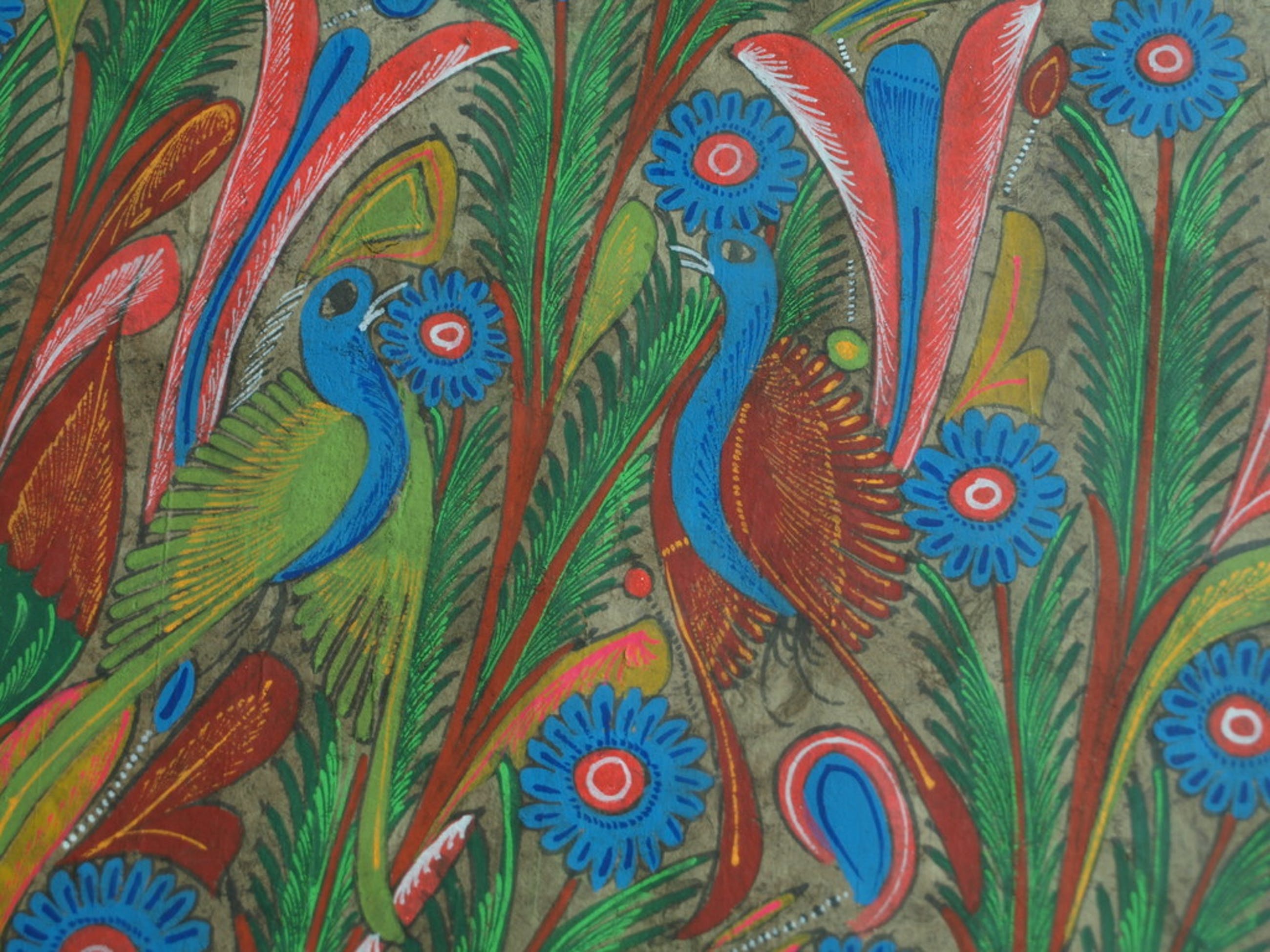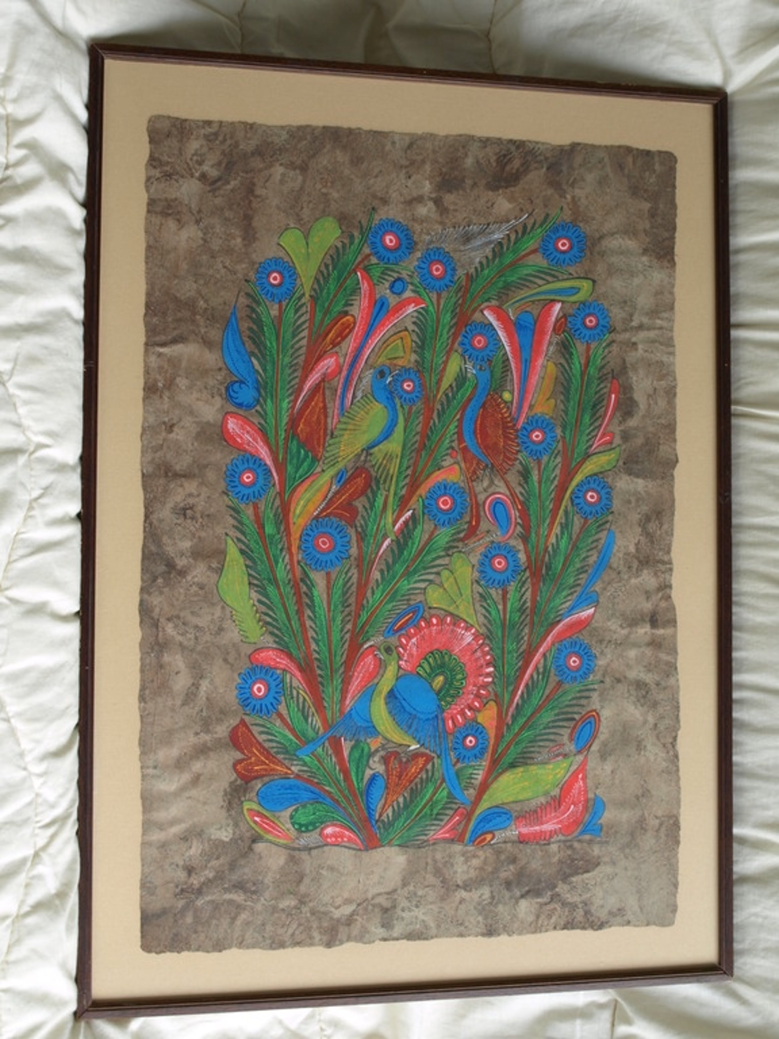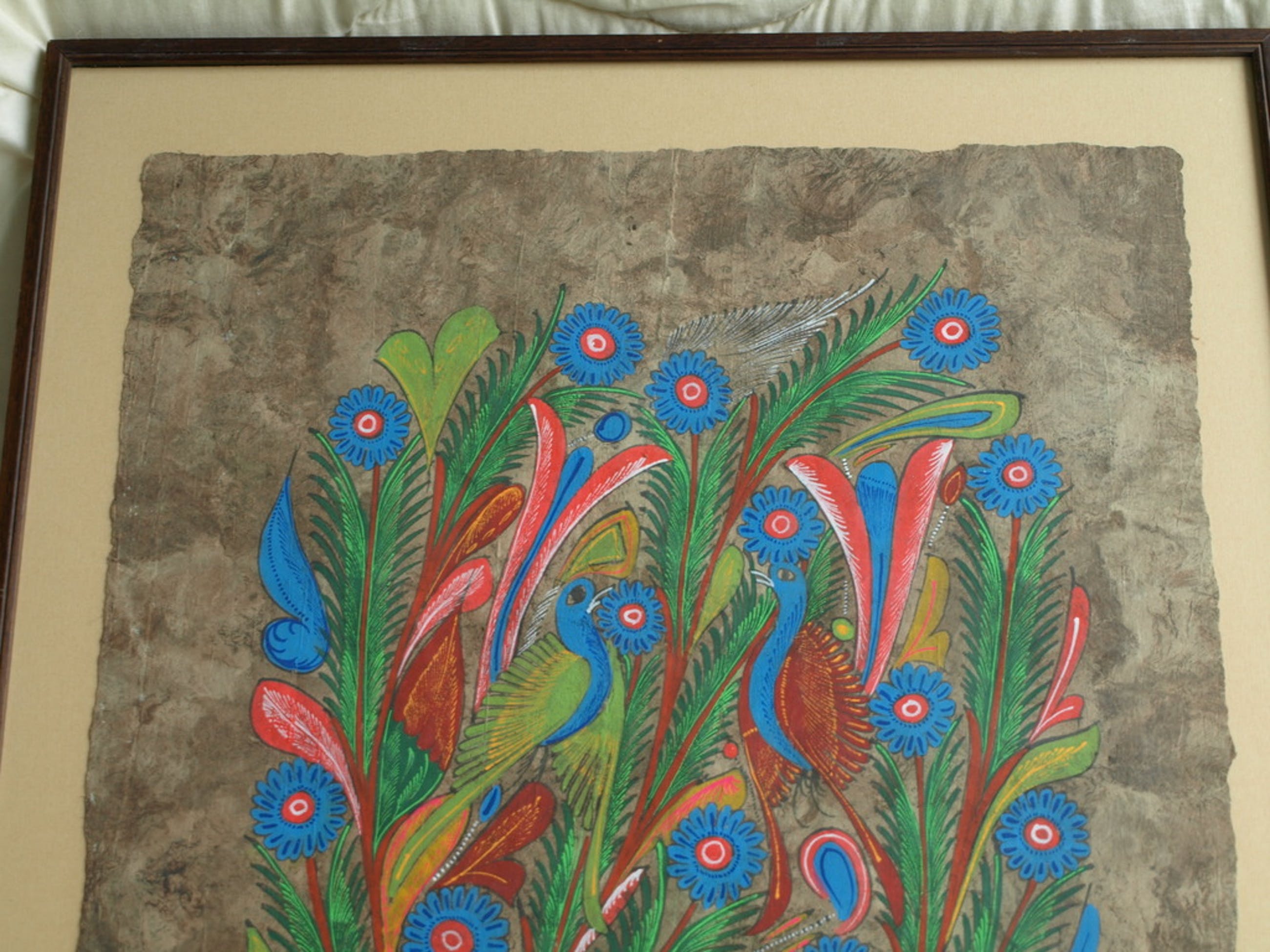 Een schilderij uit ca 1980 met een voorstelling van een aantal pauwen.