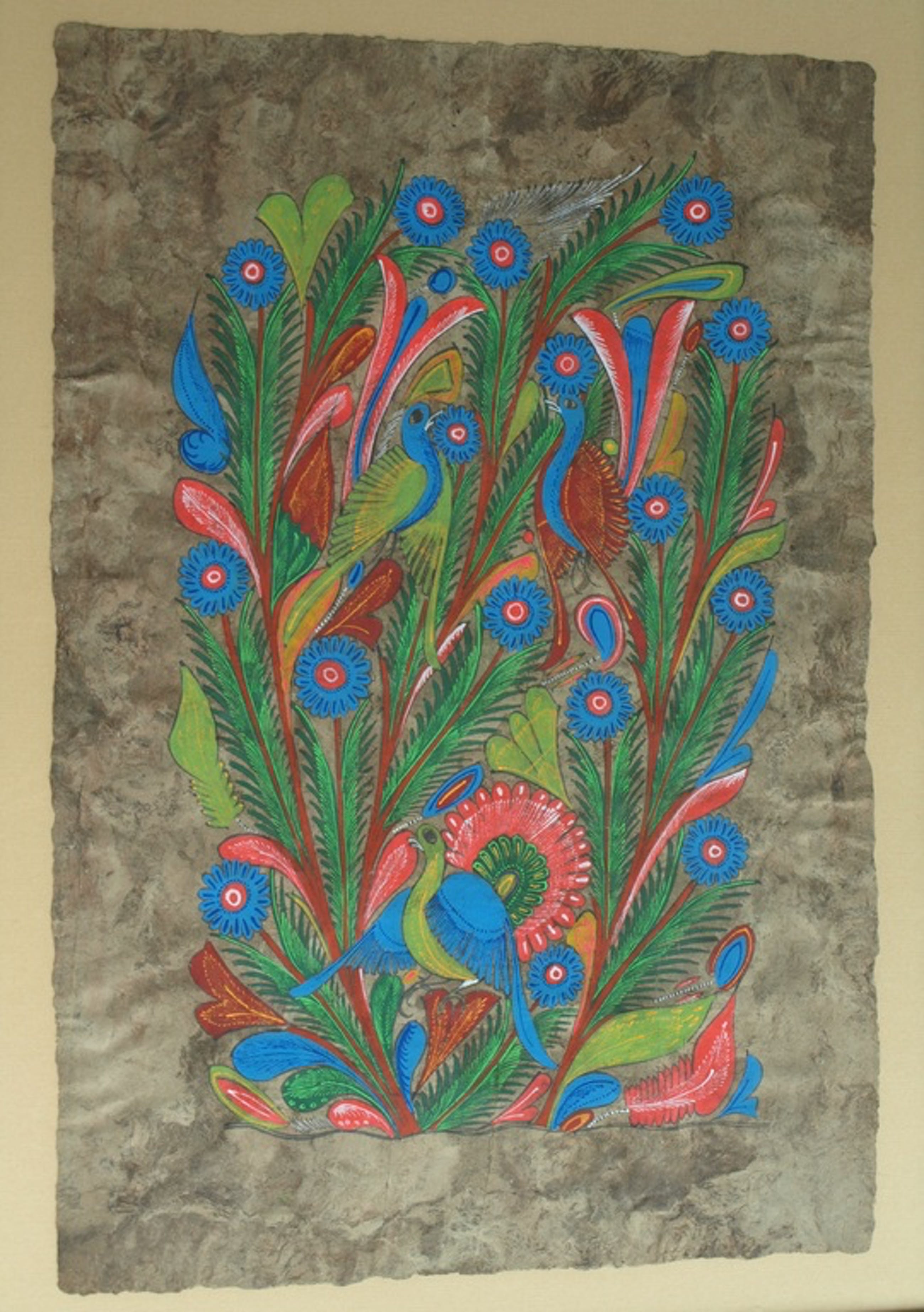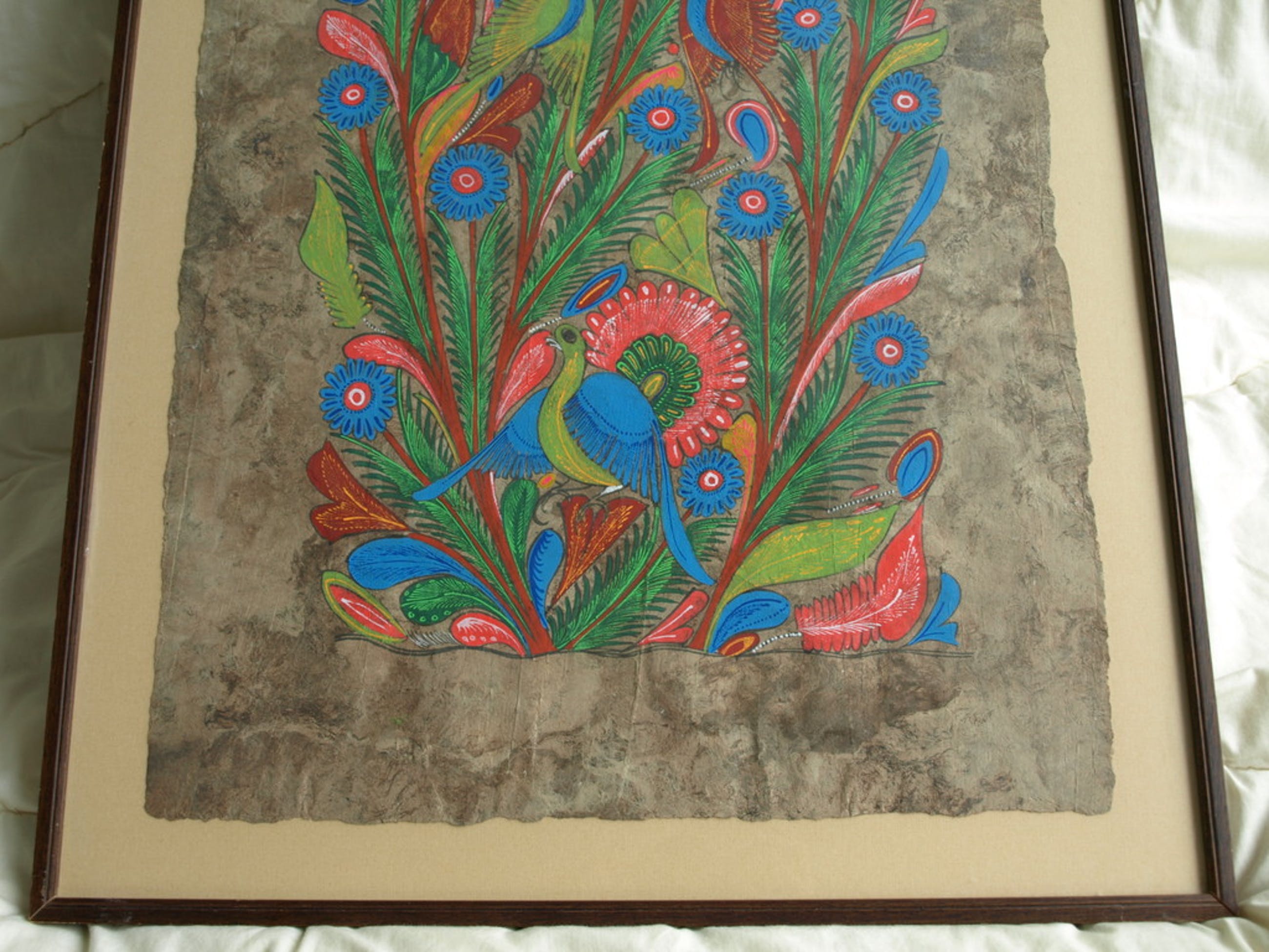 Geschilderd op zelfgeschept papier en goed ingelijst in een houten lijst met glasplaat.