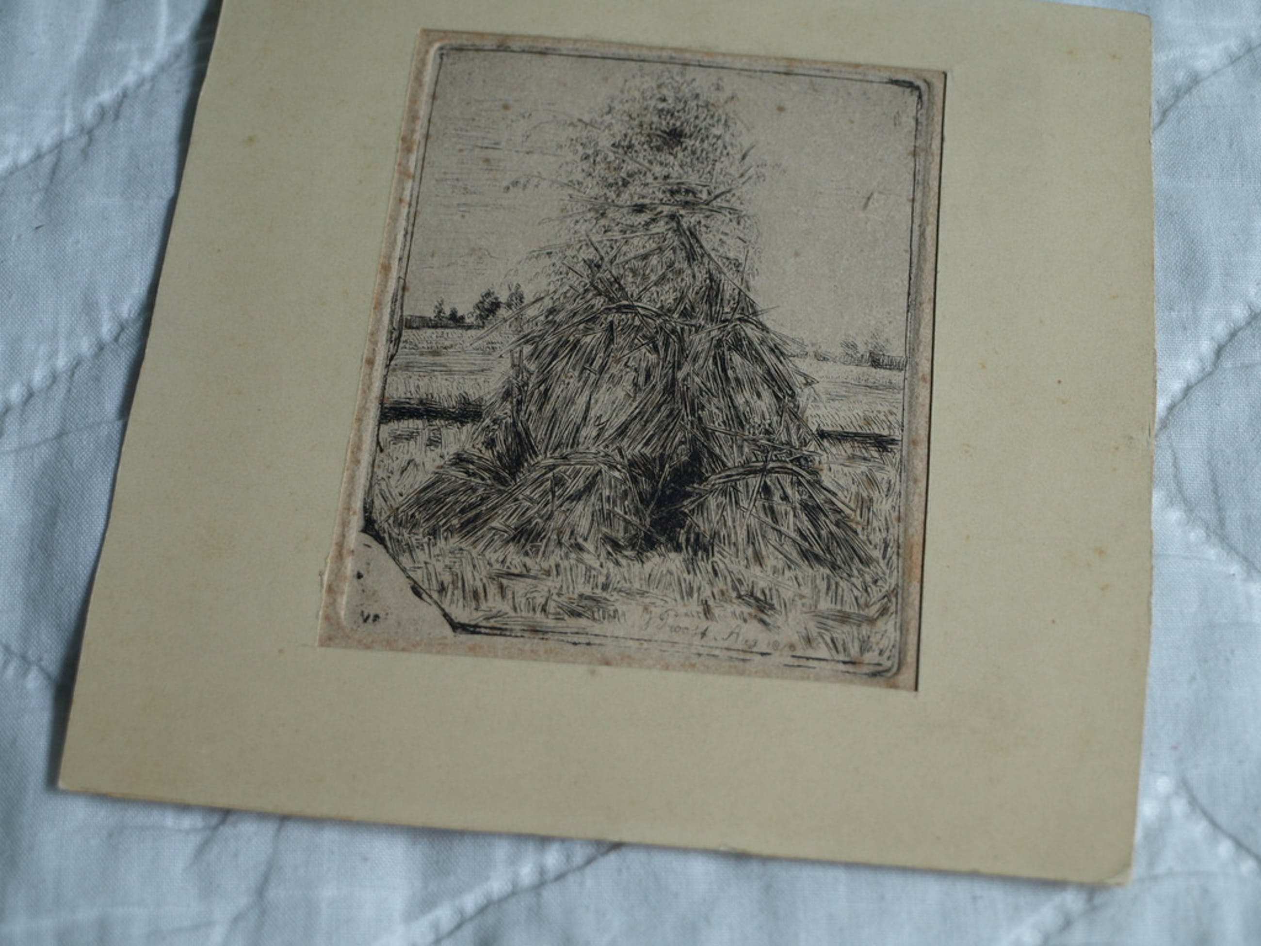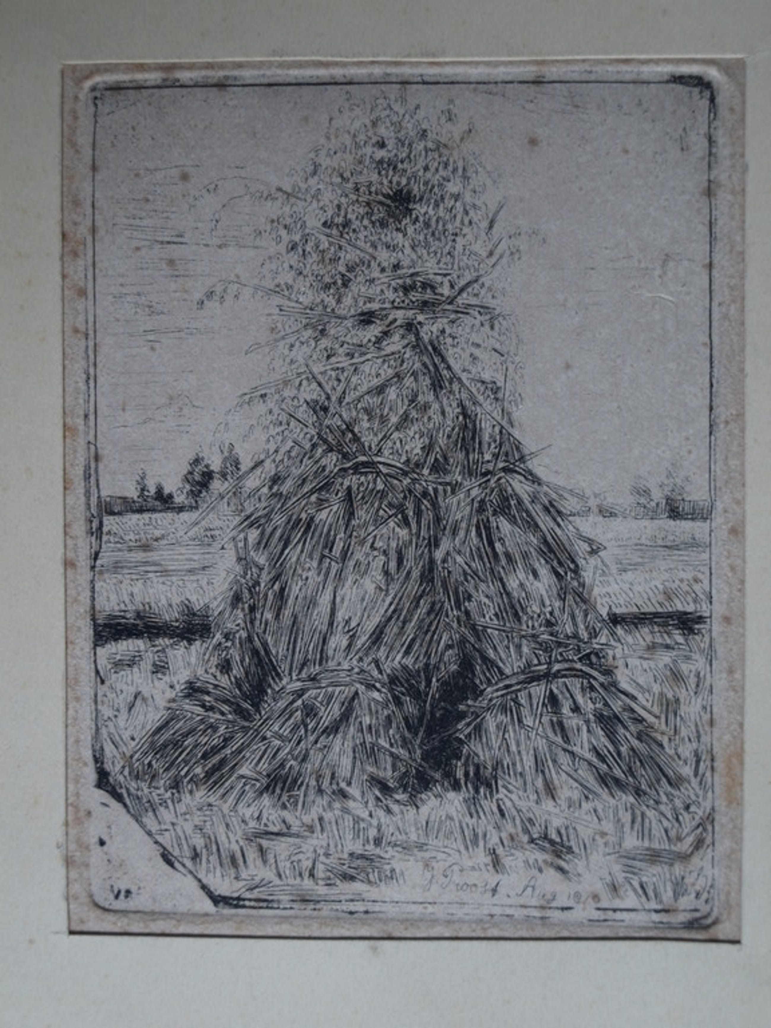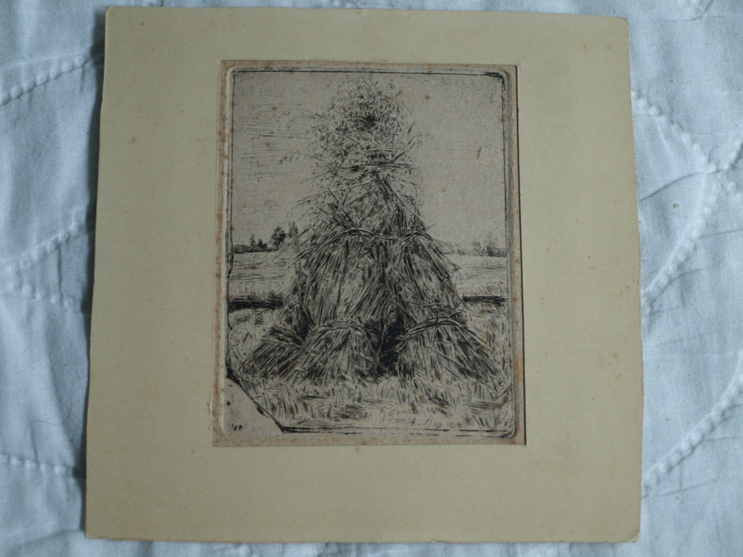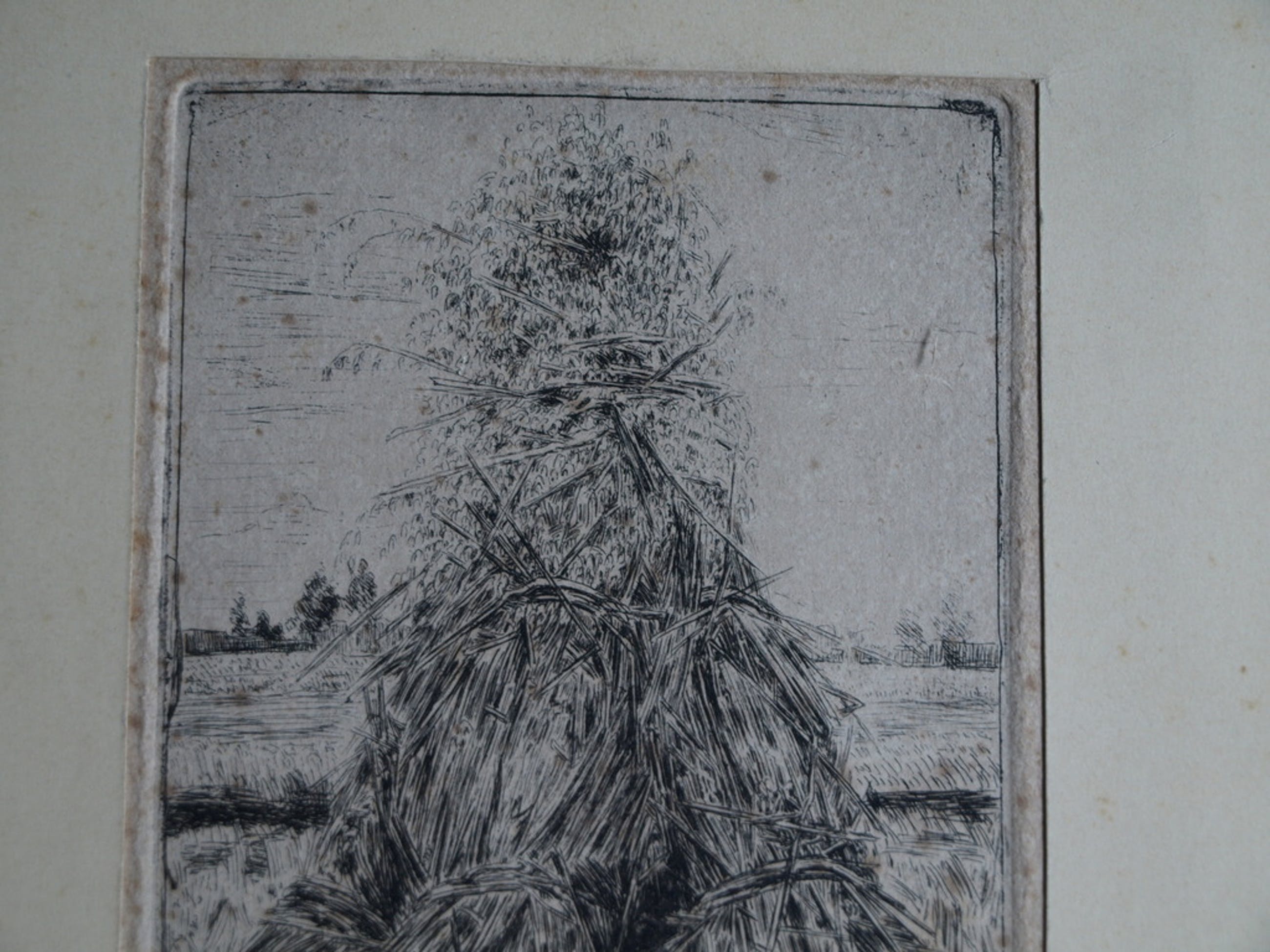 Een ets uit 1910 van een ons onbekende kunstenaar met een voorstelling van een hooiberg.