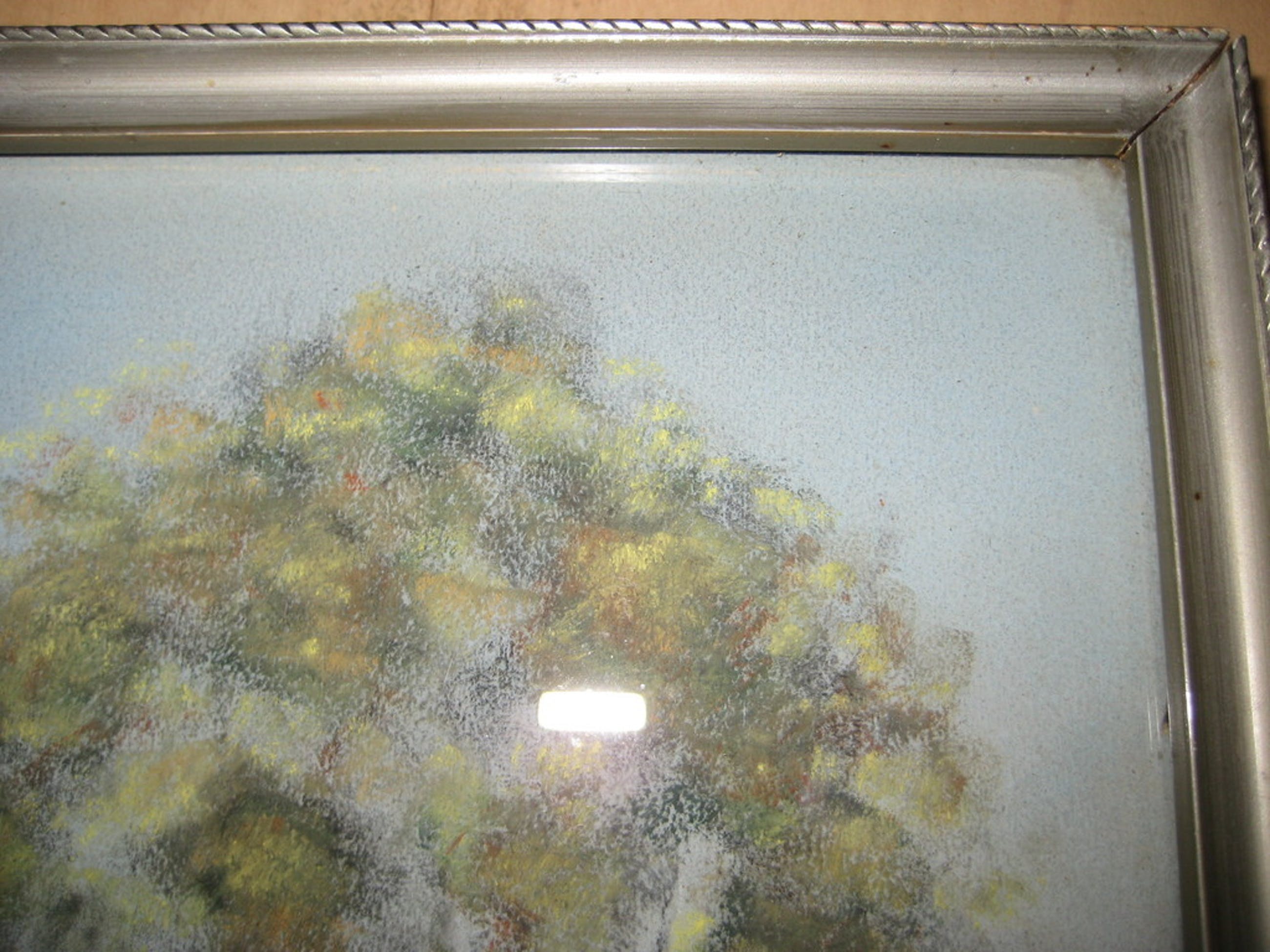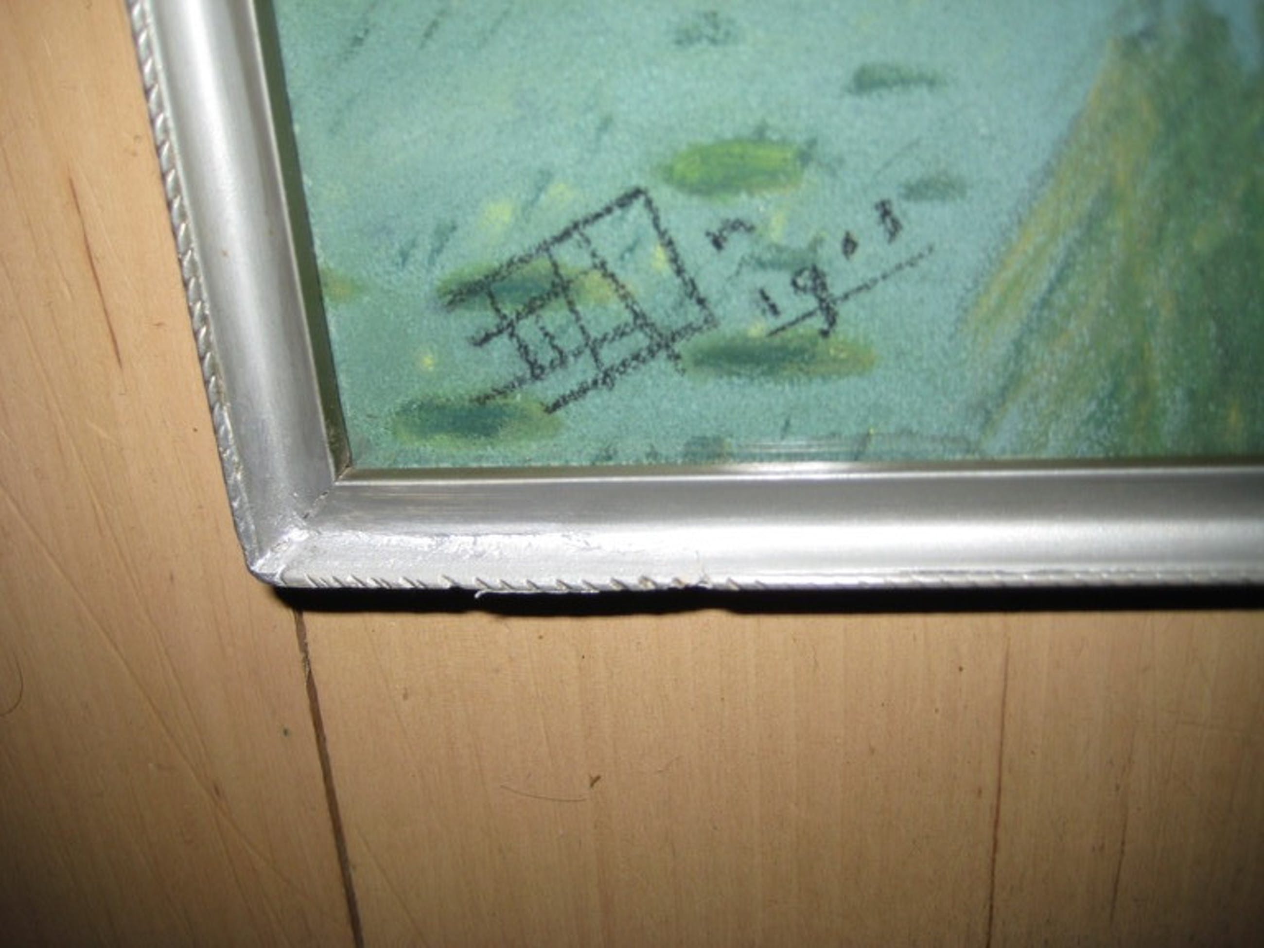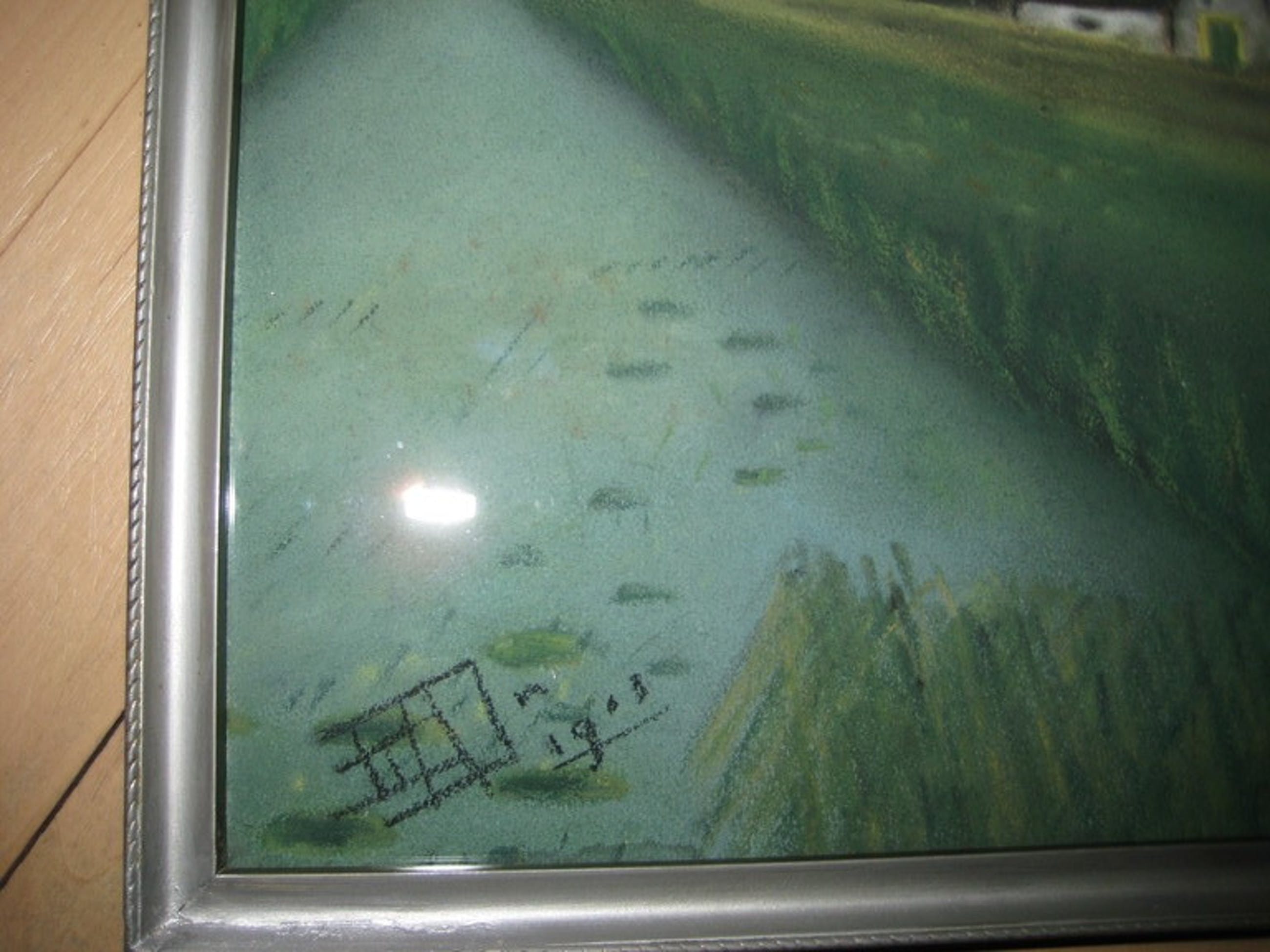 ingelijst achter glas in dun zilverkleurig lijstje.