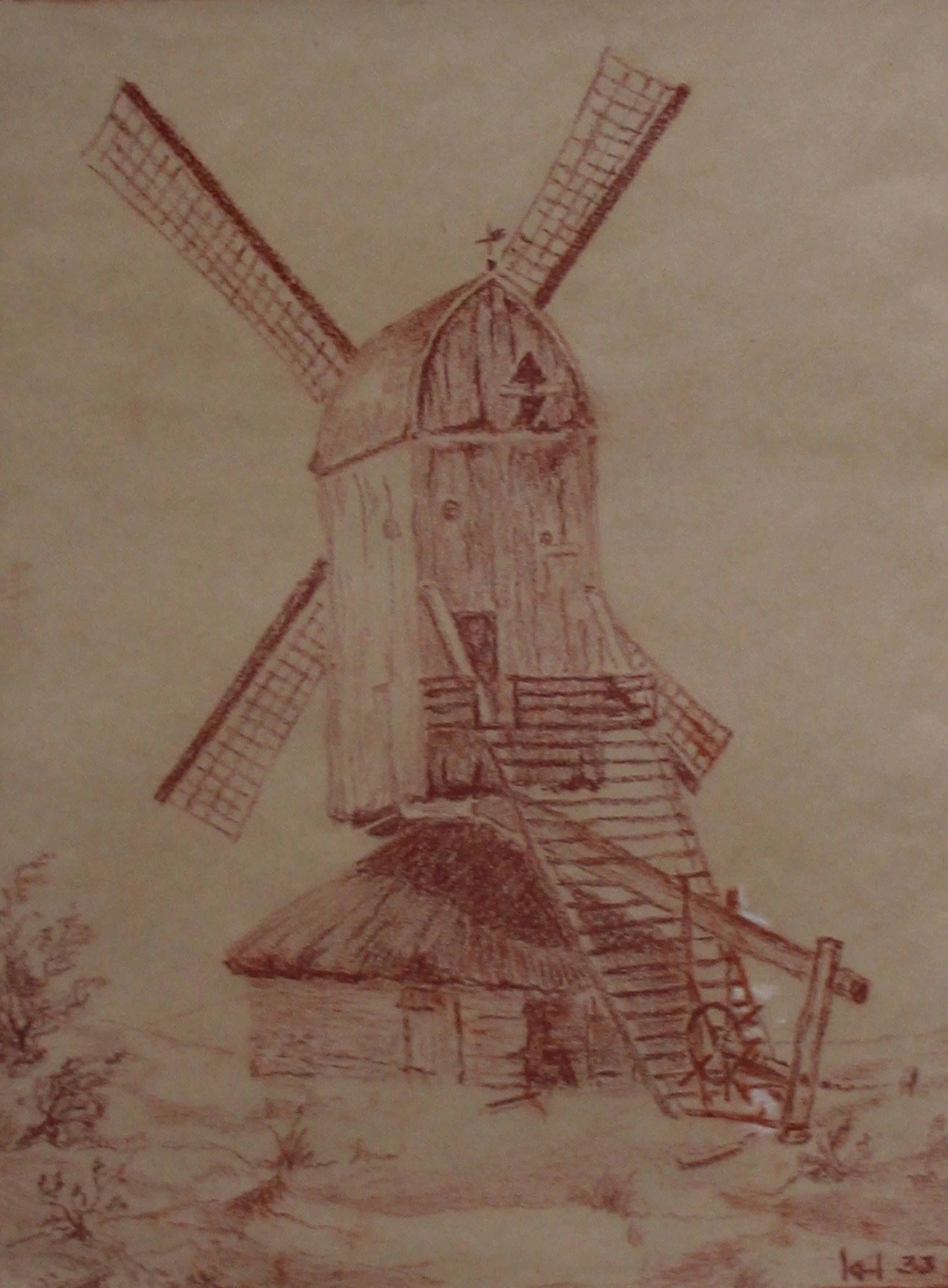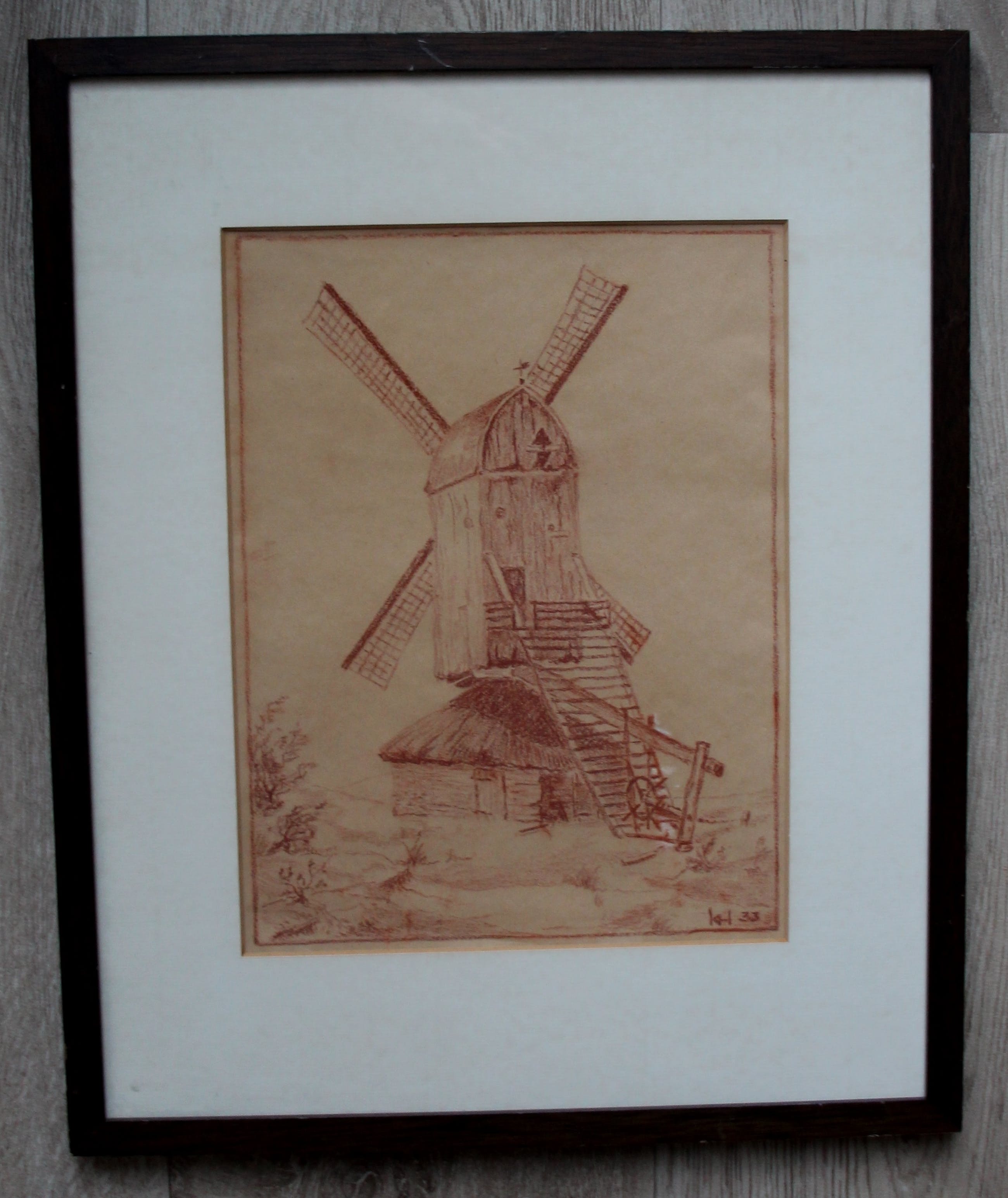 Ingelijste krijttekening van een voor mij onbekende kunstenaar. Molen-1933. Zou u mij een mail willen sturen als als u weet wie het betreft? Afmetingen incl. lijst: H44,5 x b 36,5 cm. Afmetingen voorstelling: H28 x b21 cm. Jaar: 1933. Het werk is linksonder gesigneerd.