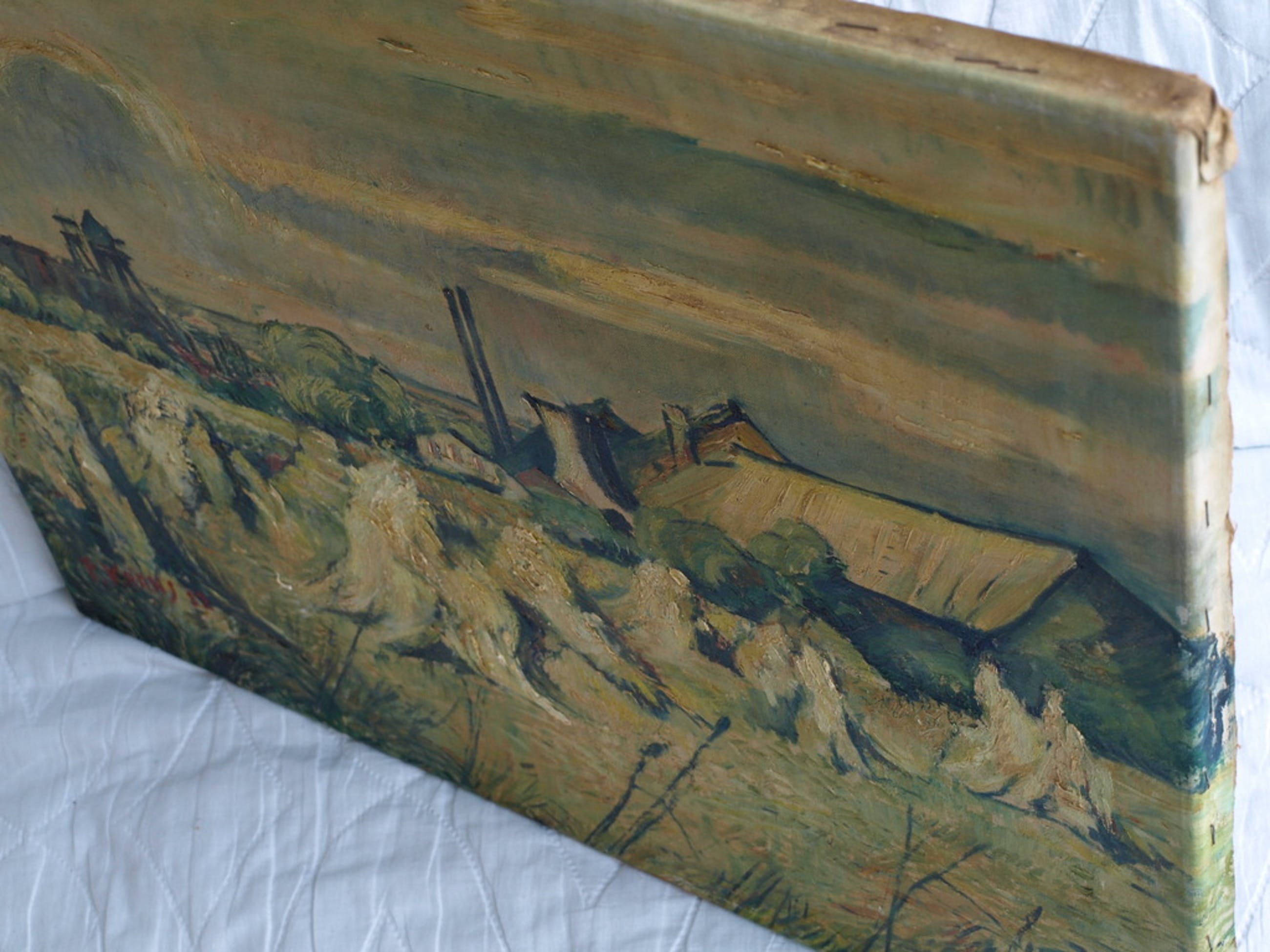 Een schilderij uit 1952 met een voorstelling van een akker met op de achtergrond een boerderij.