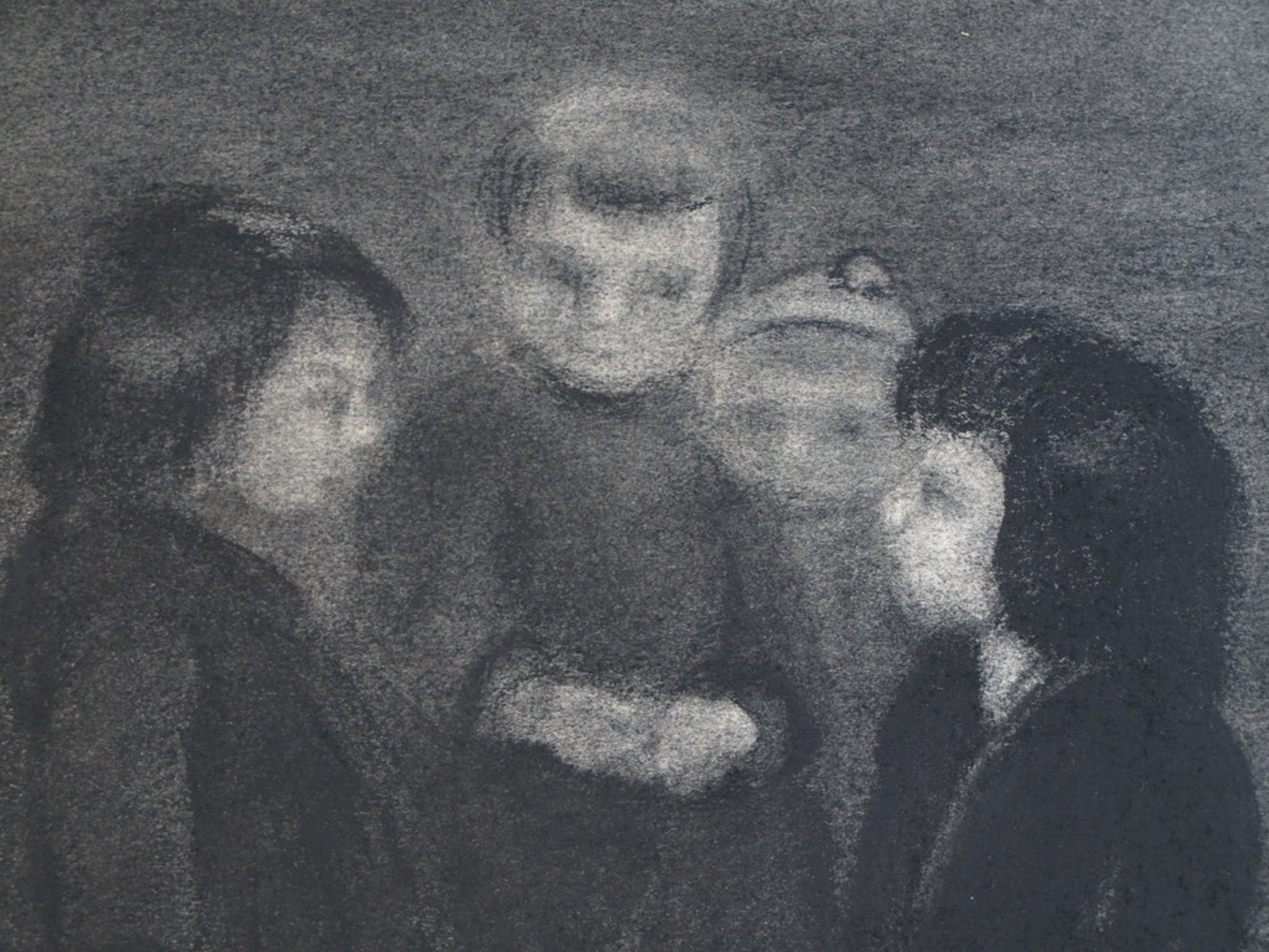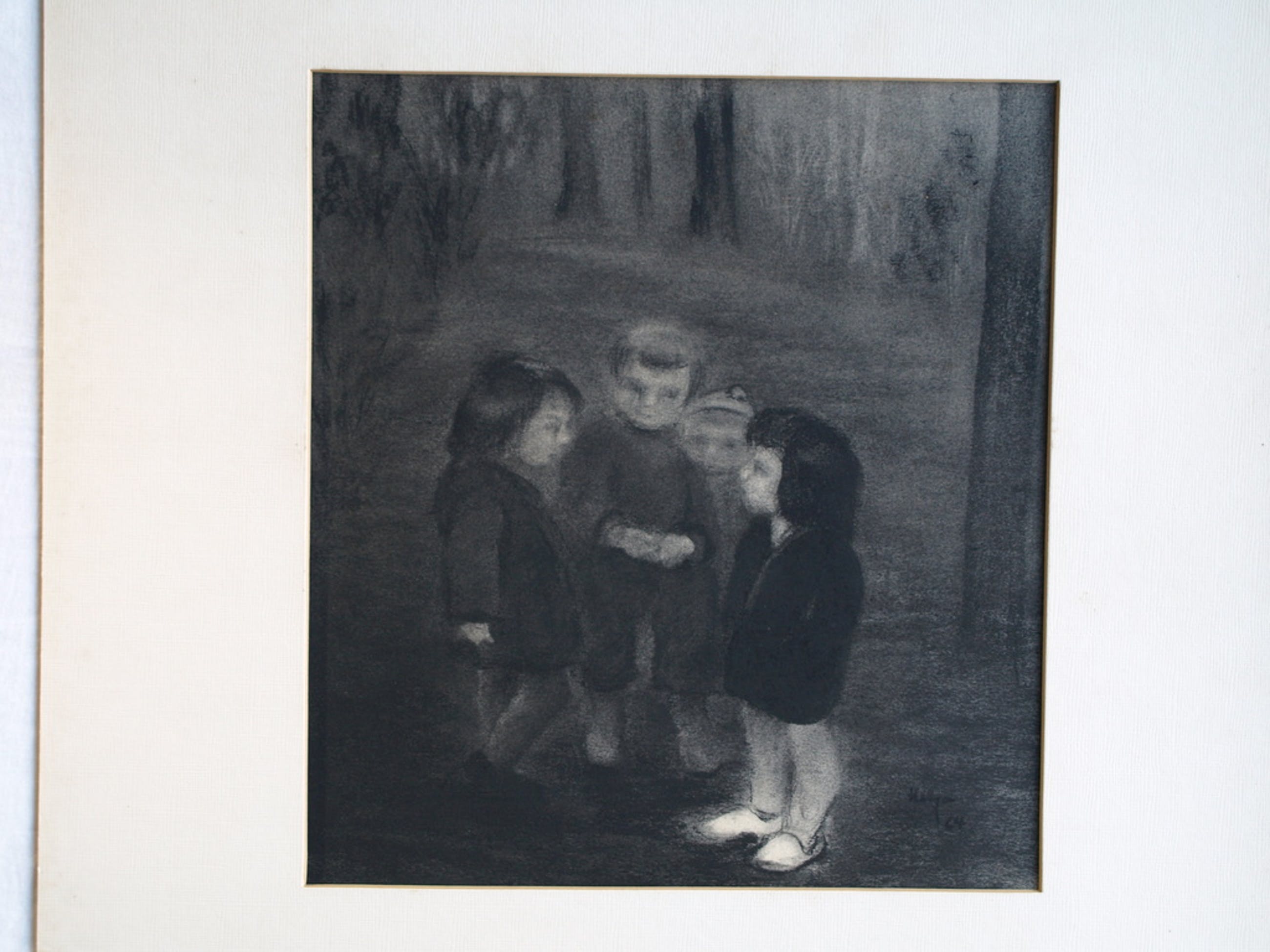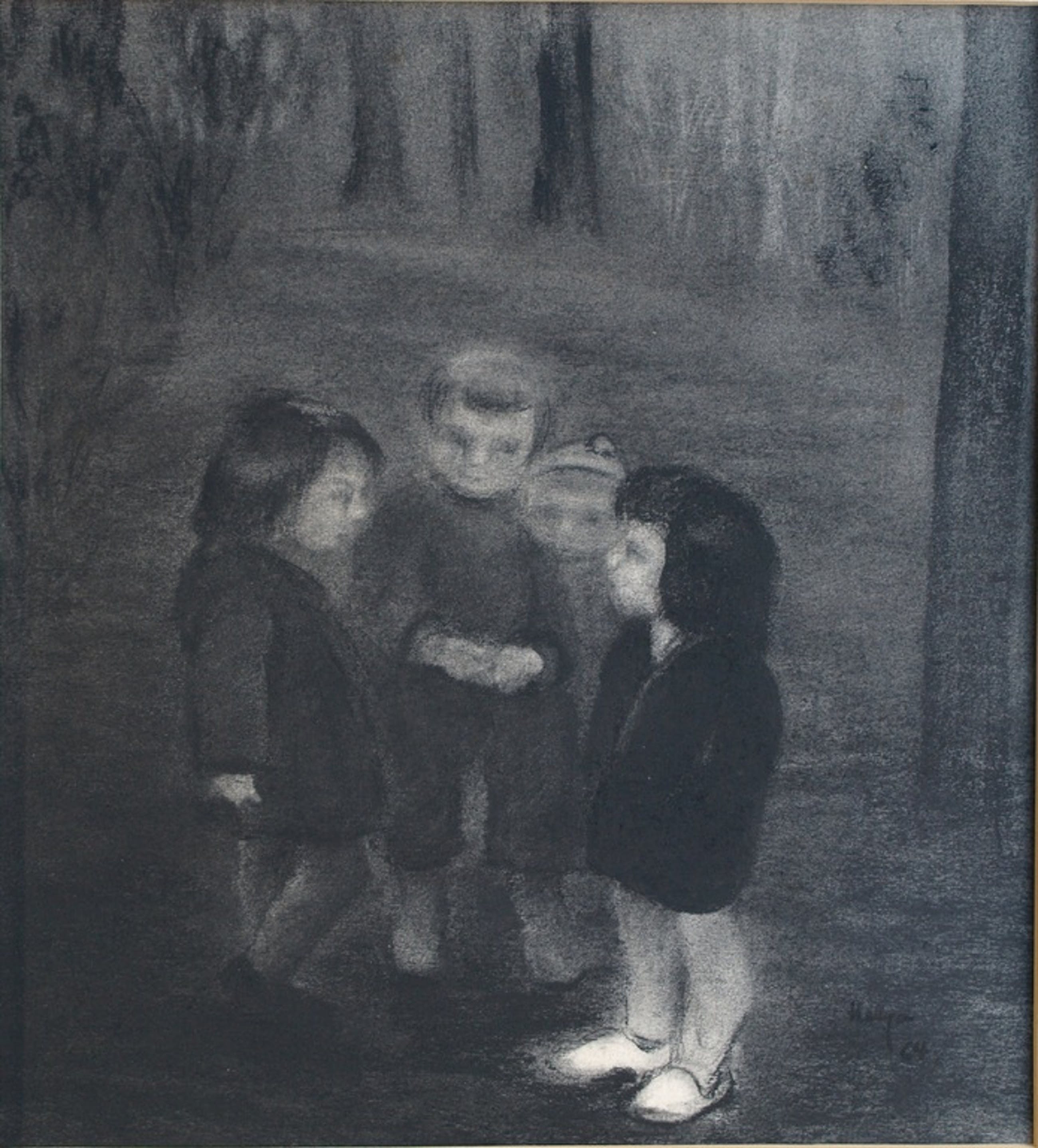 Een sfeervolle tekening uit 1964 van 4 jonge kinderen in een donker bos.
