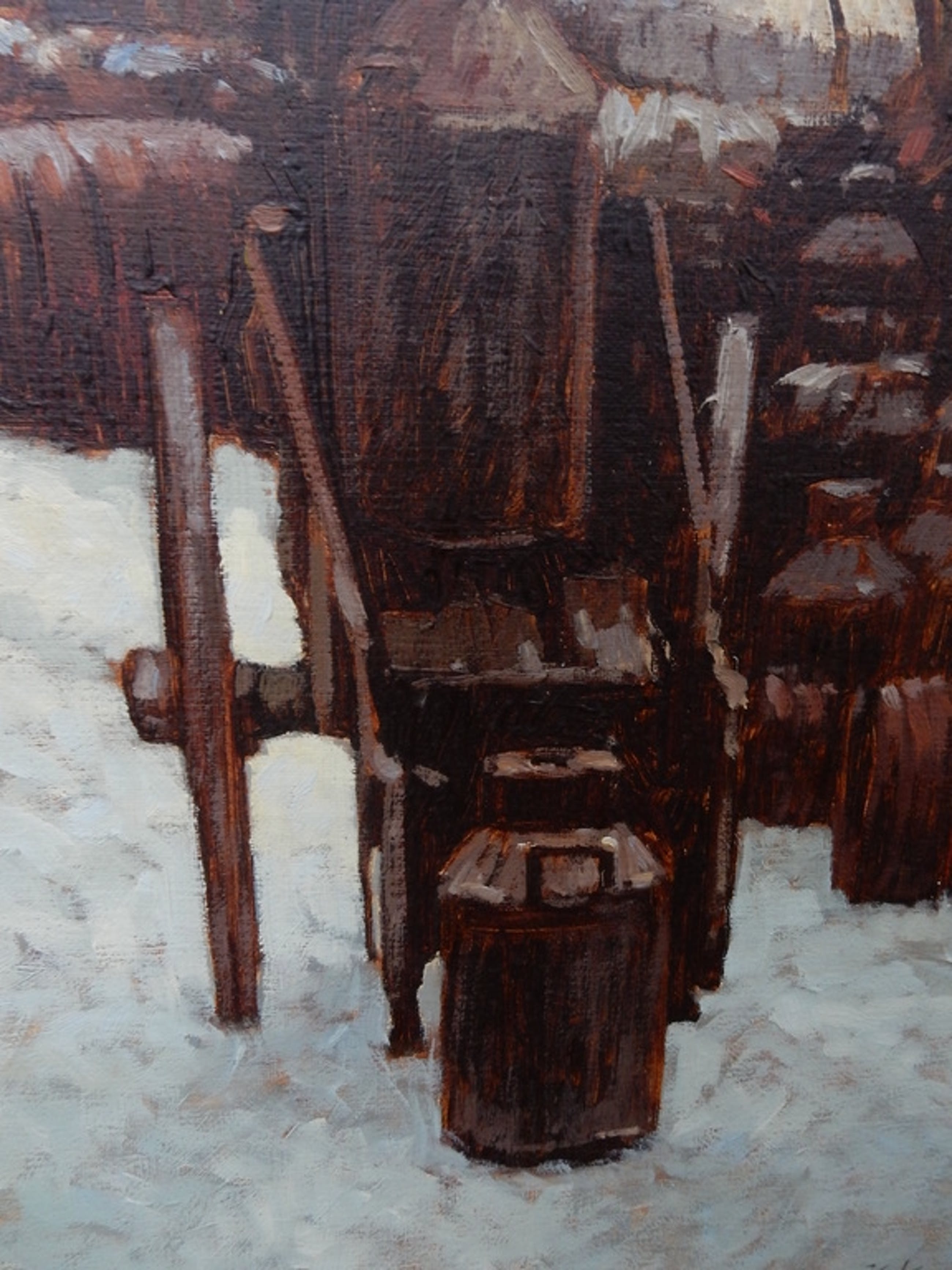 J.Schijvens '83, winters tafereel, vaten op de kade