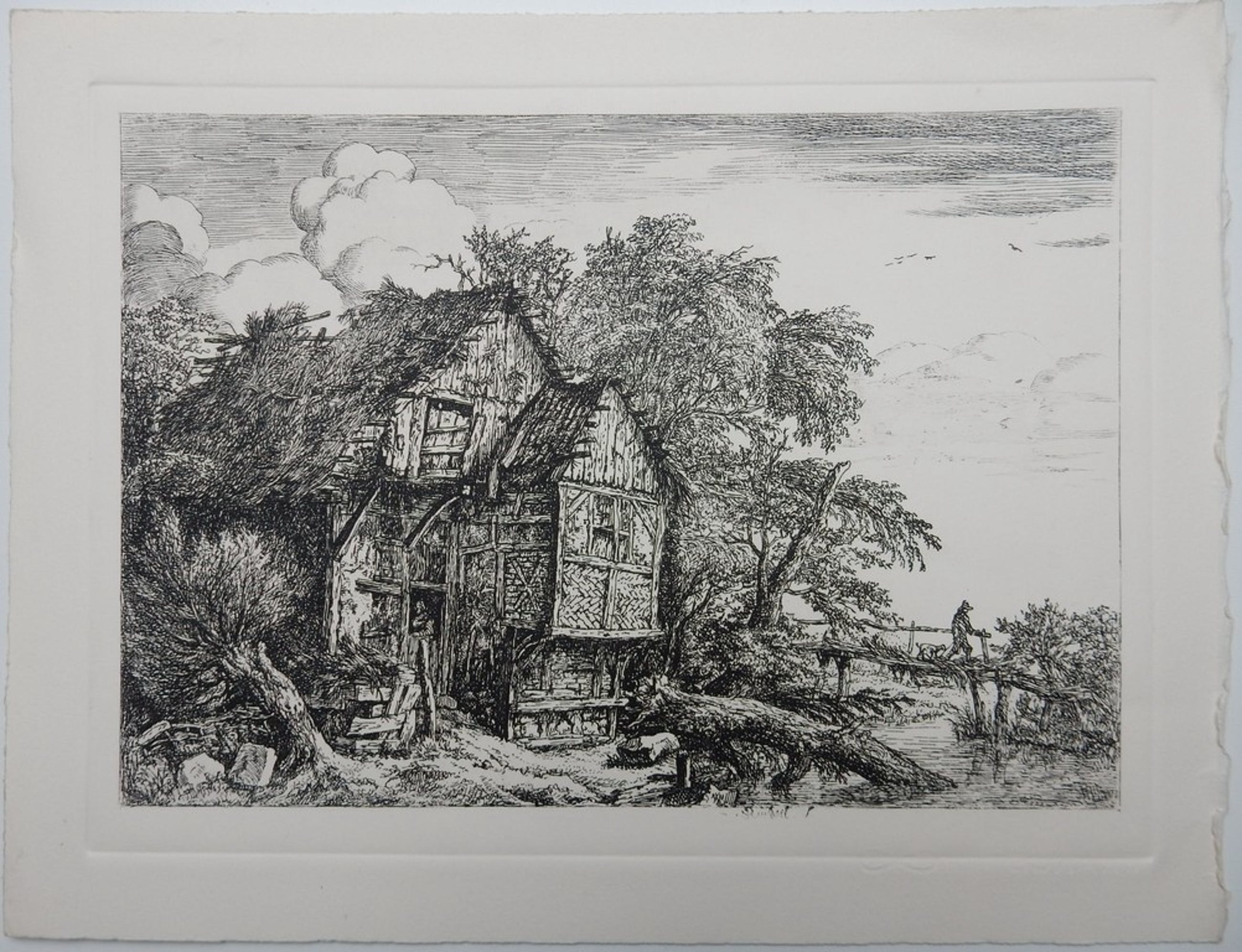 Mooie oude gravure met een voorstelling van een vervallen woonhuis naast een rivier.