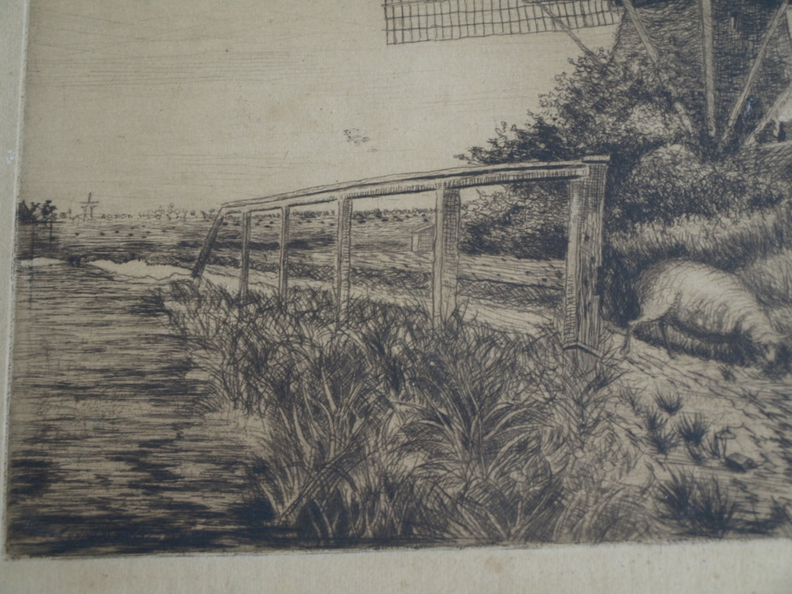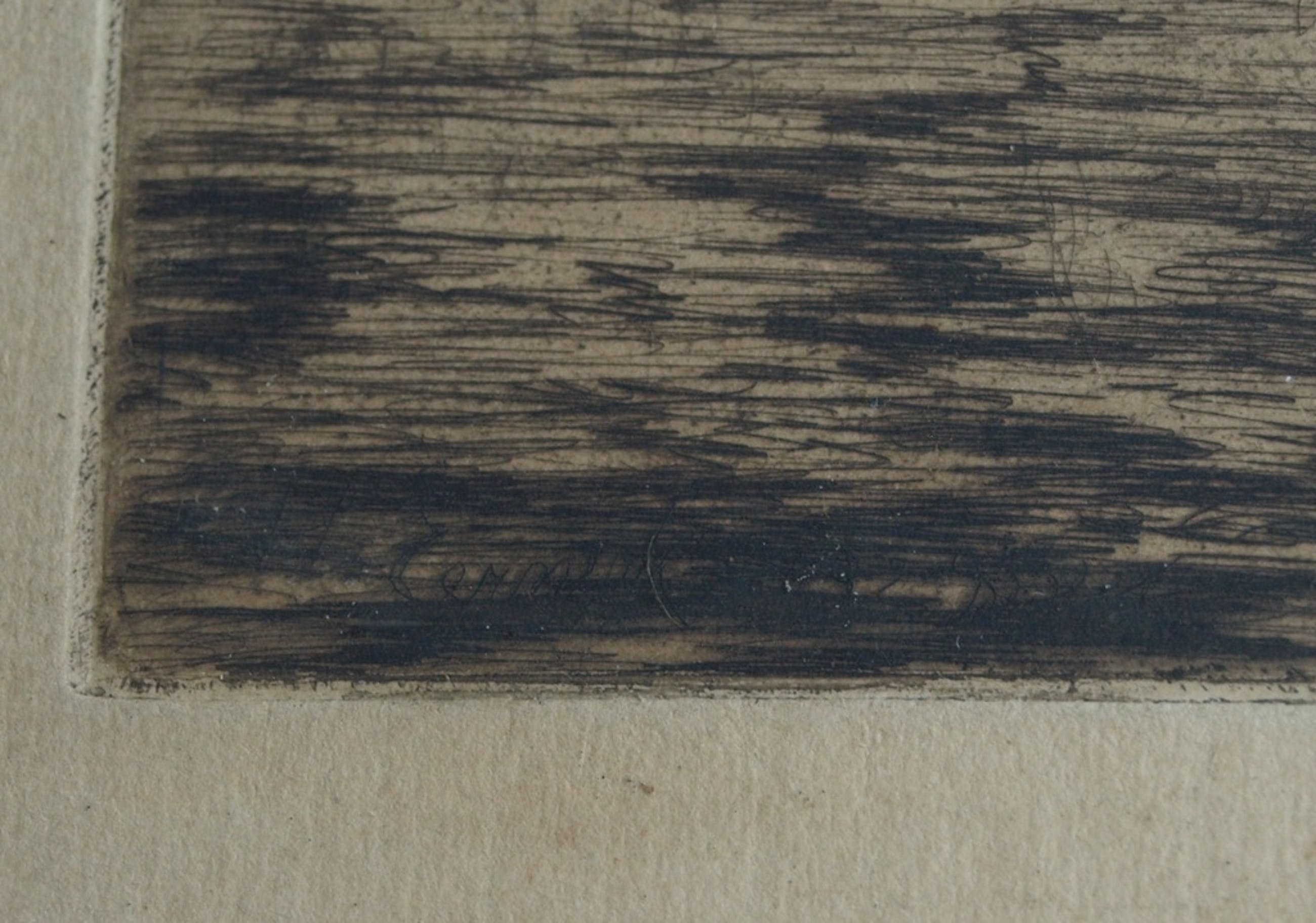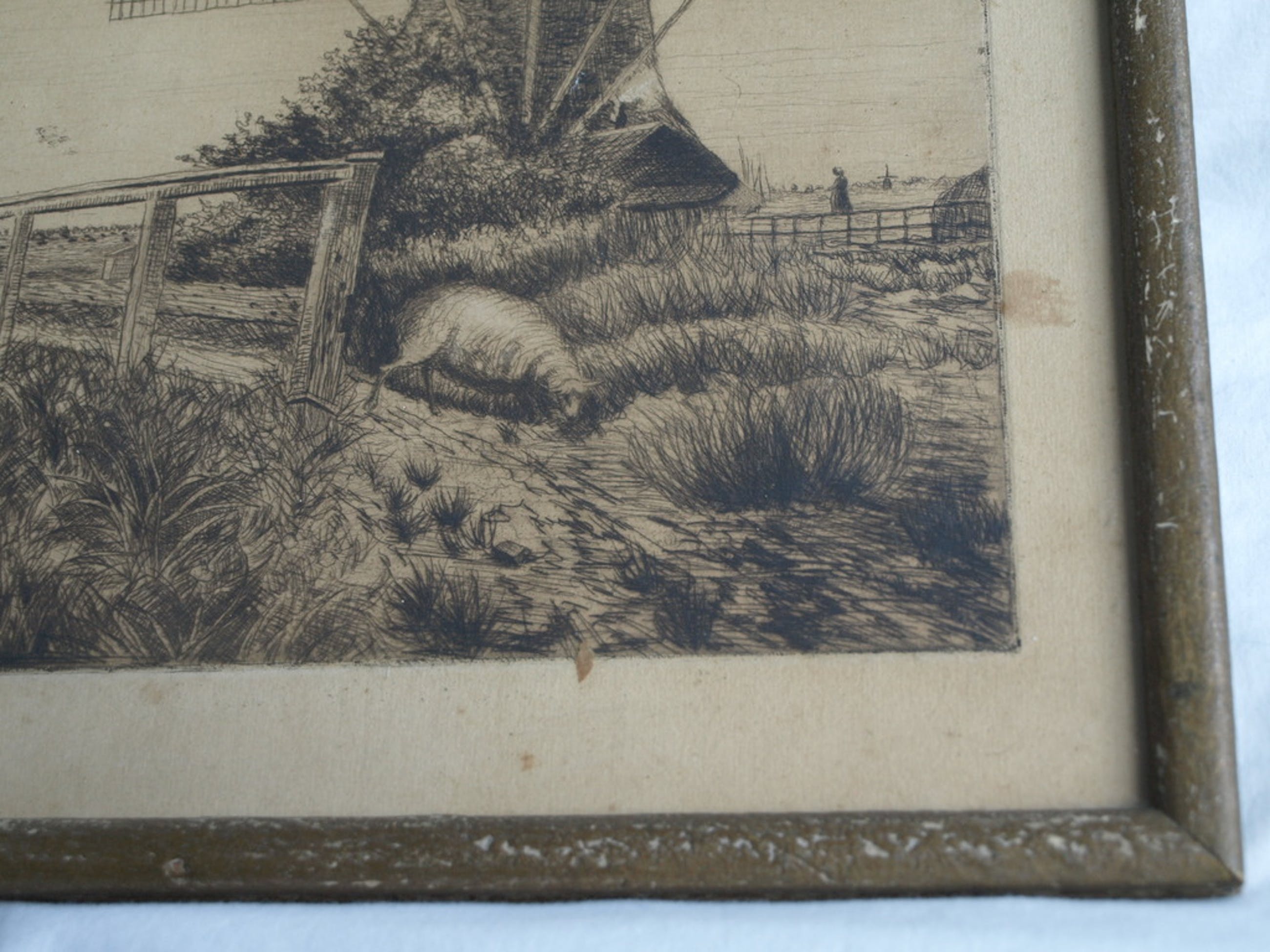 Conditie: Het papier is ‘vergeeld’ en er zit een los stukje papier (niet van de ets) achter het glas rechtsonder, zie de 5e foto.