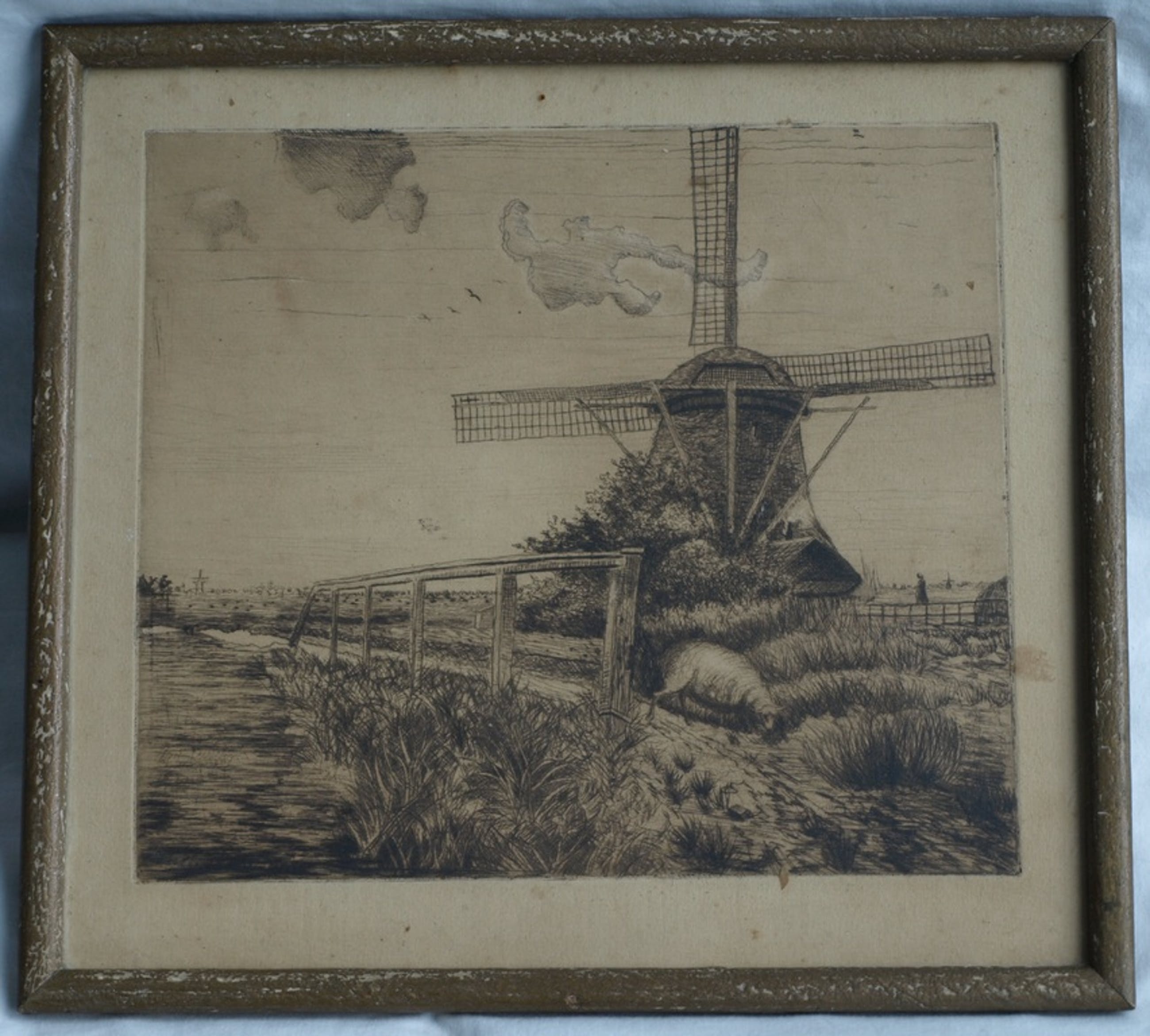 -Conditie: Het papier is ‘vergeeld’ en er zit een los stukje papier (niet van de ets) achter het glas rechtsonder, zie de 5e foto.