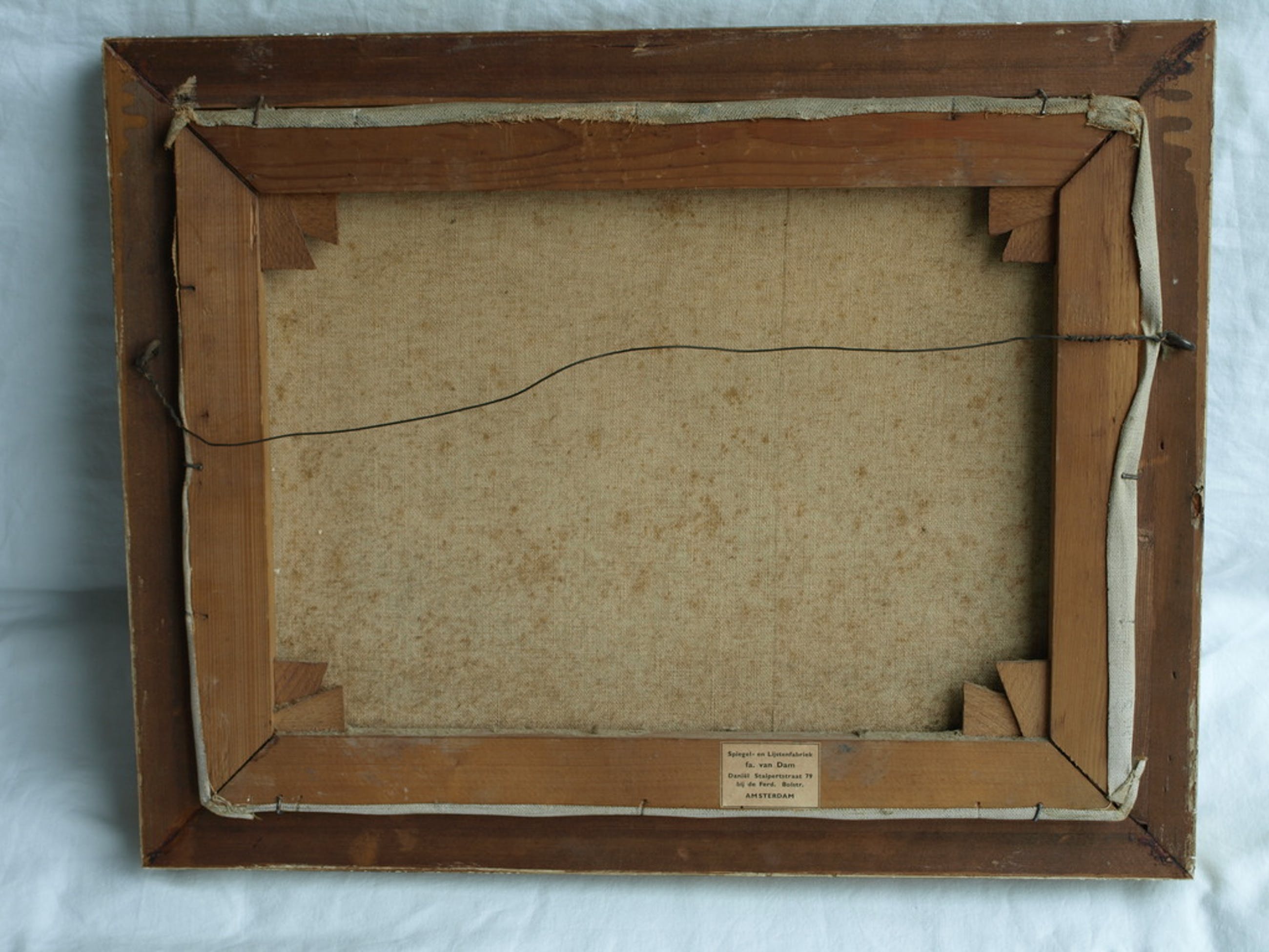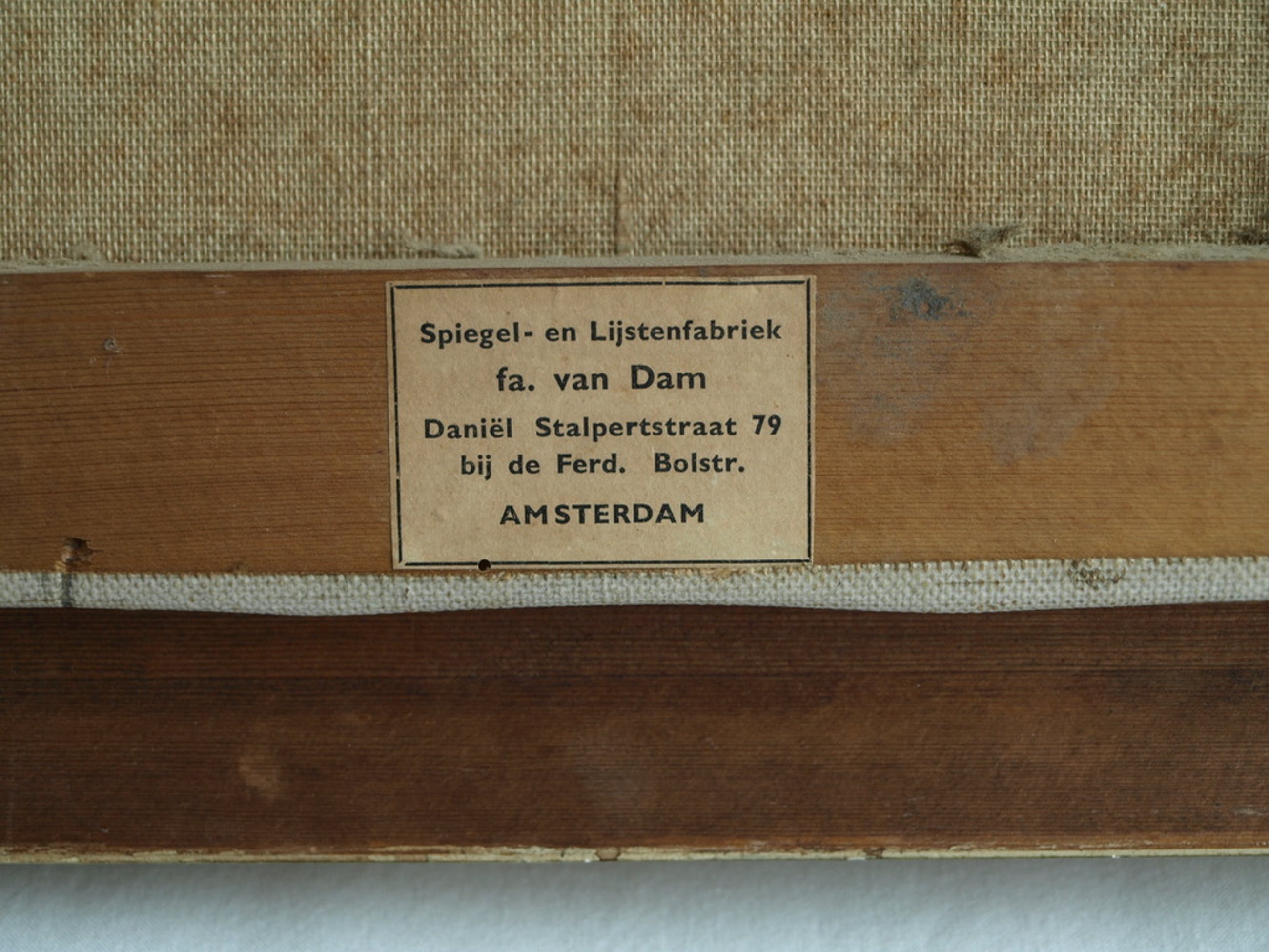 -Ingelijst in de originele houten lijst. Ingelijst door fa. van Dam, Amsterdam.