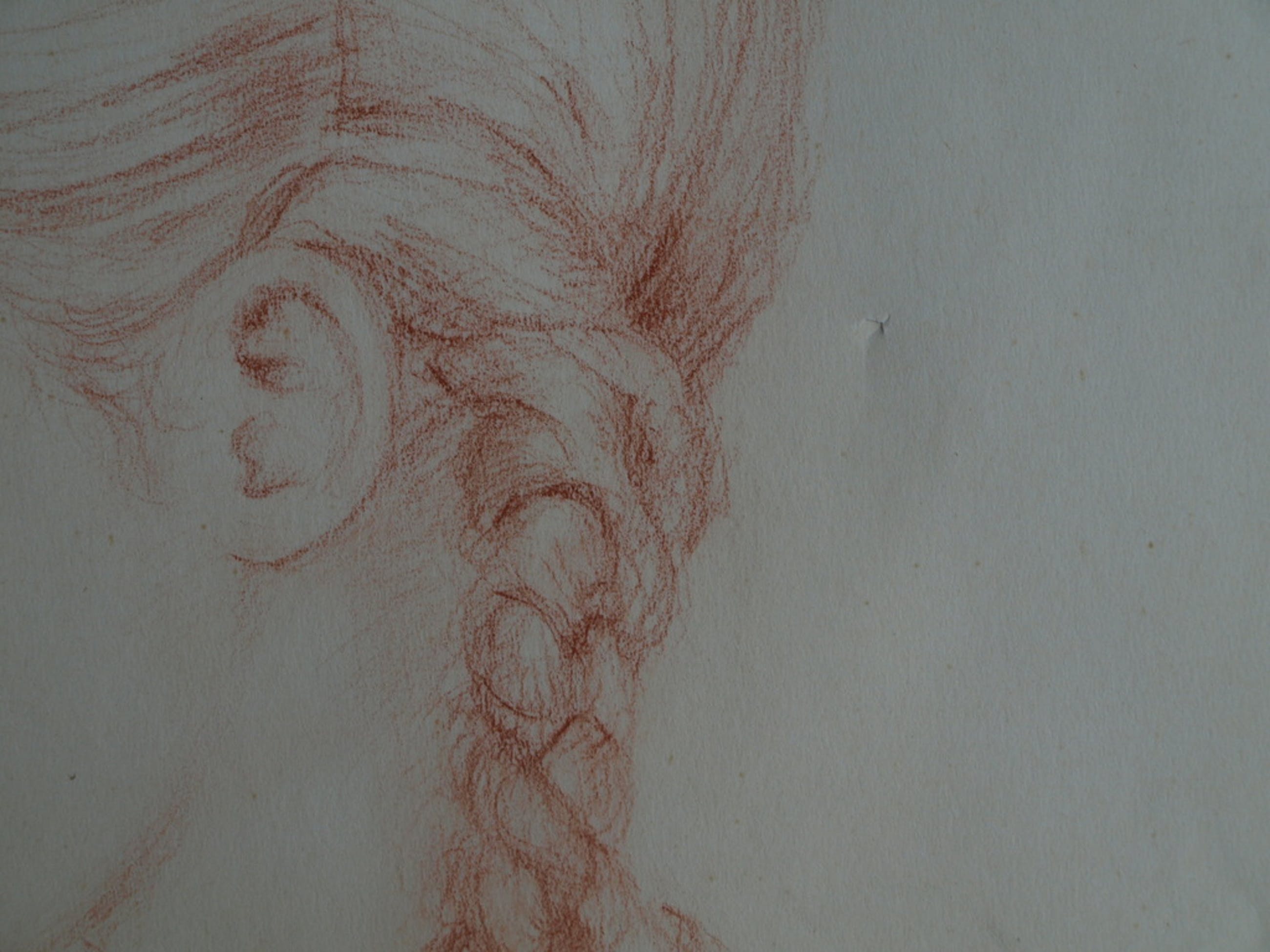 Conditie: Het blad heeft kreuk en heeft linksonder, buiten beeld, een vochtvlek. Ook is het papier ‘vergeeld’ en zit er een klein gaatje in het papier (rechts van de haarvlecht).