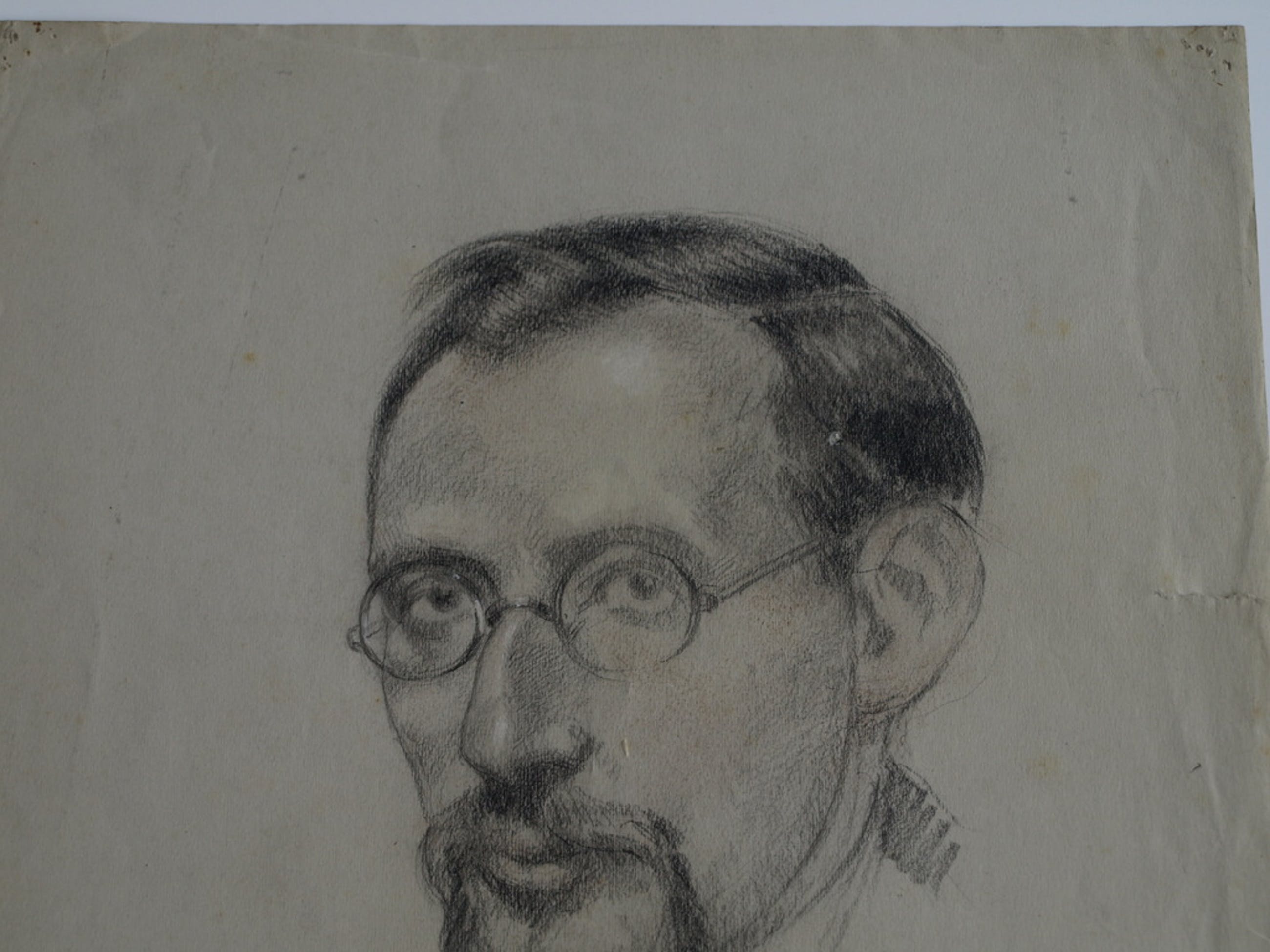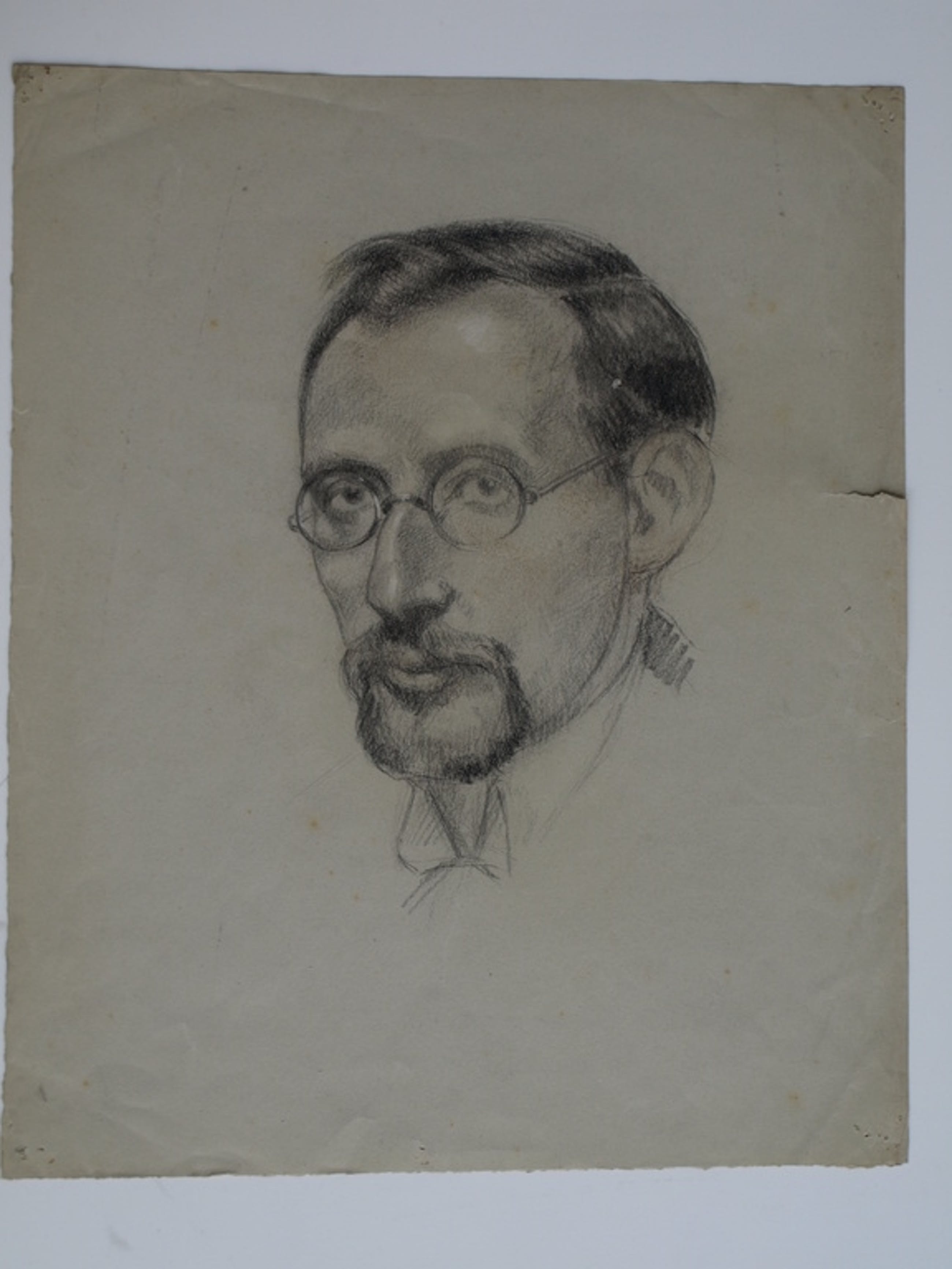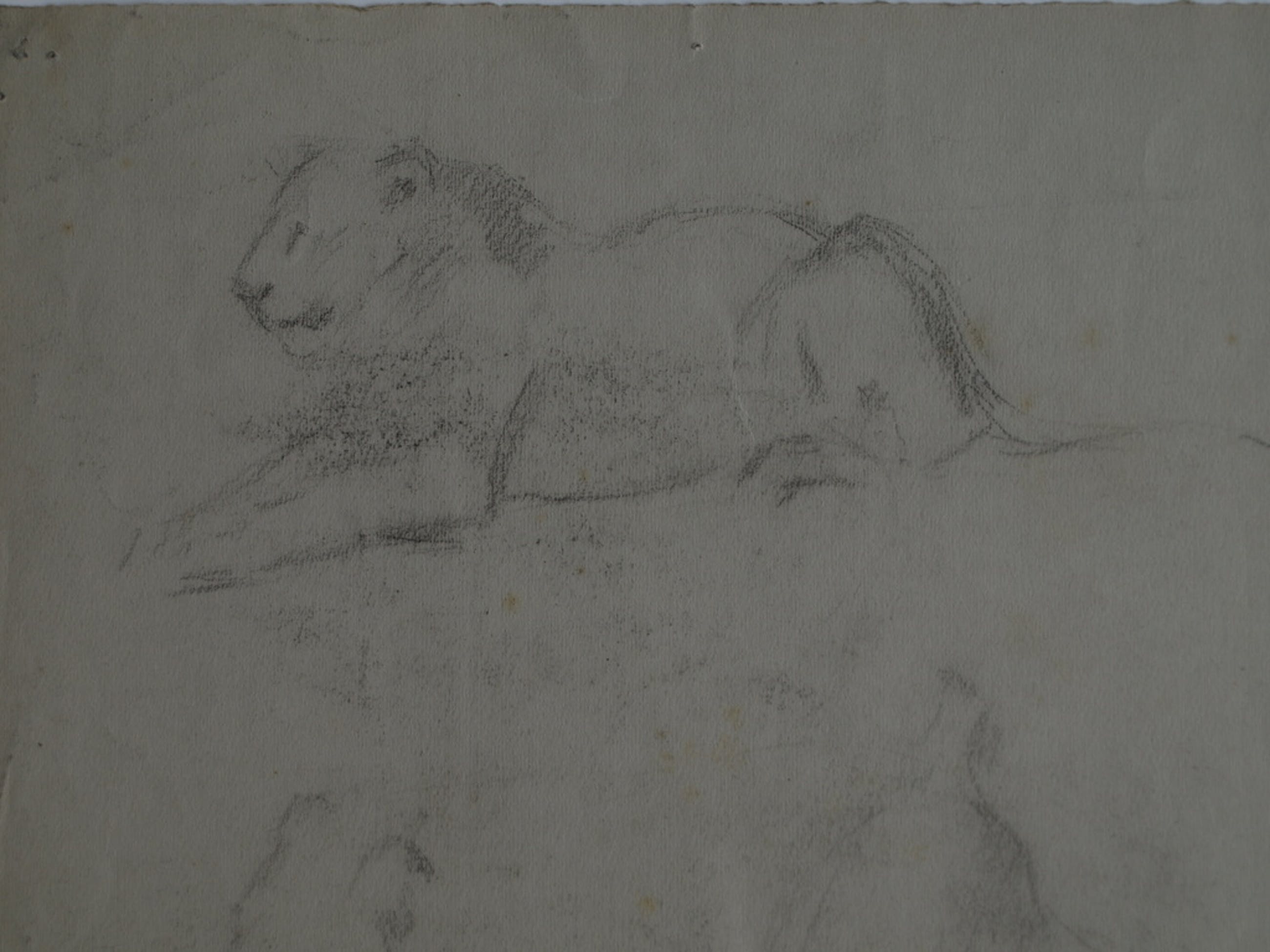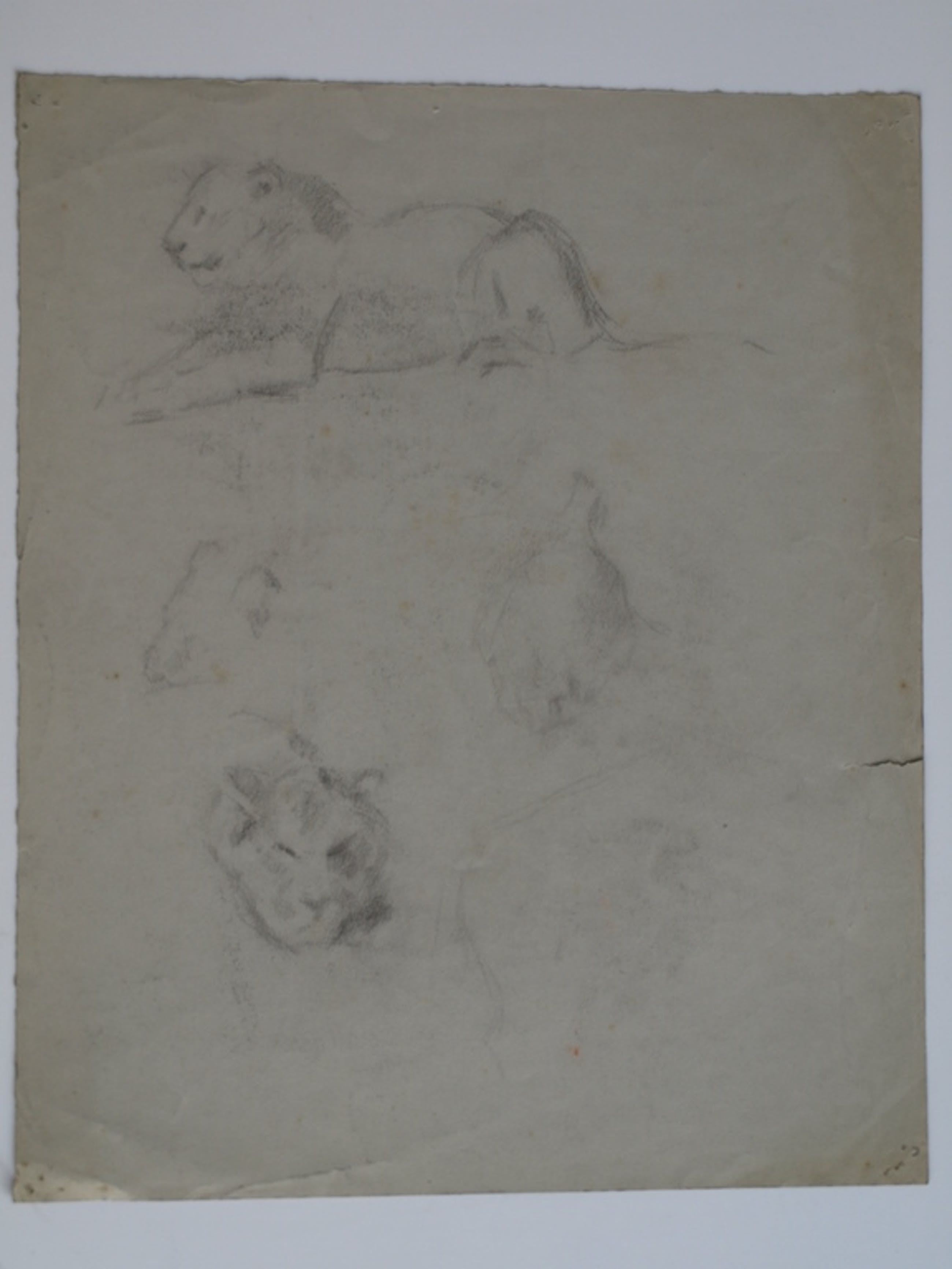 -Een portrettekening van een man met bril en op de achterkant van het papier 2 schetsen van een leeuw.