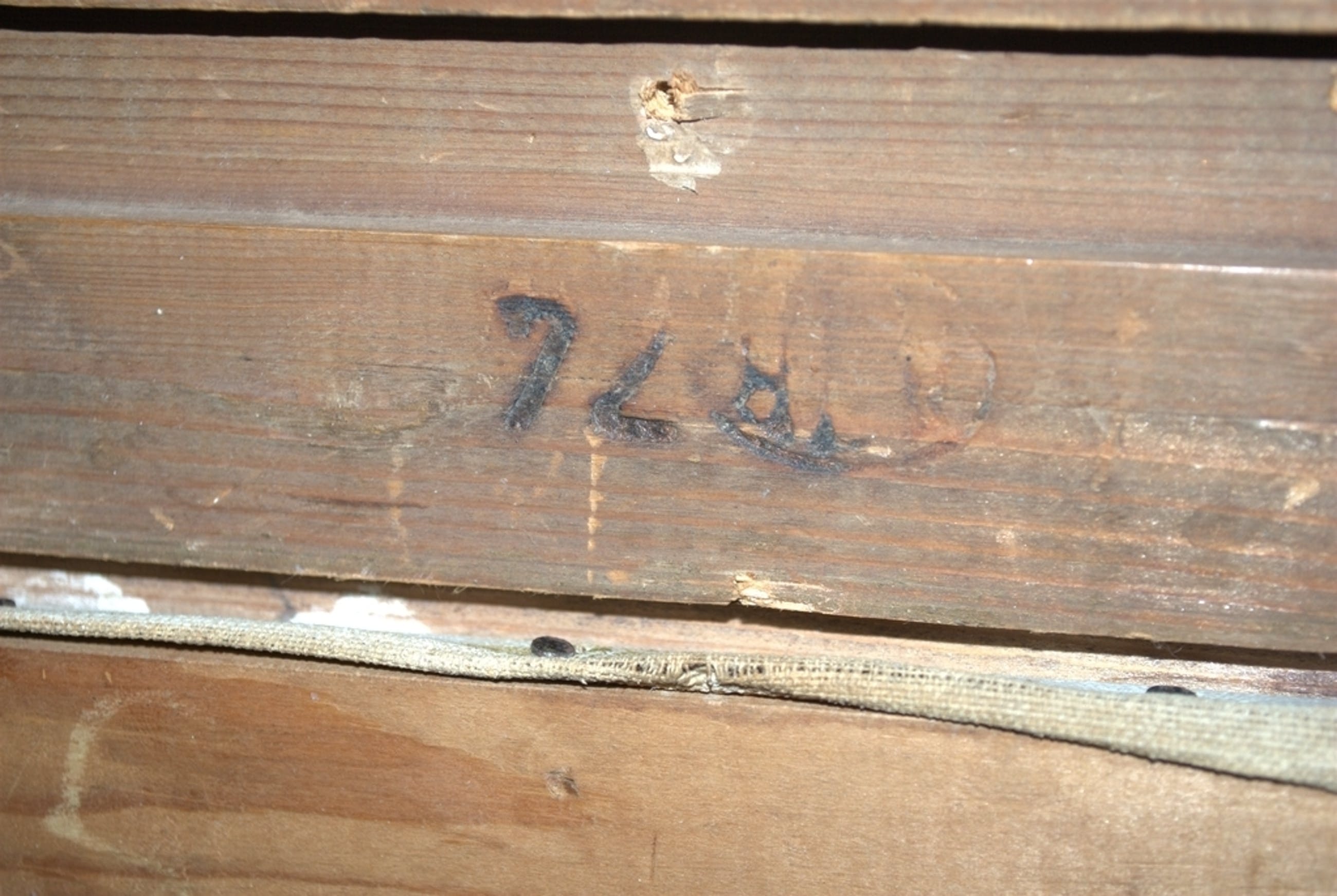 De gipsen lijst is in redelijk goede staat, heeft enige schade m.n. de linker onderhoek en de bovenrand links.