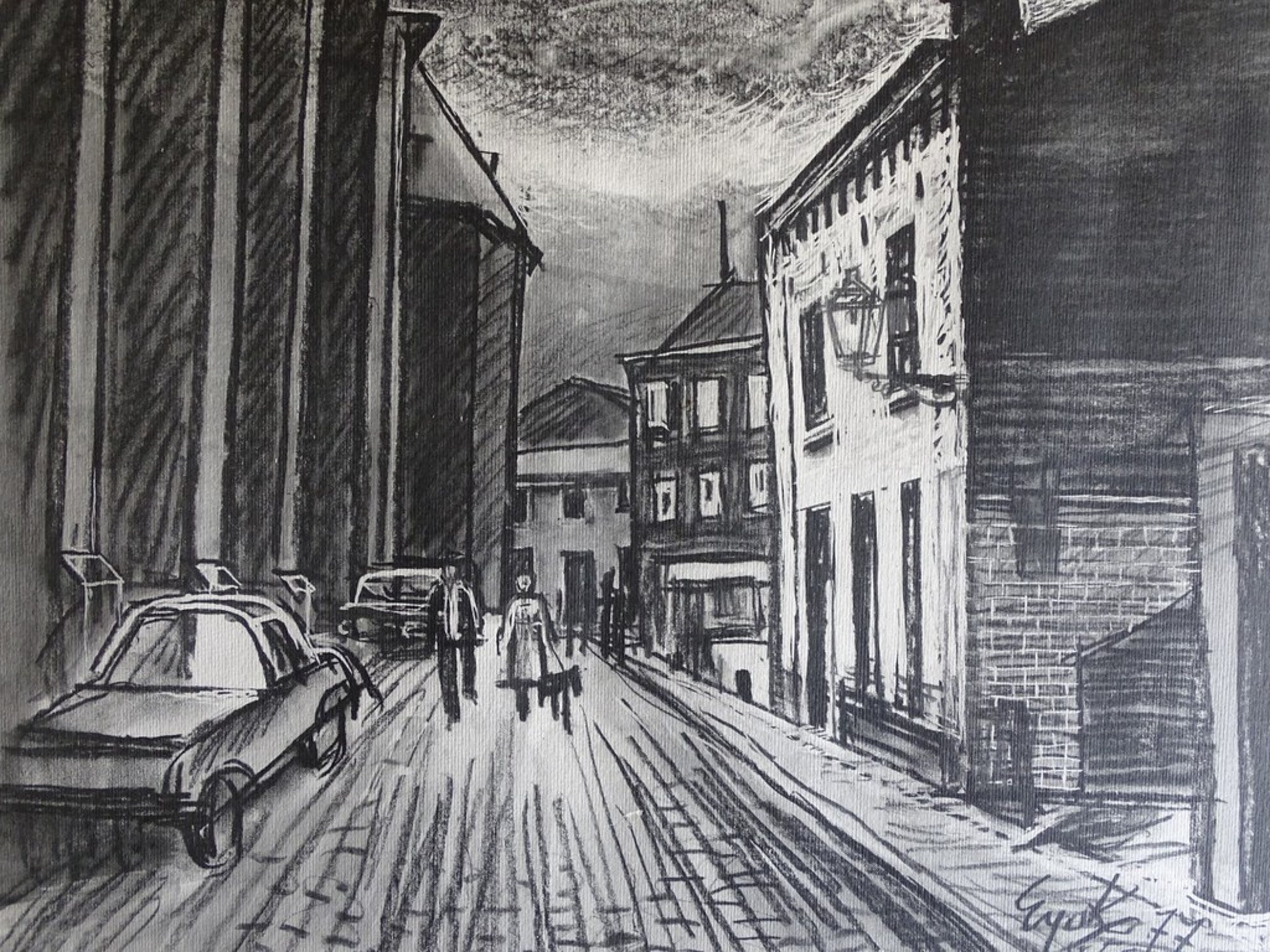 Litho van een straatbeeld met personen en
