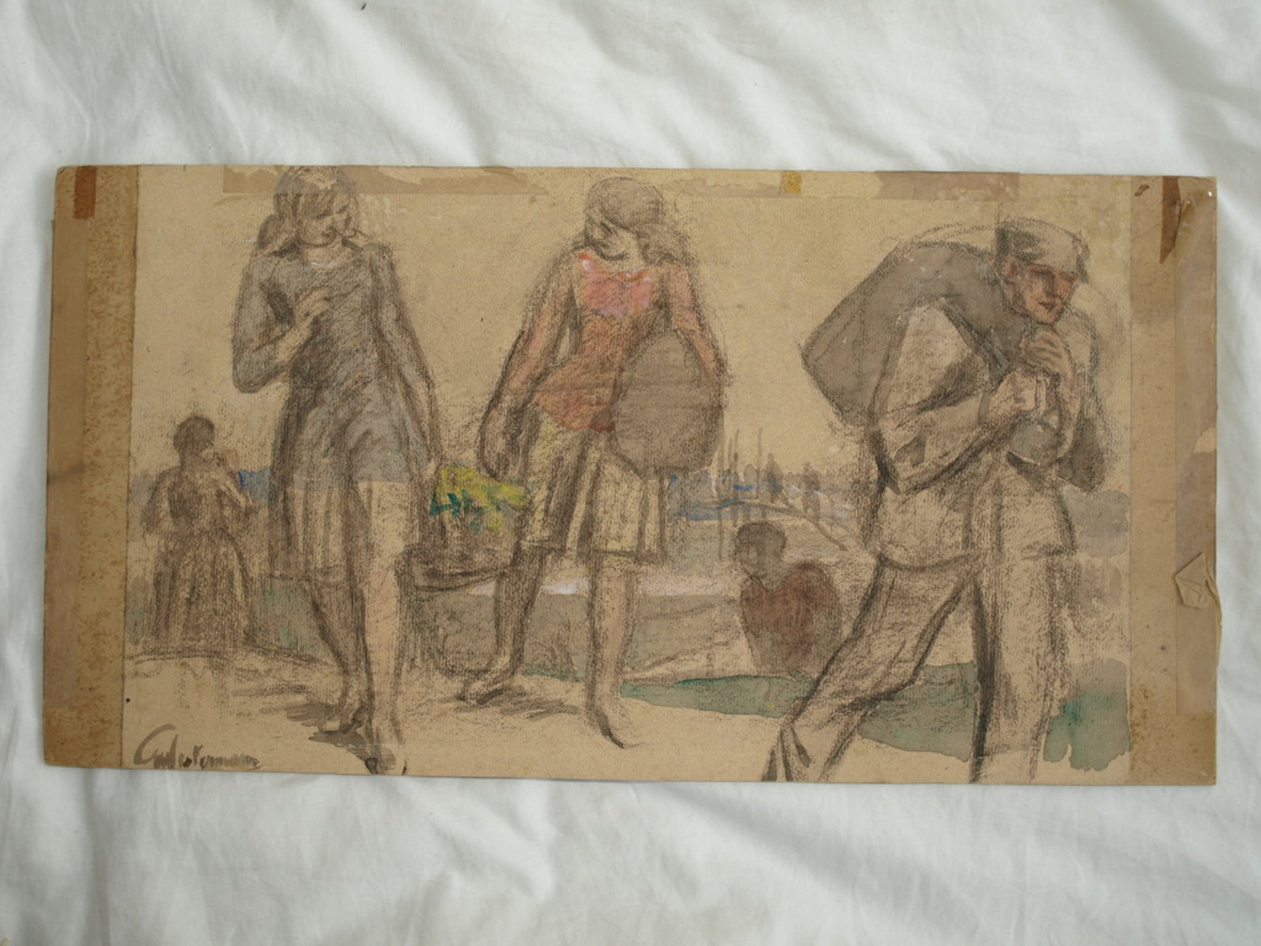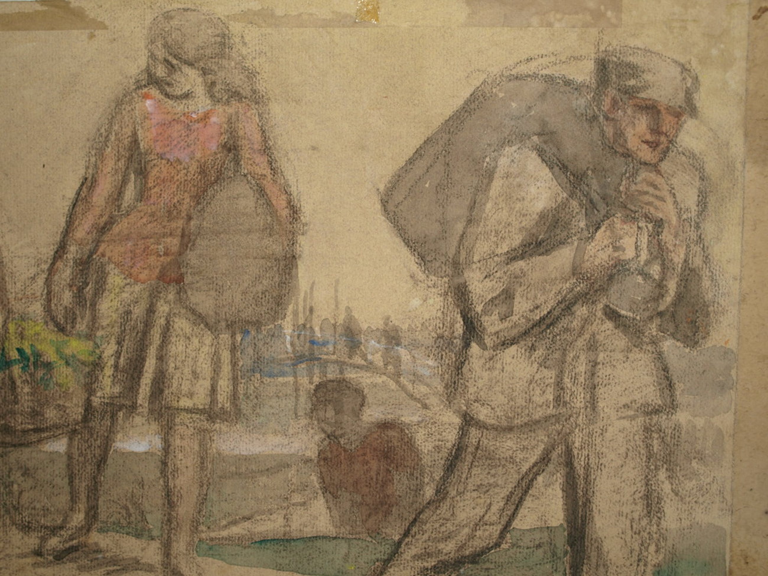 2) Aquarel / (studie)tekening van meisjes en een arbeider.